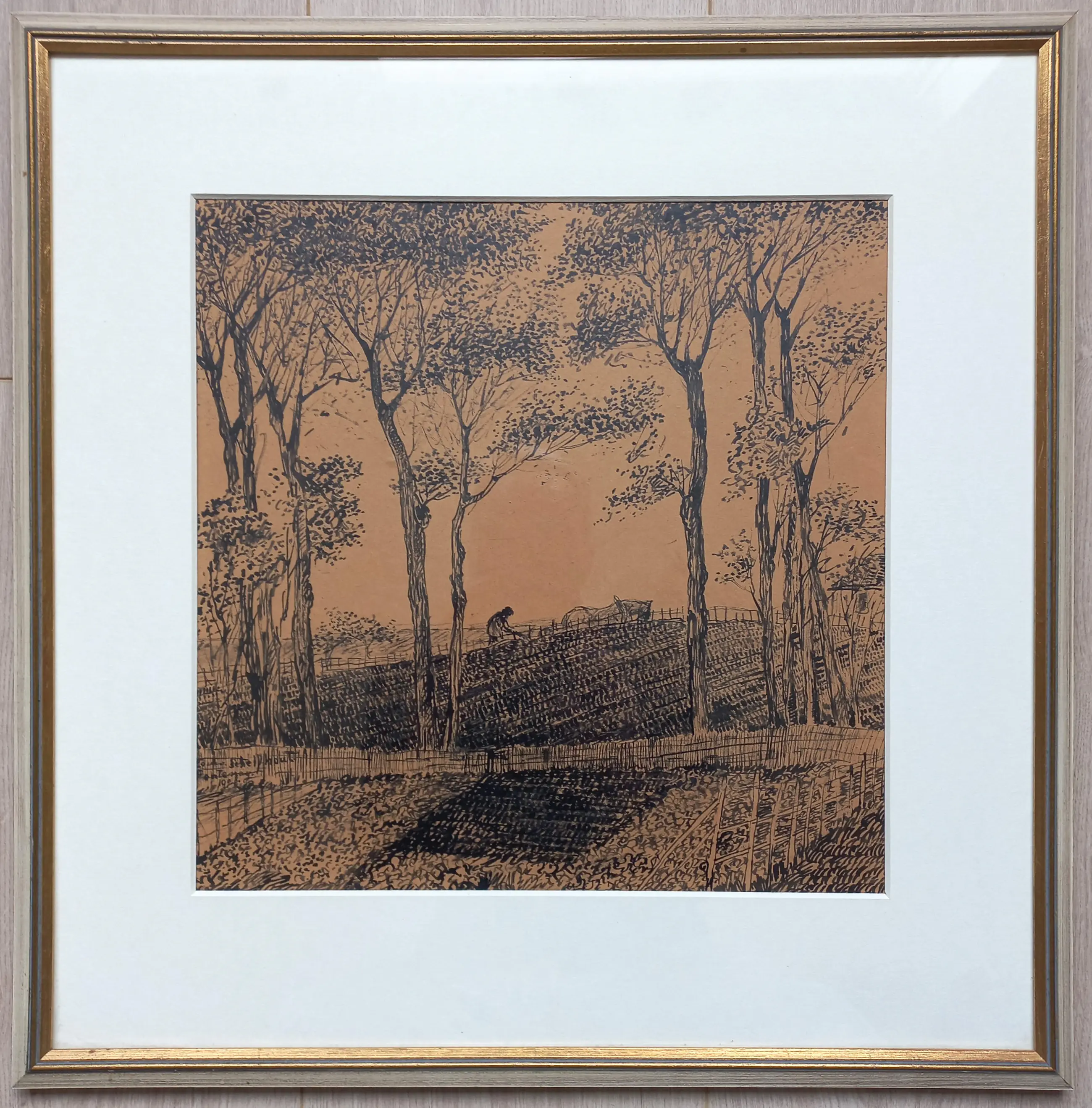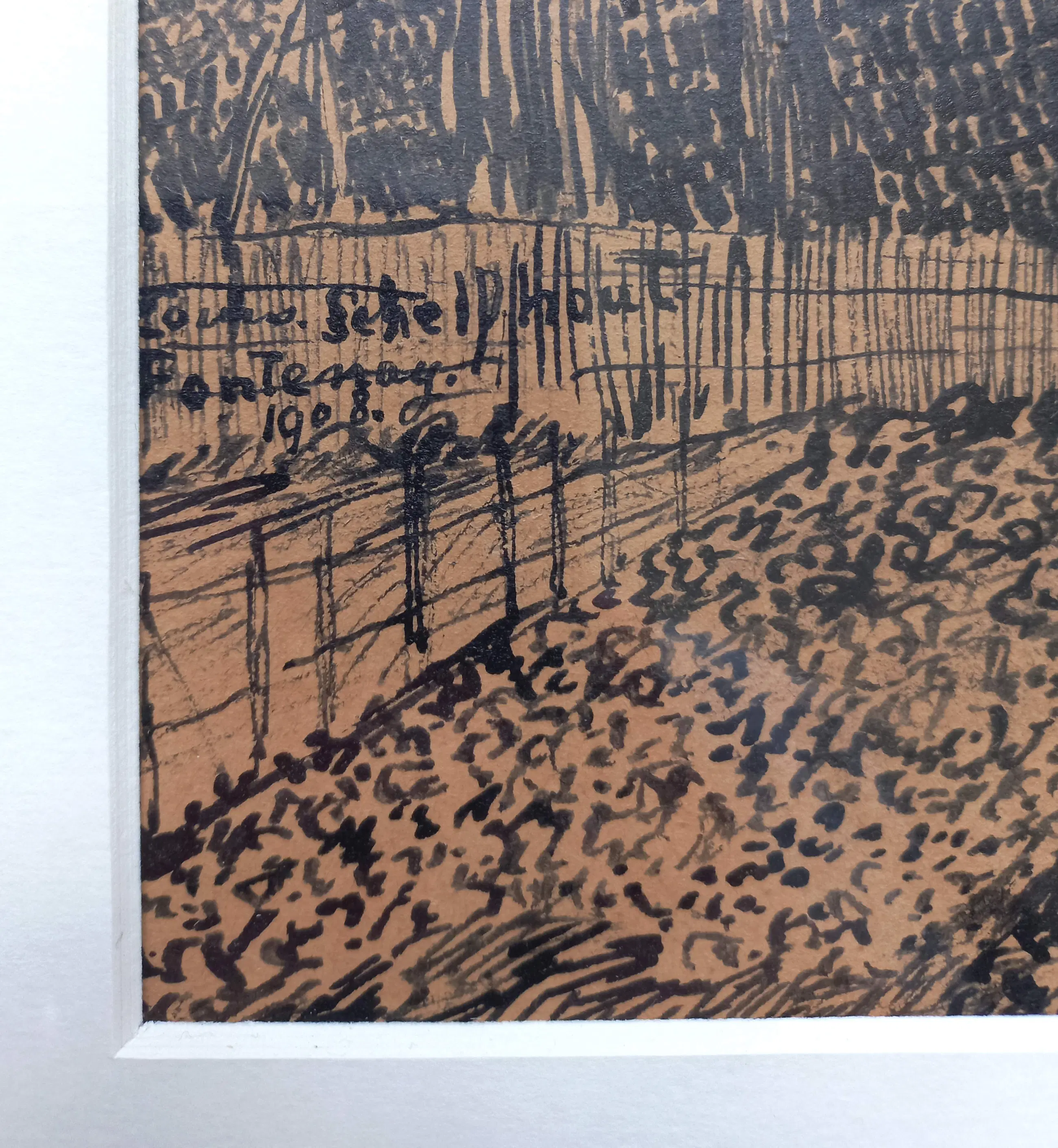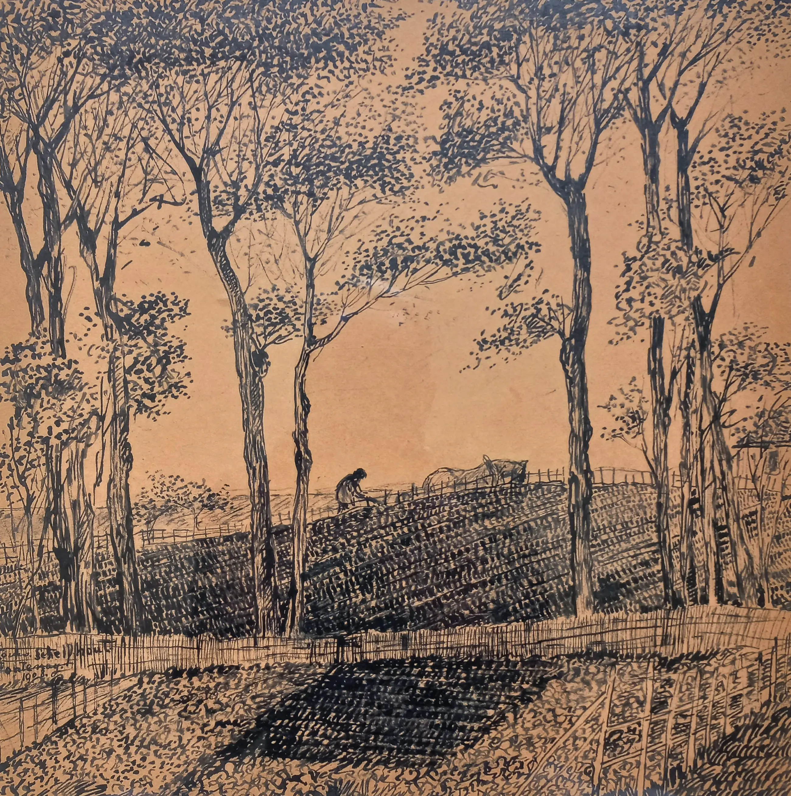 Vroeg, impressionistisch werk van Nederlands eerste kubist Lodewijk Schelfhout. Oost-Indische inkttekening op papier, linksonder met inkt gesigneerd, gedateerd (1908) en gesitueerd (Fontenay). Alles in zeer goede conditie. Herkomst: Kunsthandel Hein Klaver, Baarn / Collectie W. Hoogendijk.