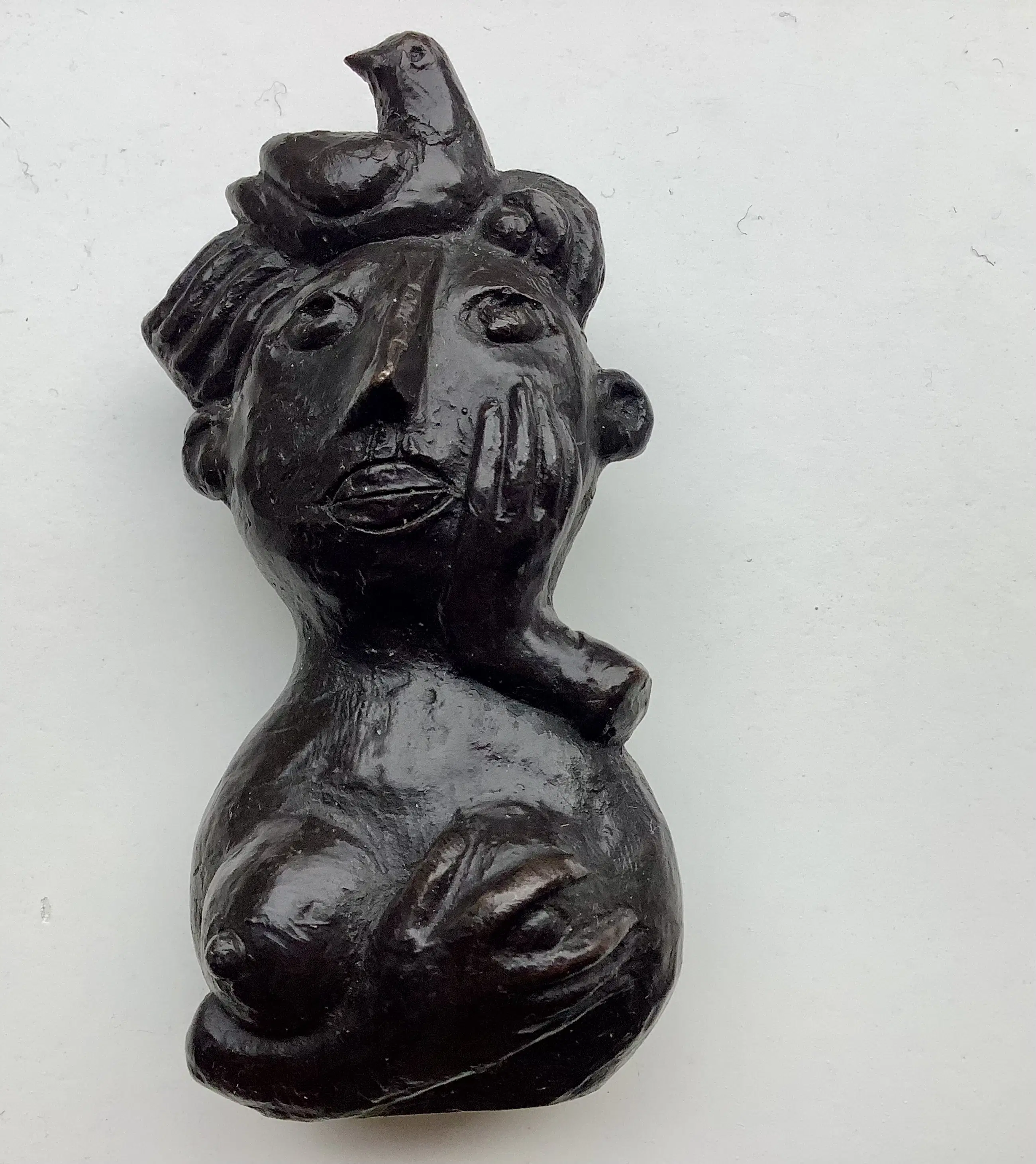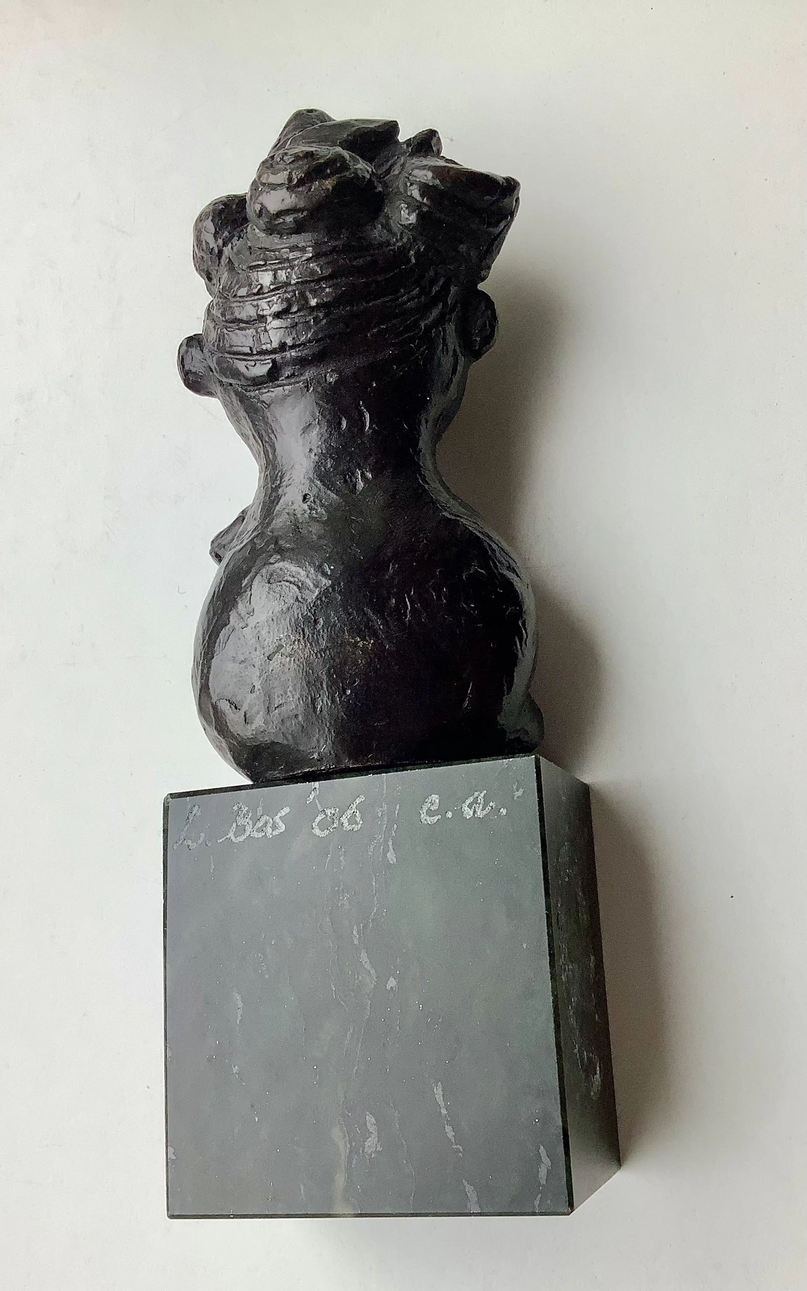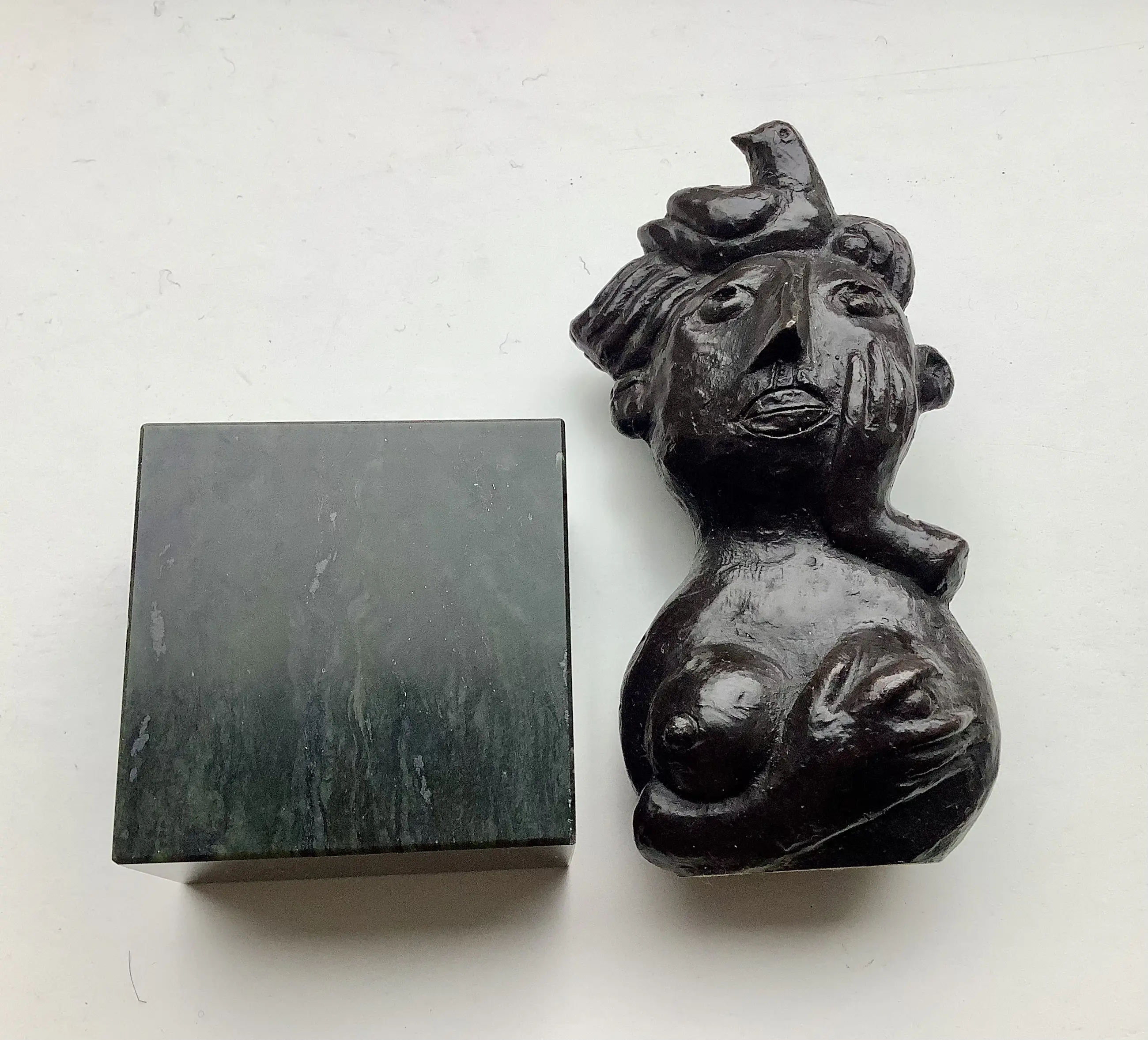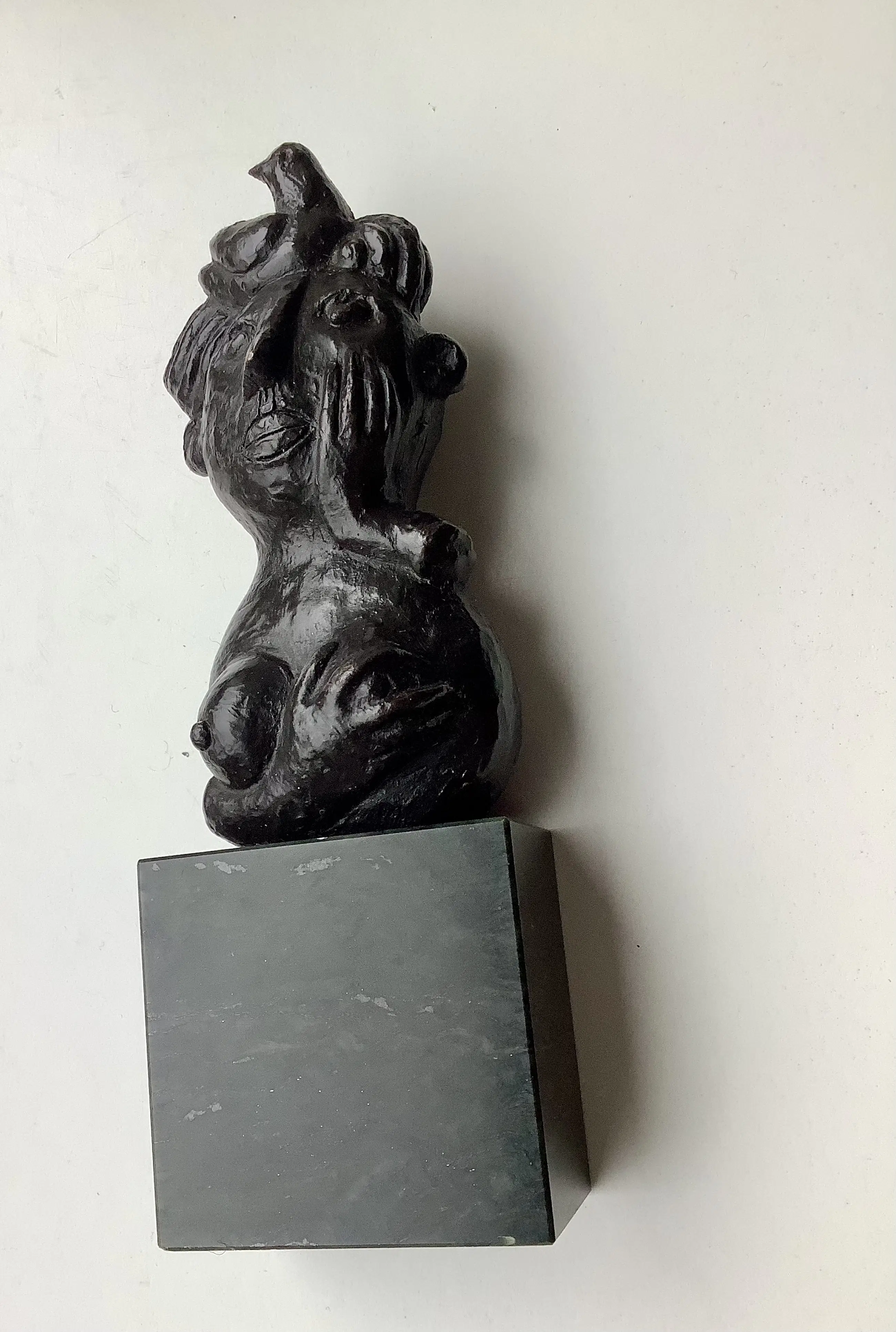 Typerende sculptuur van Loek Bos. Vrolijk beeldje. Sokkel 5 x 5 x 3 cm. Sculptuur 10 cm. hoog.