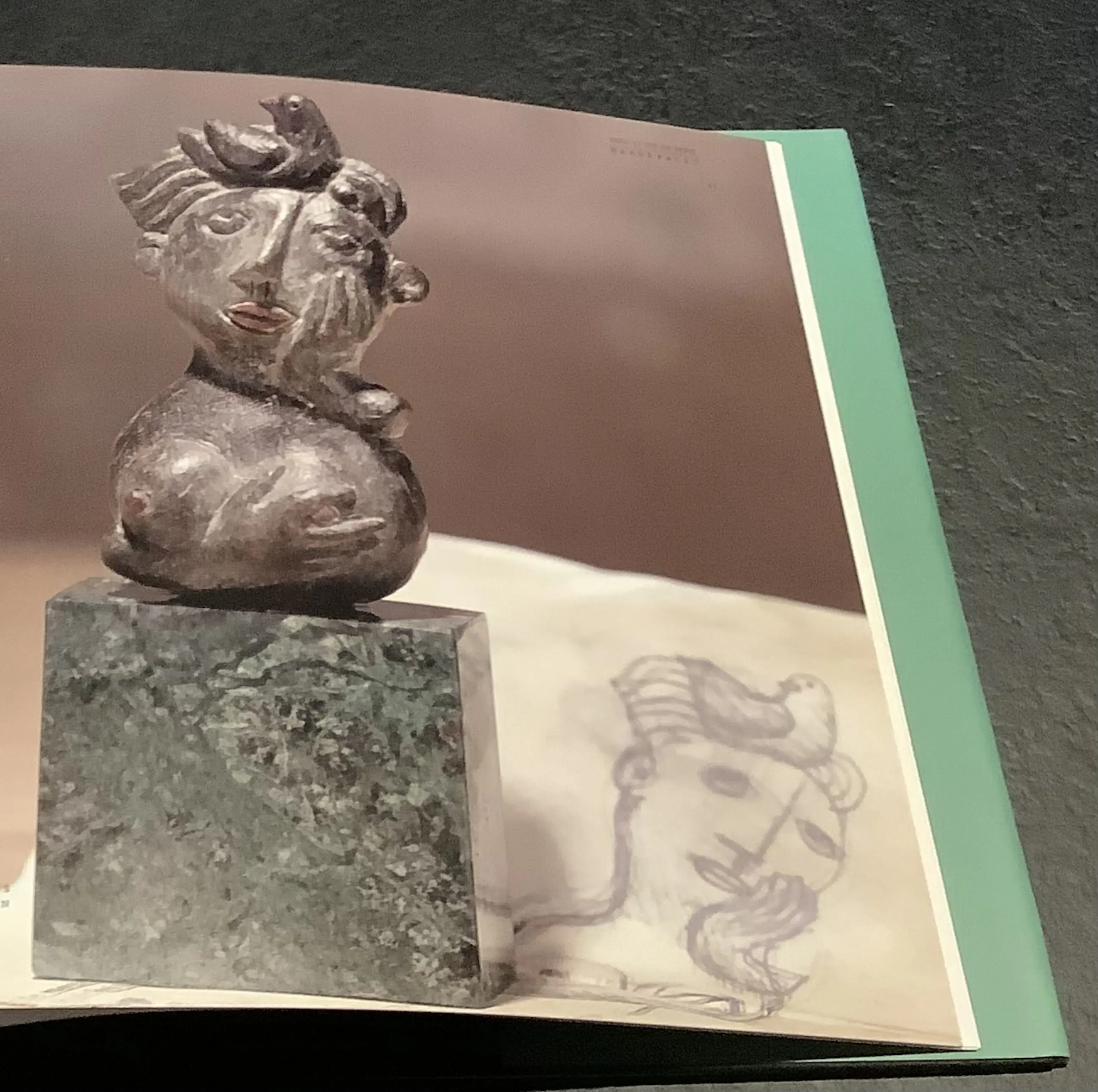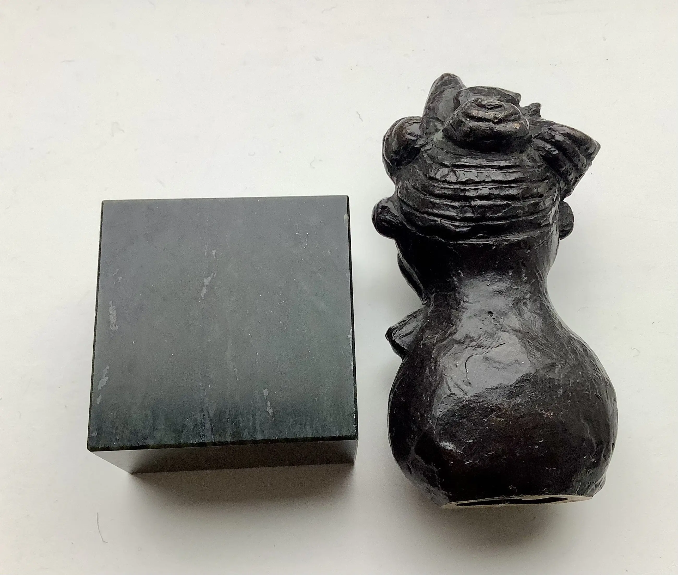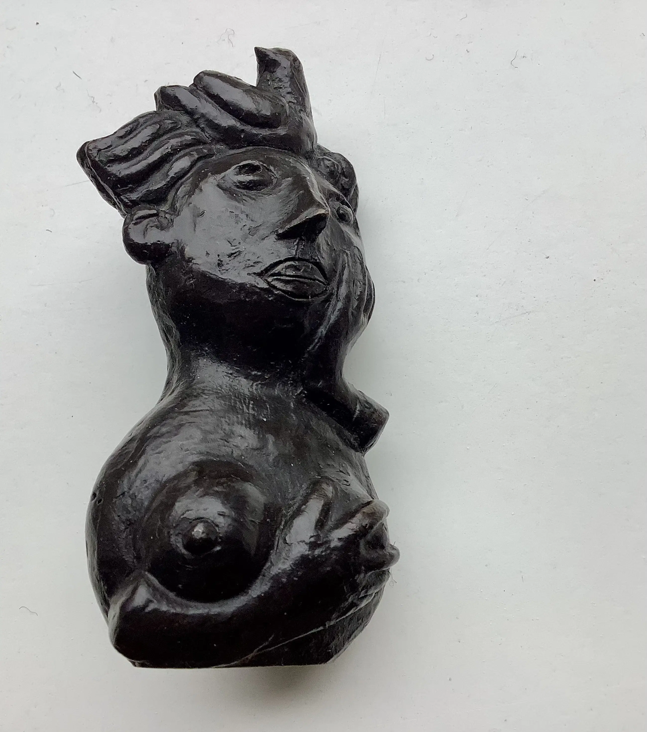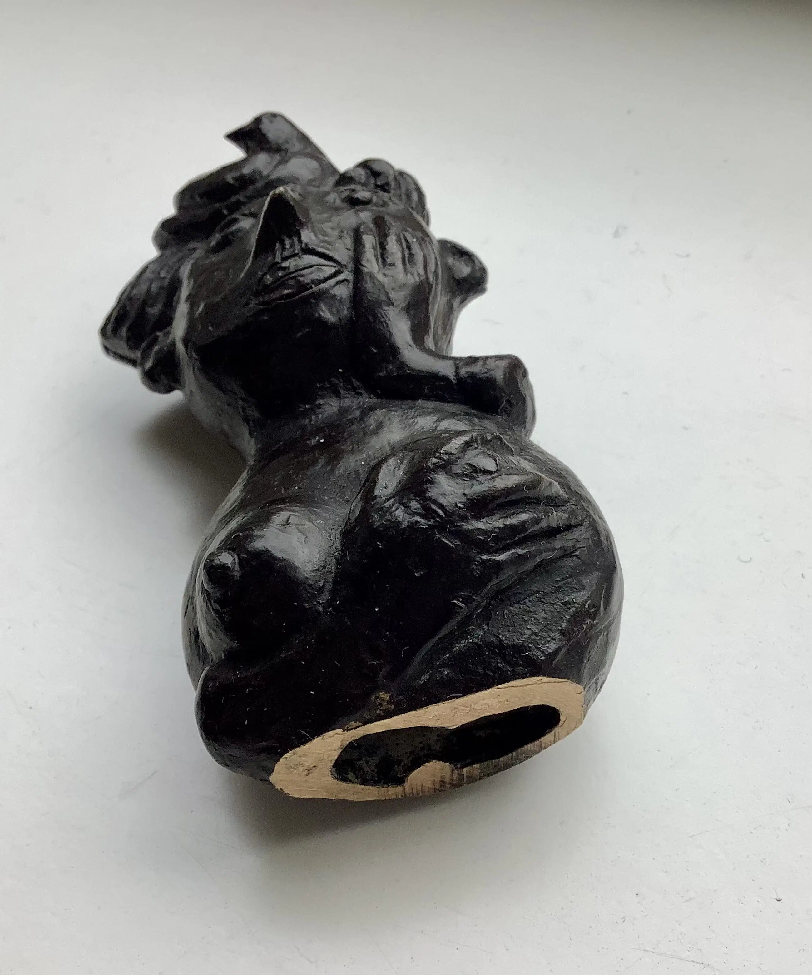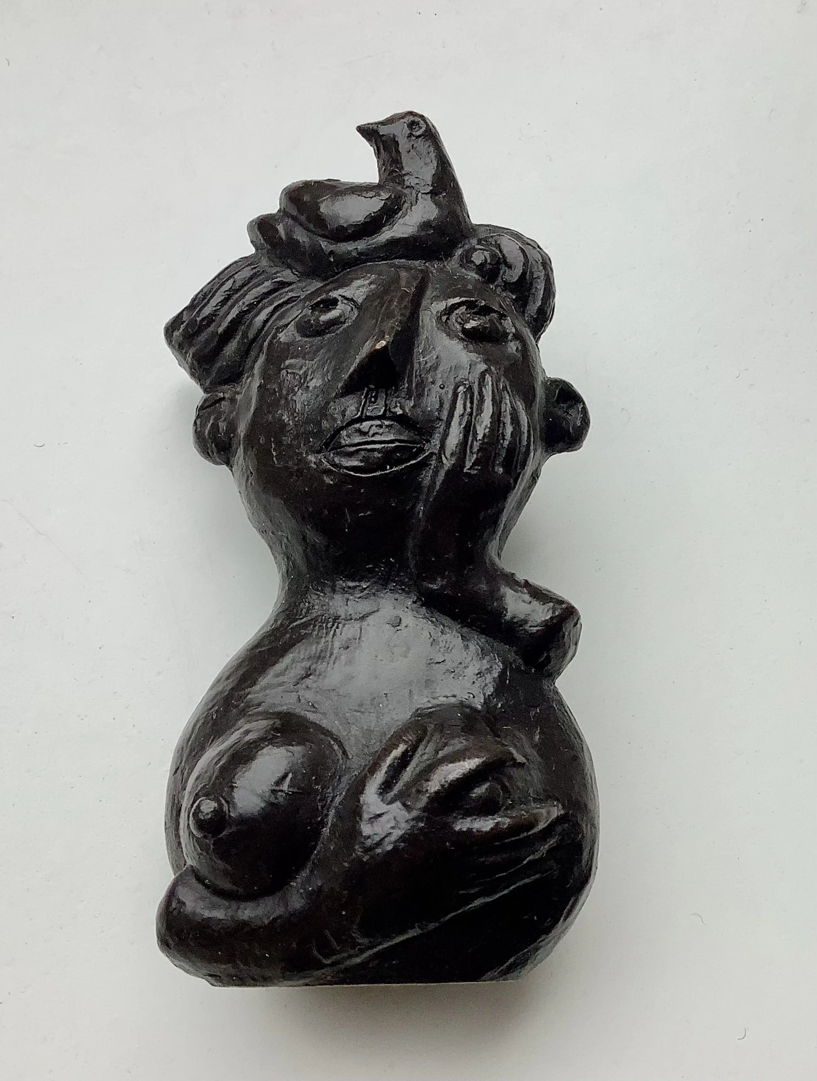 Typerende sculptuur van Loek Bos. Vrolijk beeldje. Sokkel 5 x 5 x 3 cm. Sculptuur 10 cm. hoog.