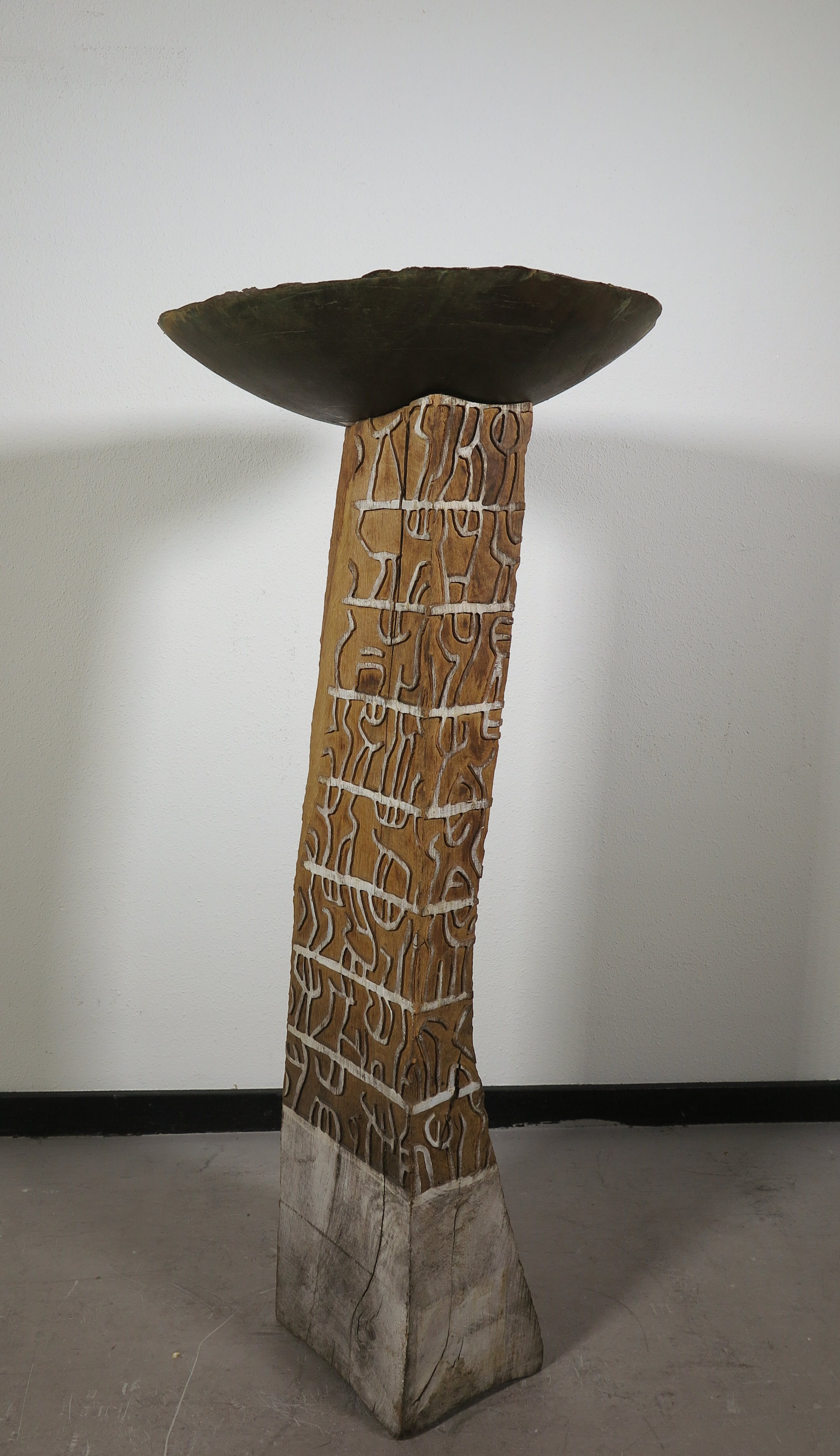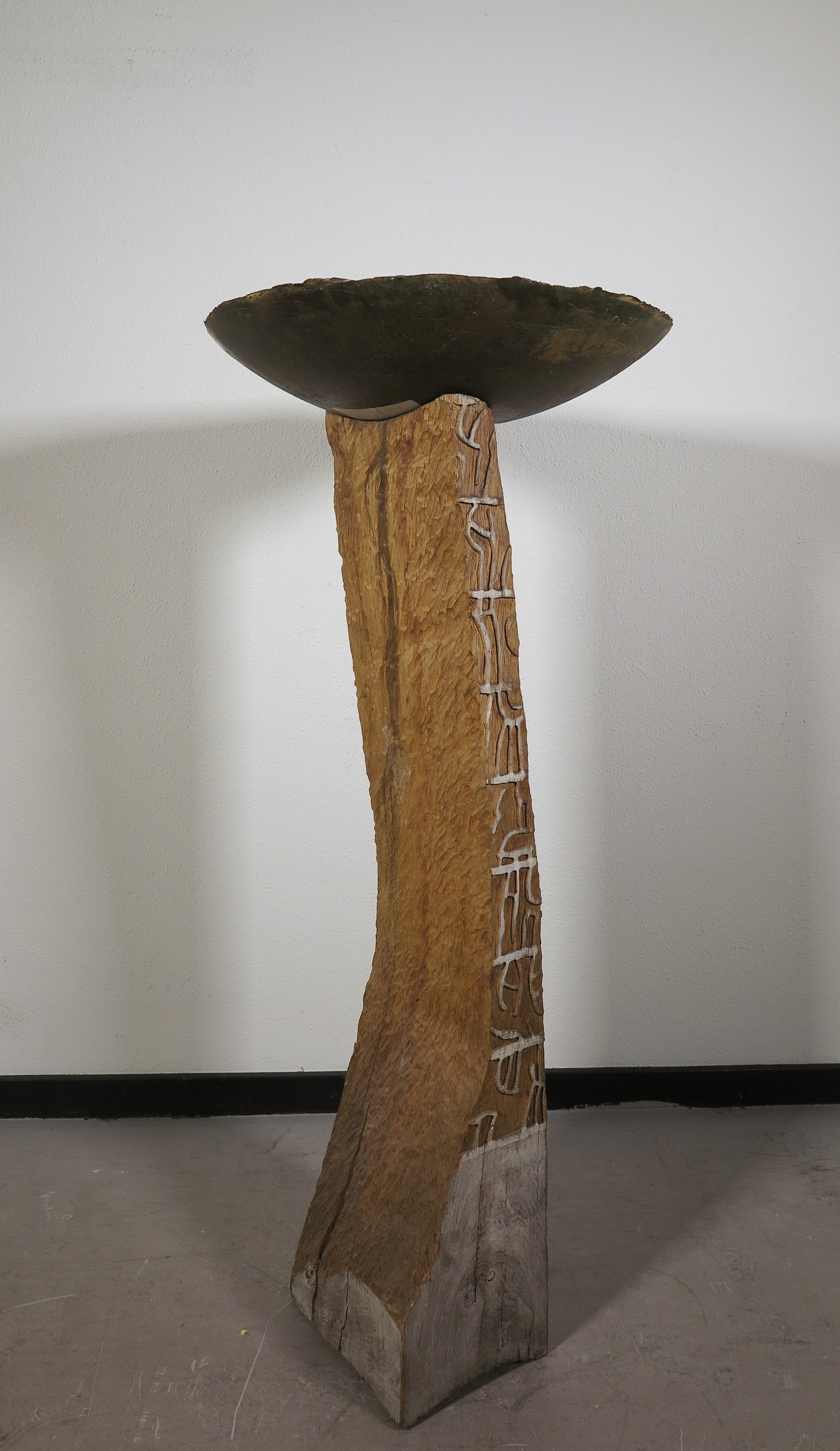 Grote bronzen schaal met decoraties op een houten, handgesneden en deels beschilderde houten sokkel.