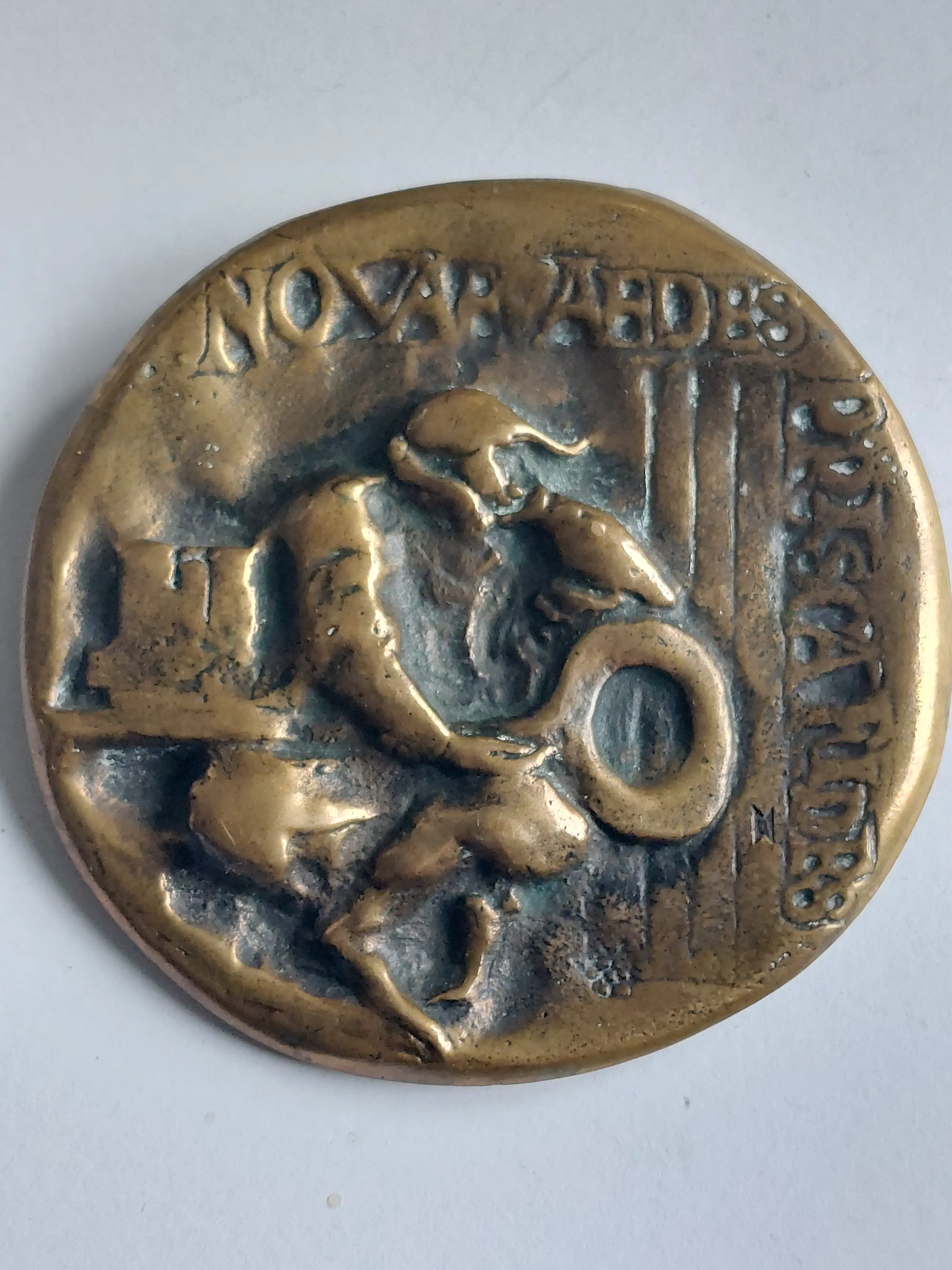 Op de voorzijde DE NEDERLANDSCHE BANK , jaartal 1968 (in cirkel) en afbeelding van het gebouw van de Nederlandsche Bank in Amsterdam, Op de keerzijde NOVAE AEDES PRISCA FIDES en gezeten mansfiguur met reusachtige sleutel op zijn schoot