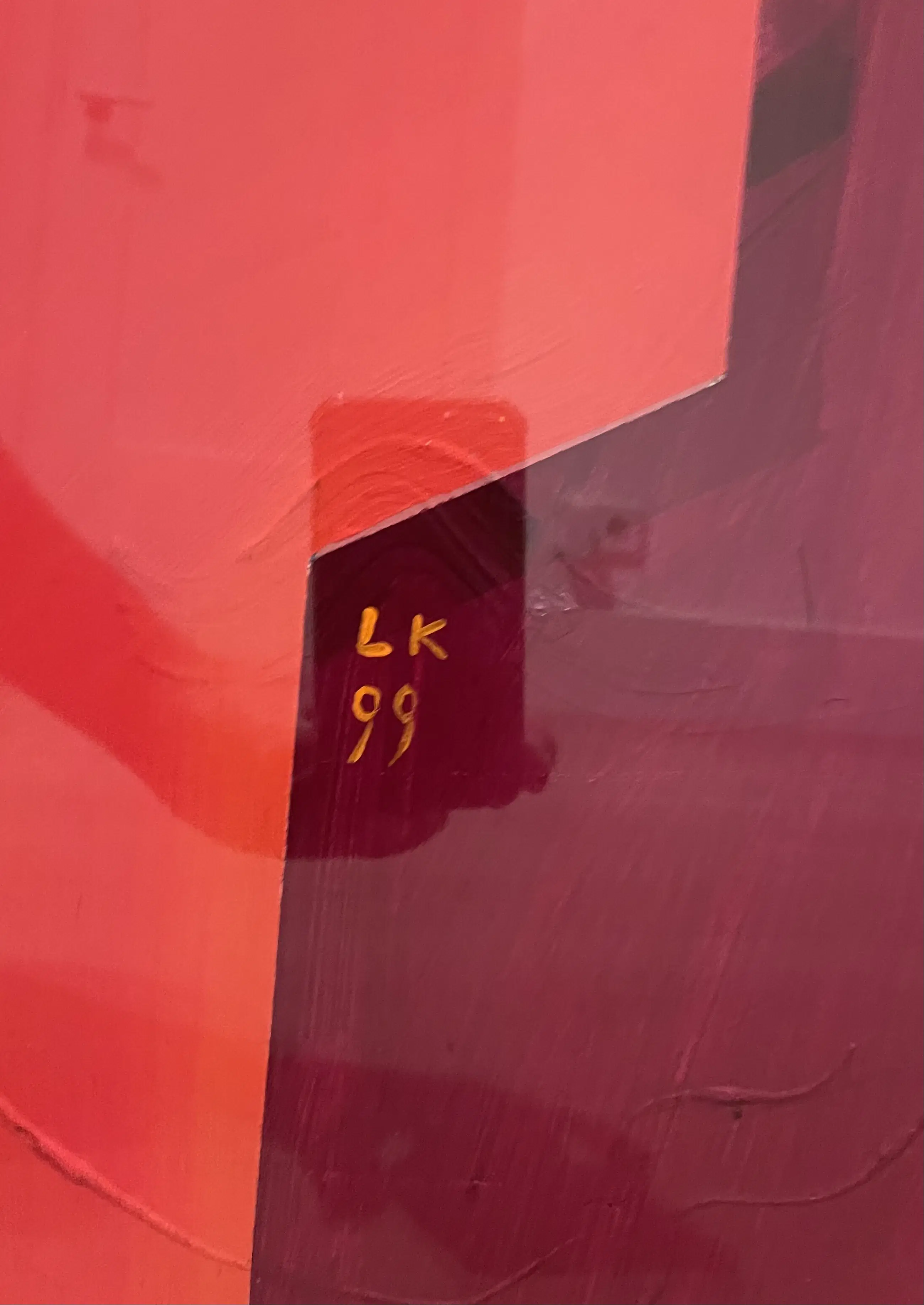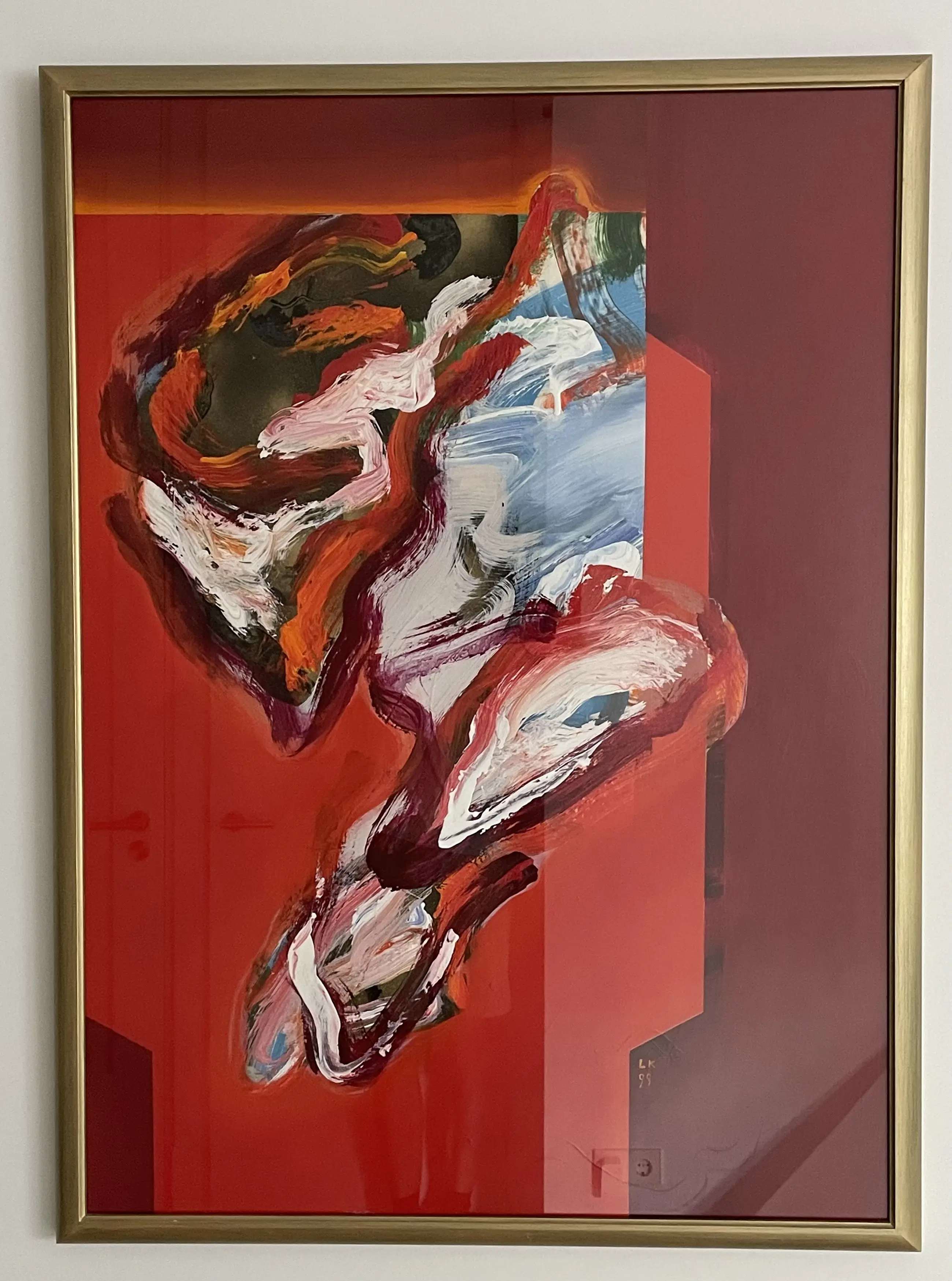 Kleurrijk schilderij in dikke goudkleurige lijst. Uit bedrijfscollectie, zeer goede staat – een opvallend kunstwerk dat direct kan worden opgehangen.