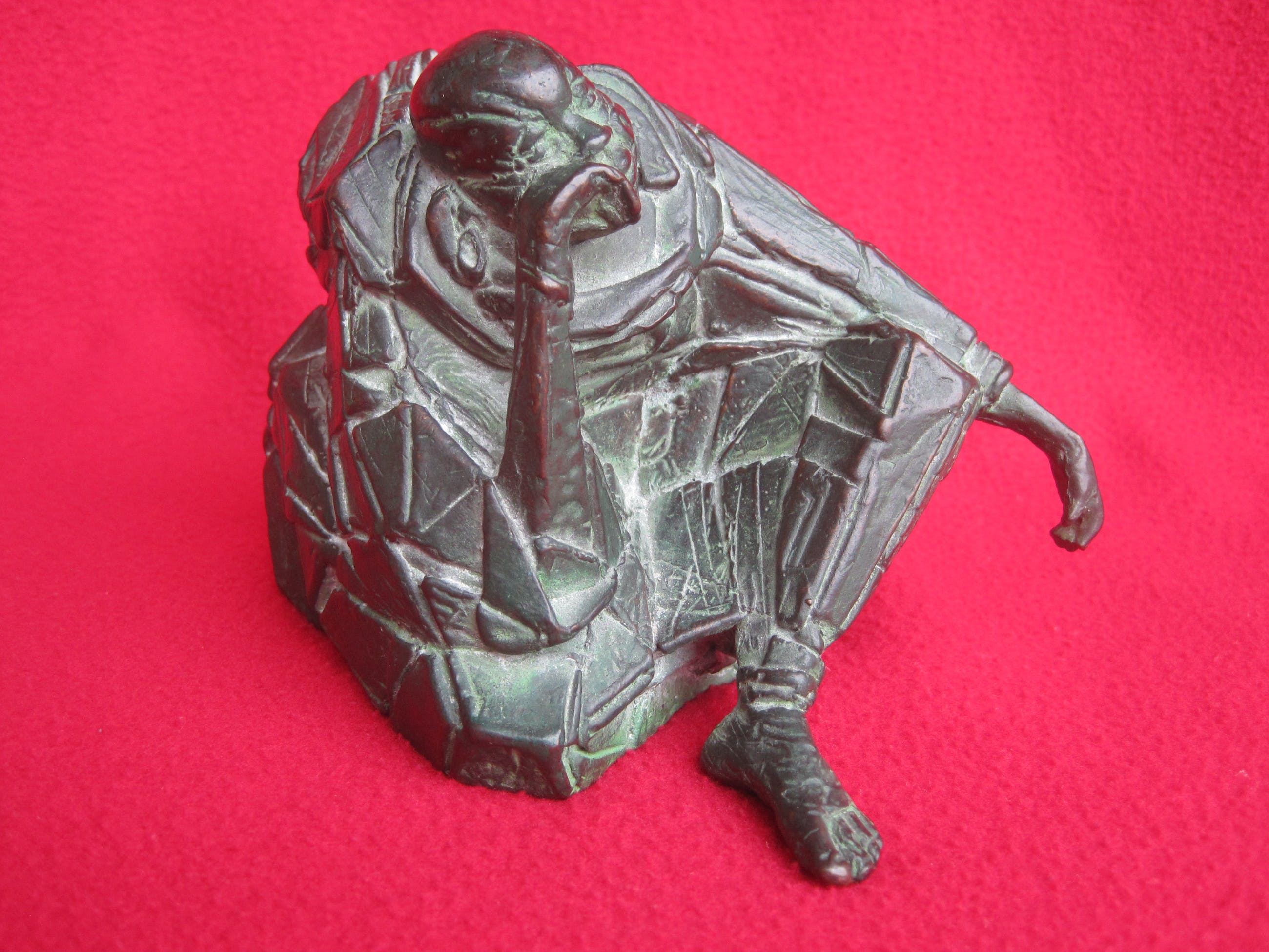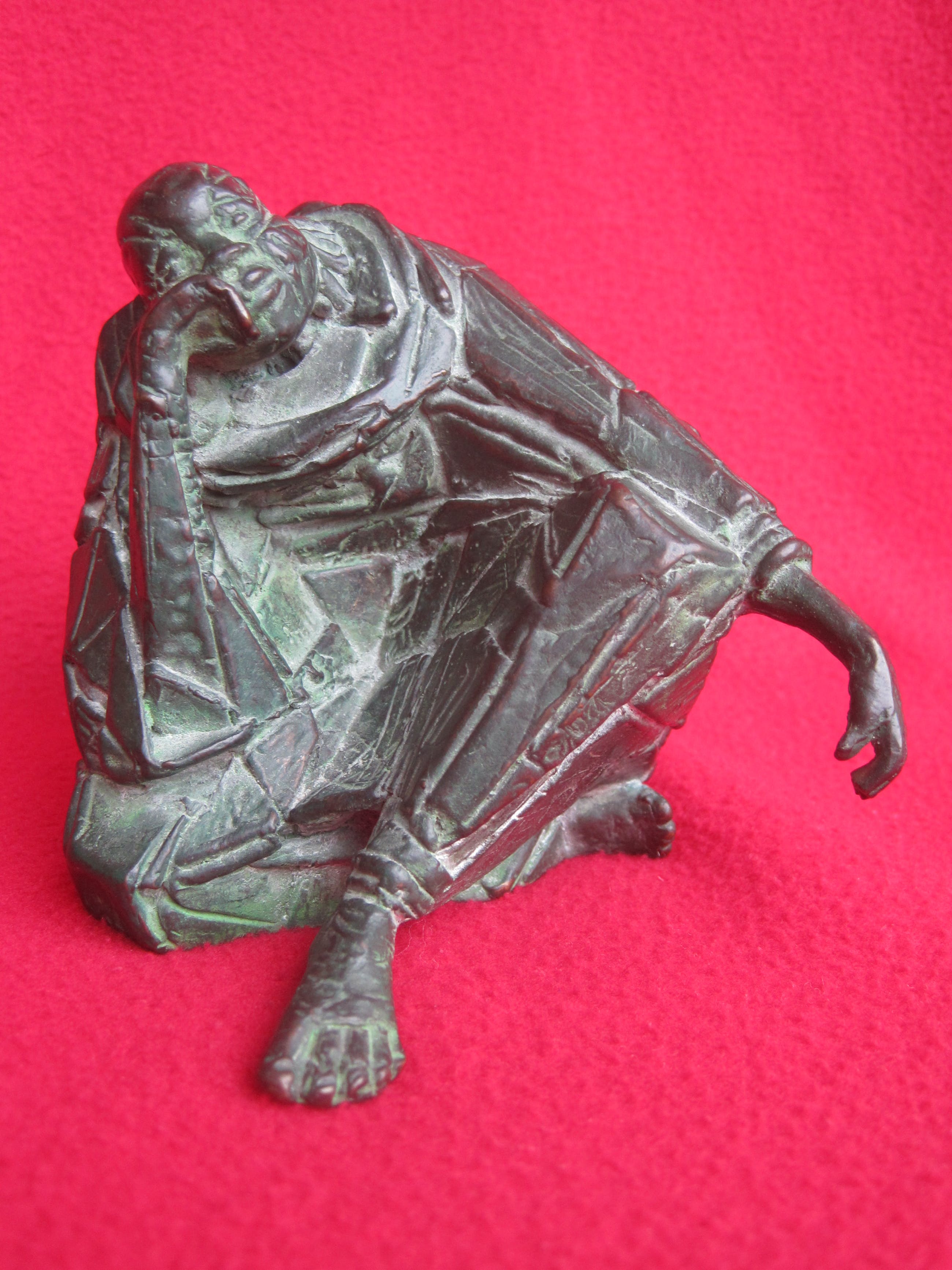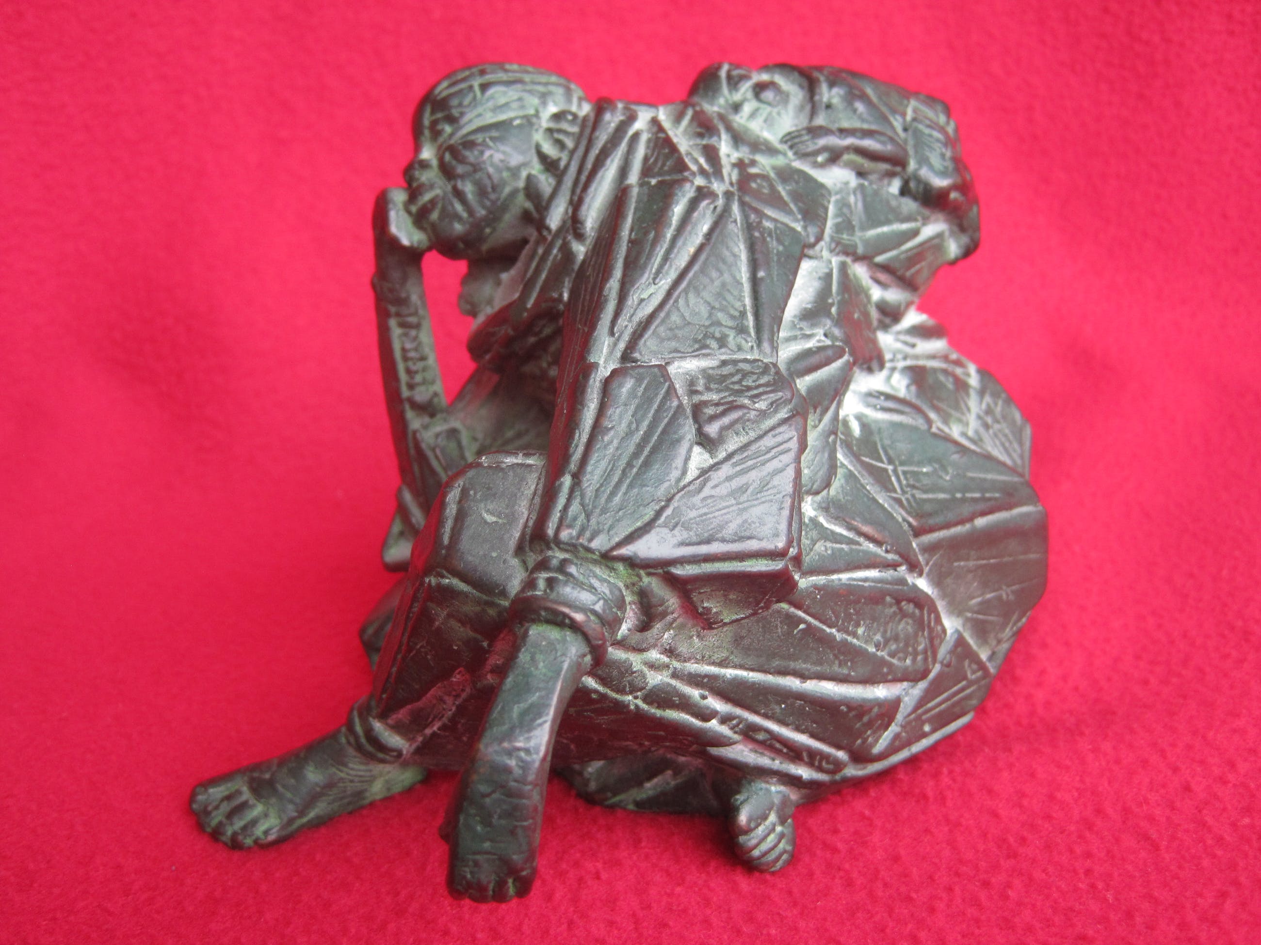 Een zwaar bronzen beeld van een moeder met een kind op de rug.