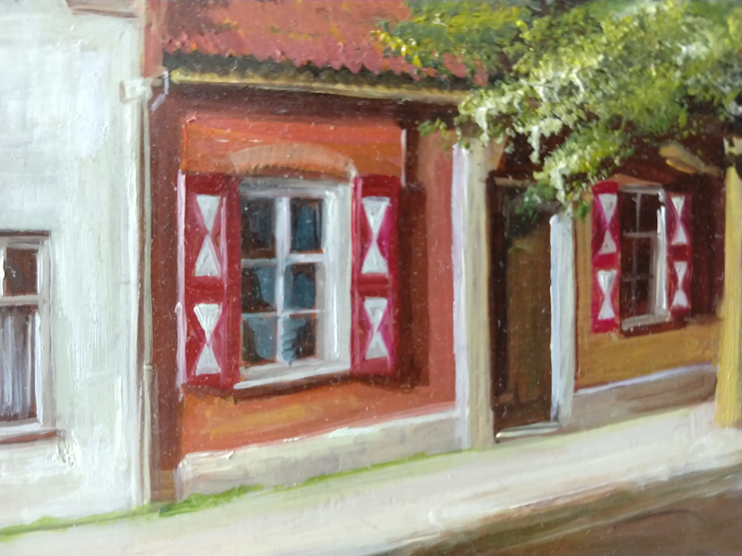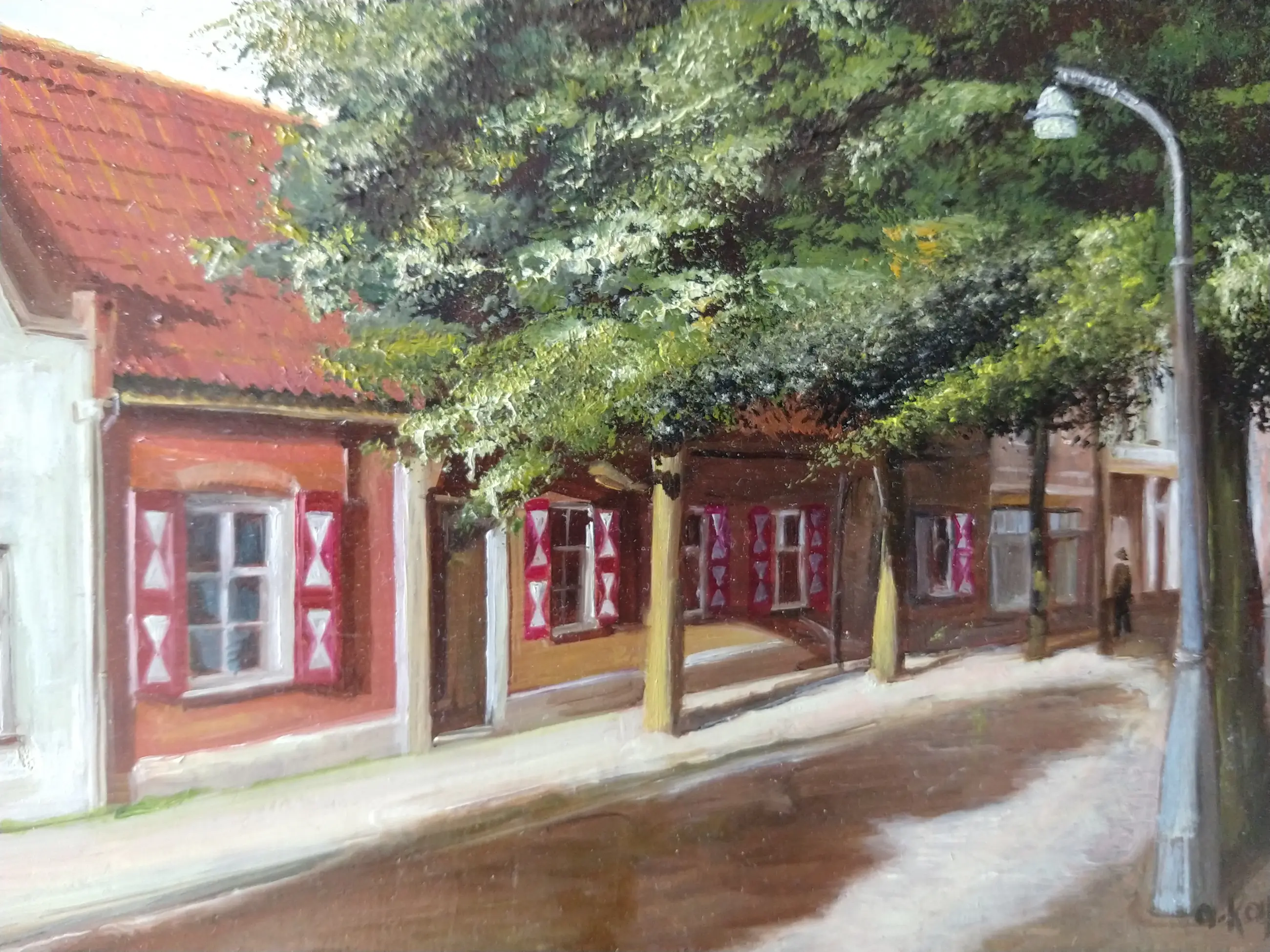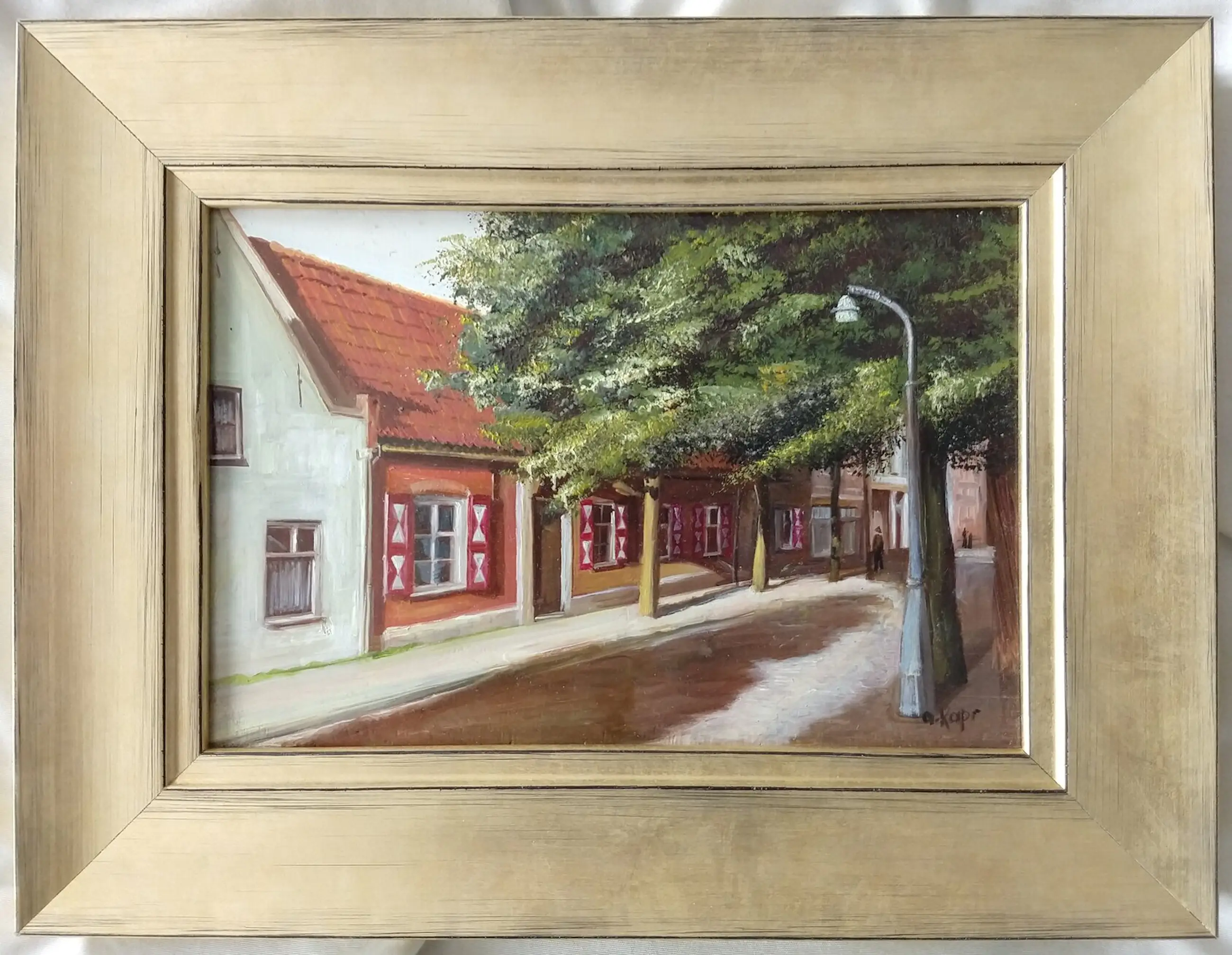 Dorpsstraatje van Lois Kapr. Zeer fijn realistisch geschilderde kunstwerk. Olieverf op paneel. Gesigneerd. Het schilderij en de lijst zijn in zeer goede staat zonder ouderdomssporen of gebruikssporen.