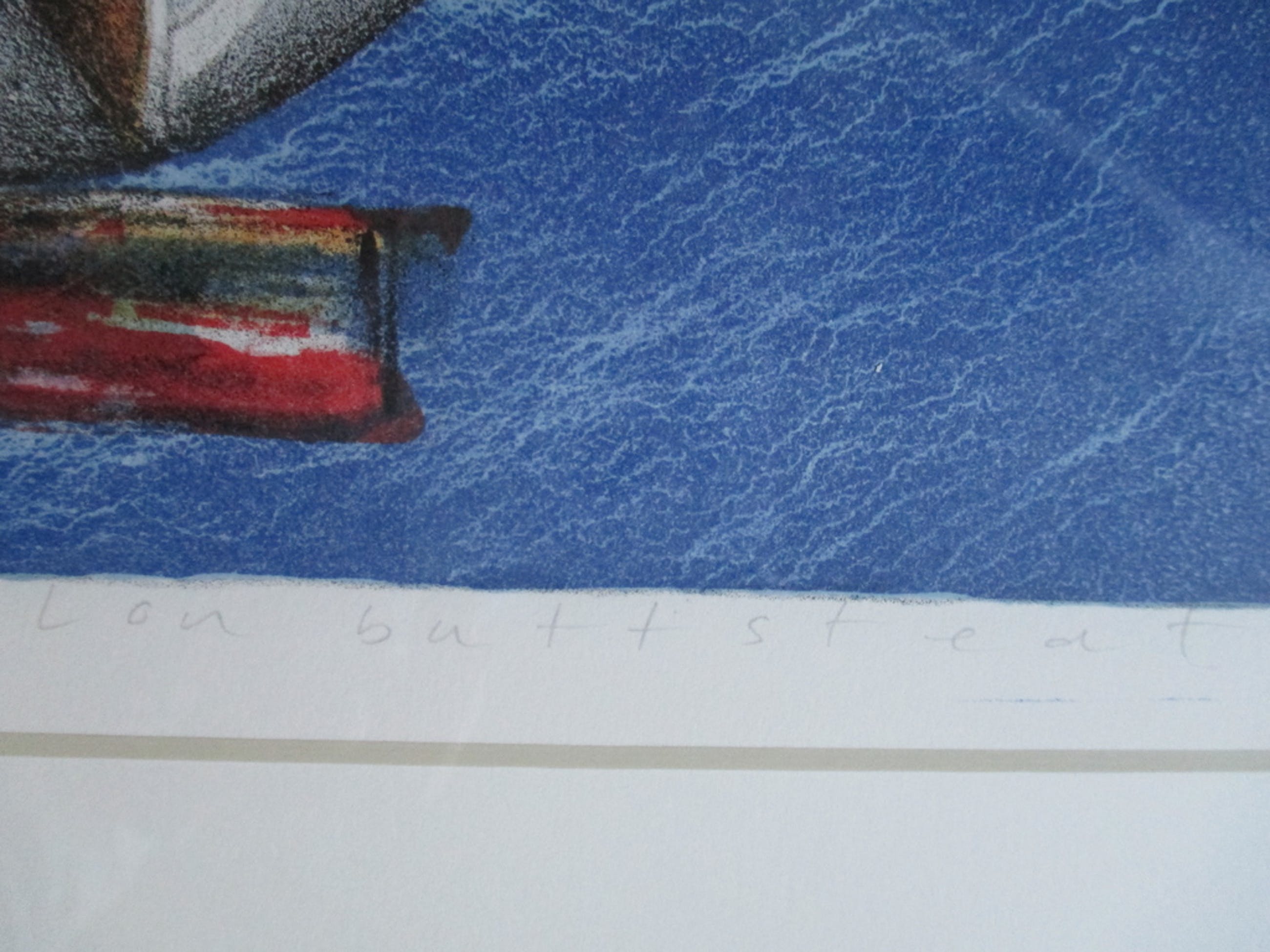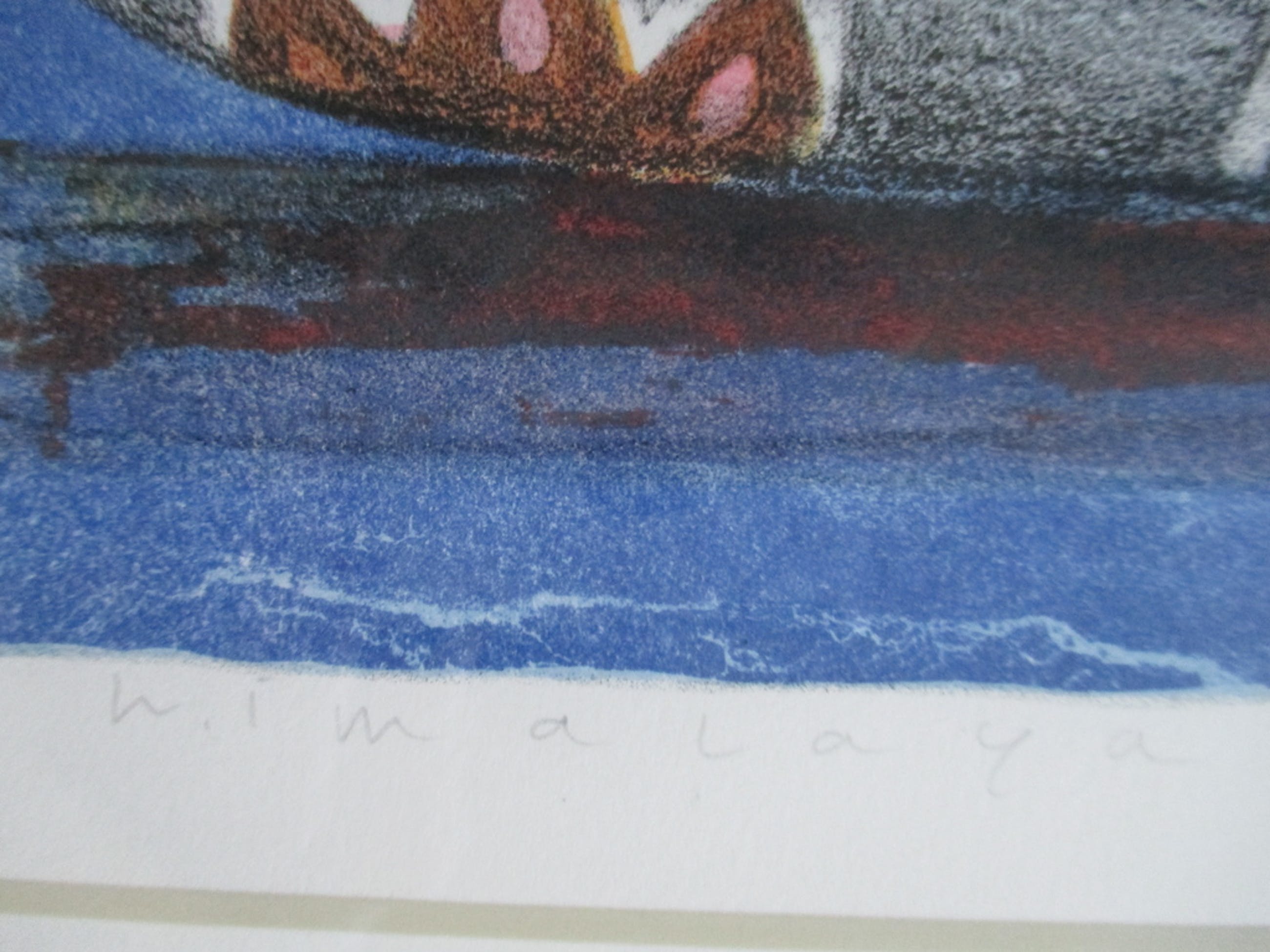 Litho van Lon Buttstedt (1950), gesigneerd, genummerd 36/66 en getiteld 'Himalaya blues V' in potlood. Mooi professioneel zuurvrij ingelijst achter glas in een Barth lijst, afm. lijst 73x93, beeld 45x65 cm. Het geheel verkeert in perfecte staat.