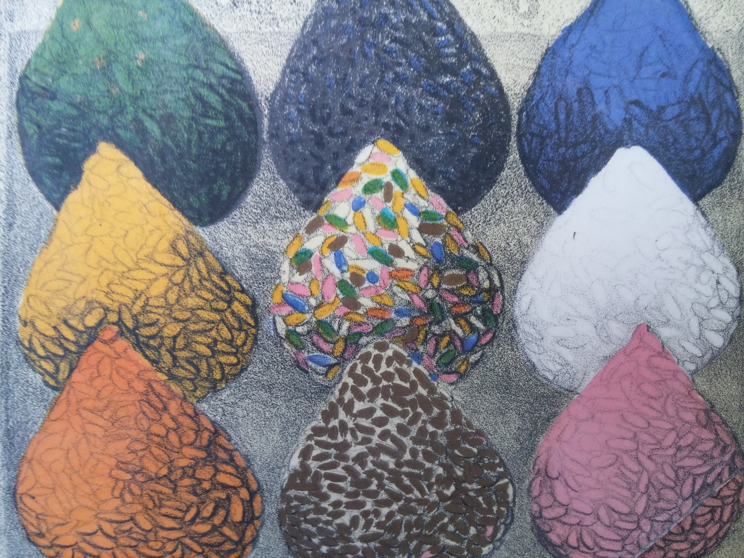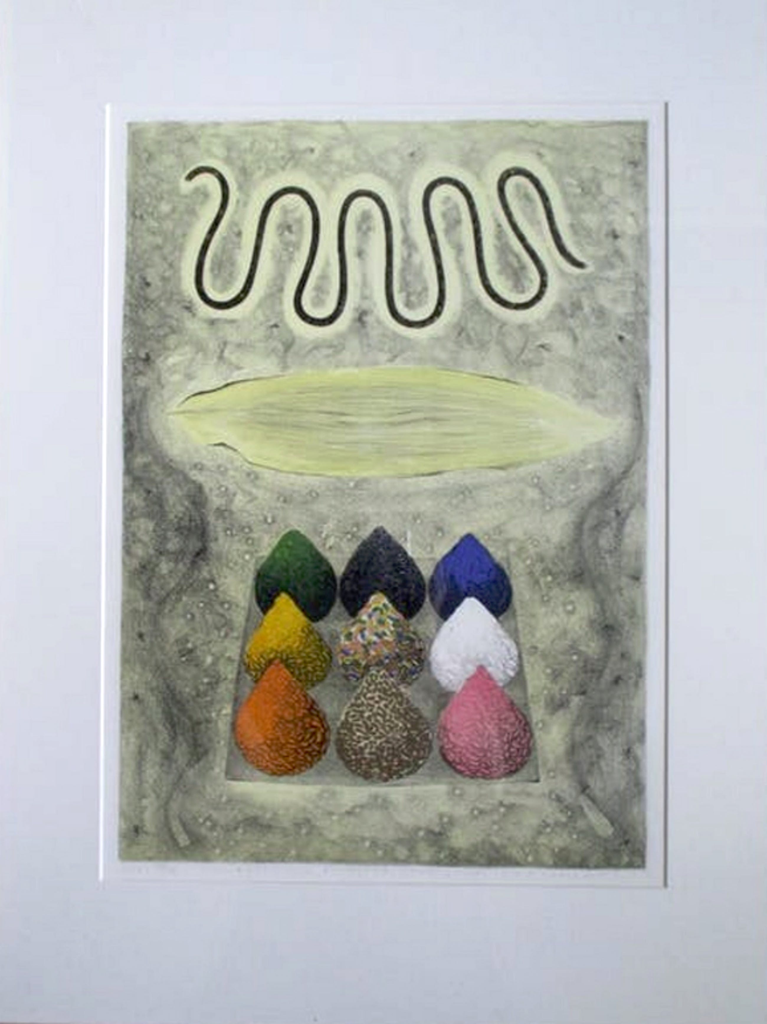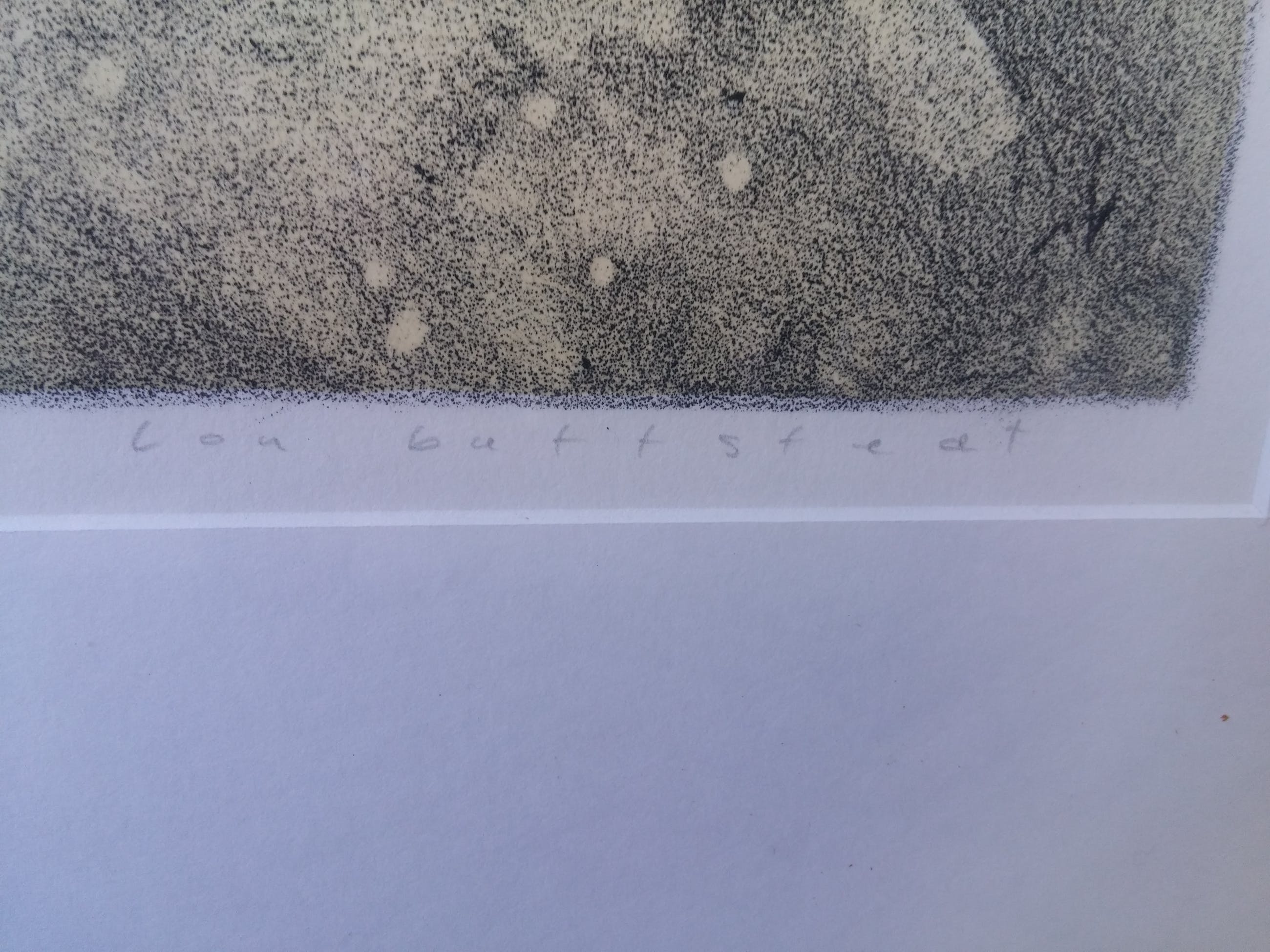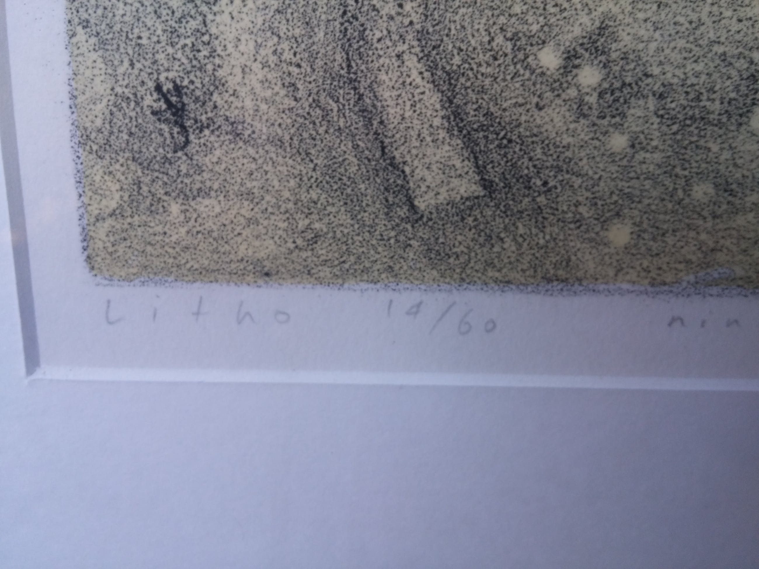 Litho van Lon Buttstedt (1950), r.o. gesigneerd, genummerd 14/60, en getiteld 'Nine directions, palm leaf, road' in potlood. In de lijst zit geen glas!