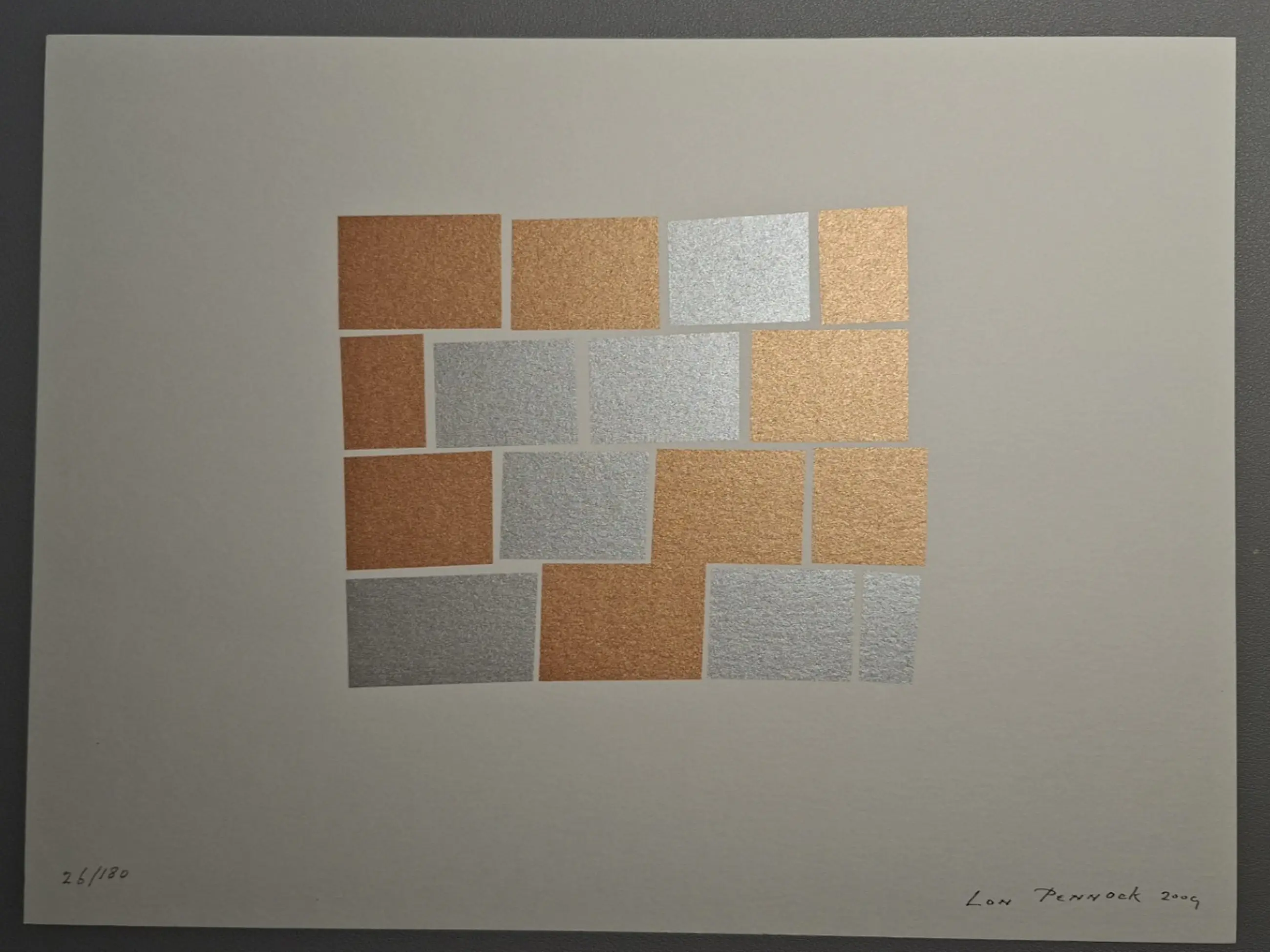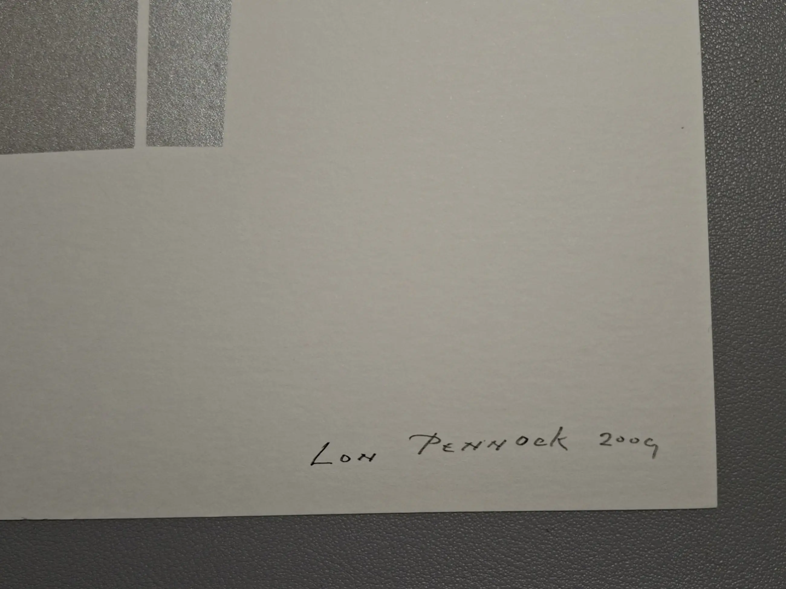 Mooie abstracte zeefdruk van de Nederlandse kunstenaar Lon Pennock (1945–2020), bekend om zijn minimalistische en geometrische beeldtaal. Dit werk uit 2009 toont zijn kenmerkende spel van vorm, balans en ruimte.
