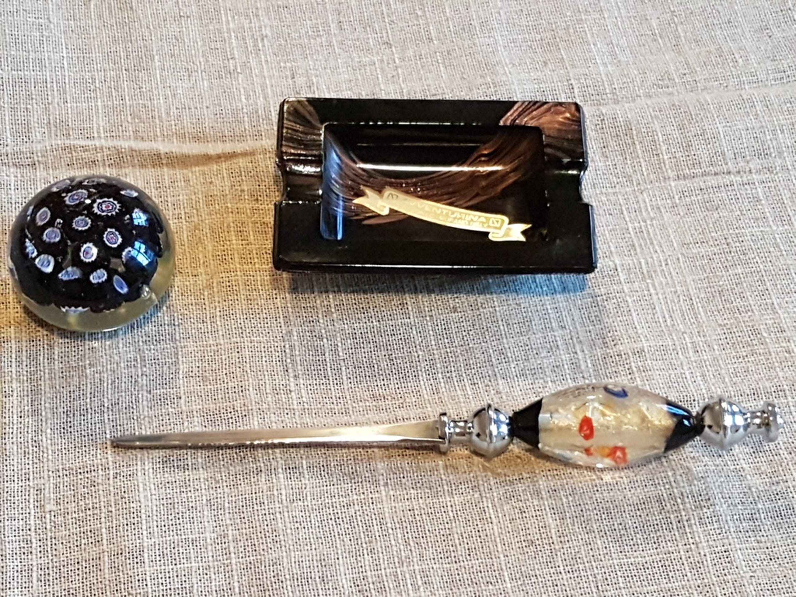 Lot "Monsieur": 1 asbak uit de serie Avventurina van de meesters Seguso en Nason 1965; 1 Murrina pressepapier;1975 1 briefopener in Muranoglas 1975