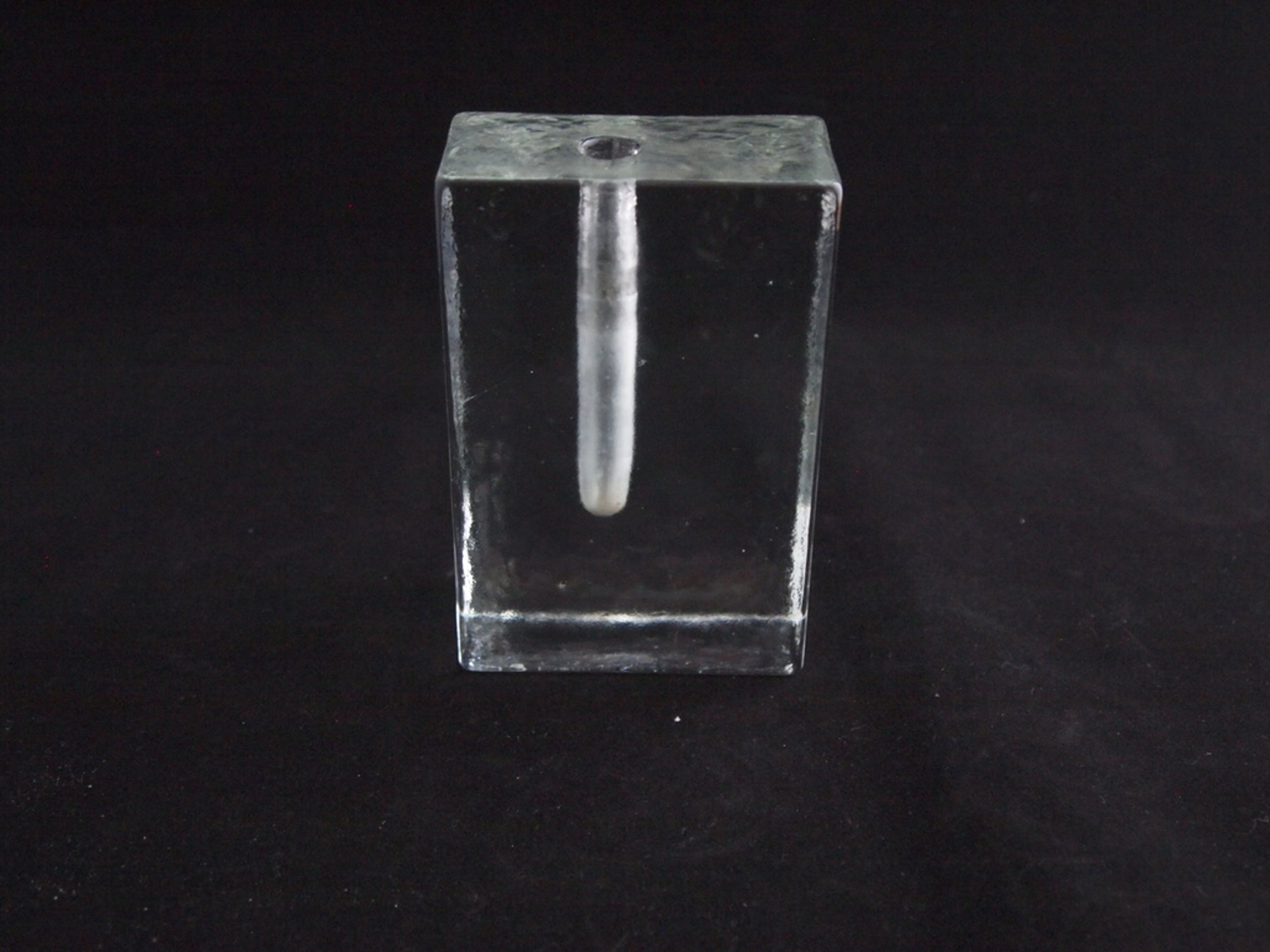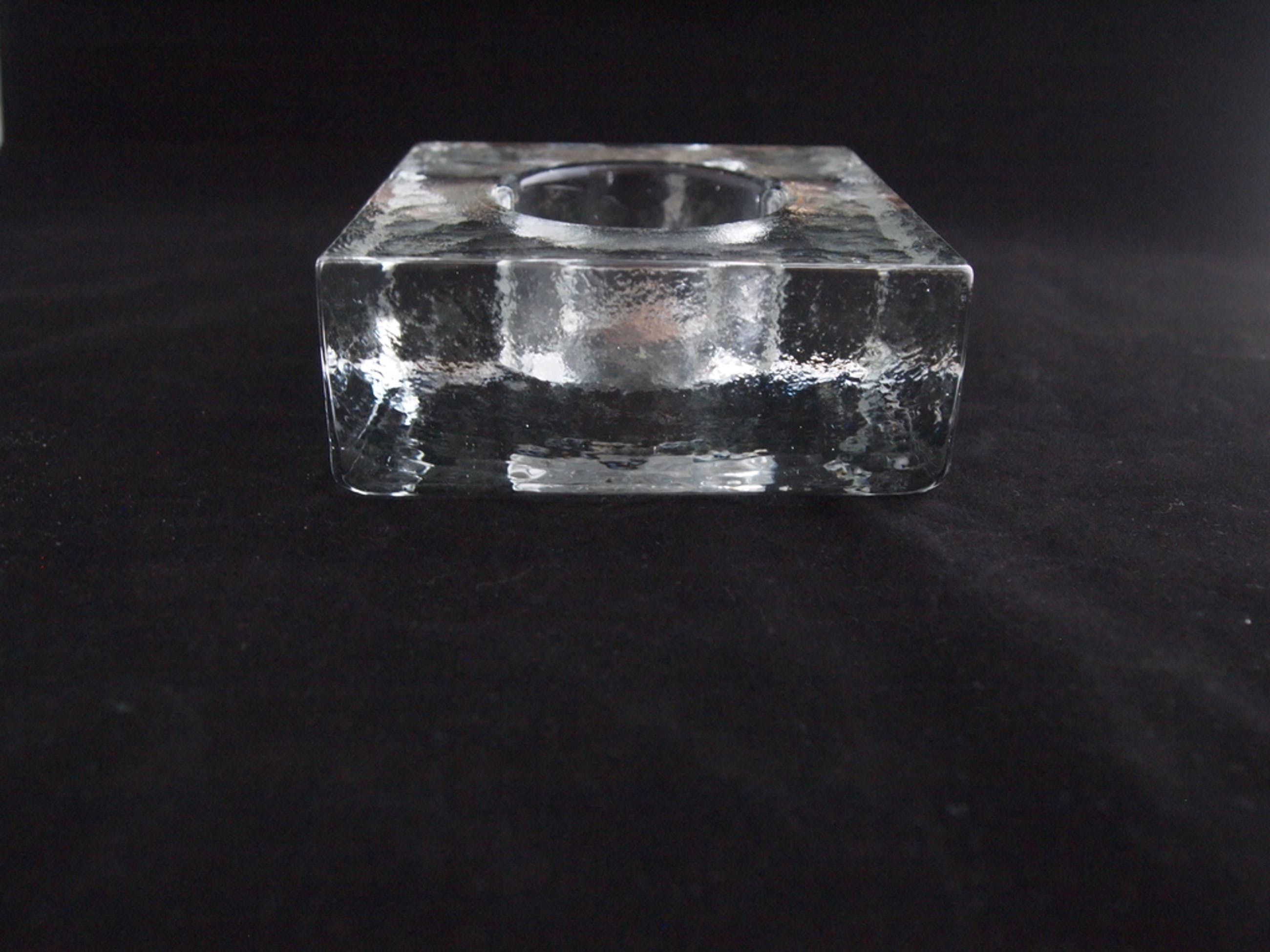 Lot van een solifleur kandelaar + massief glazen kandelaar. Beide stukken in onbeschadigde conditie. Niet gemerkt. De solifleur is waarschijnlijk van Walther glas of van Scandinavische makelij. De vierkante kandelaar is waarschijnlijk ook van Scandinavische makelij.