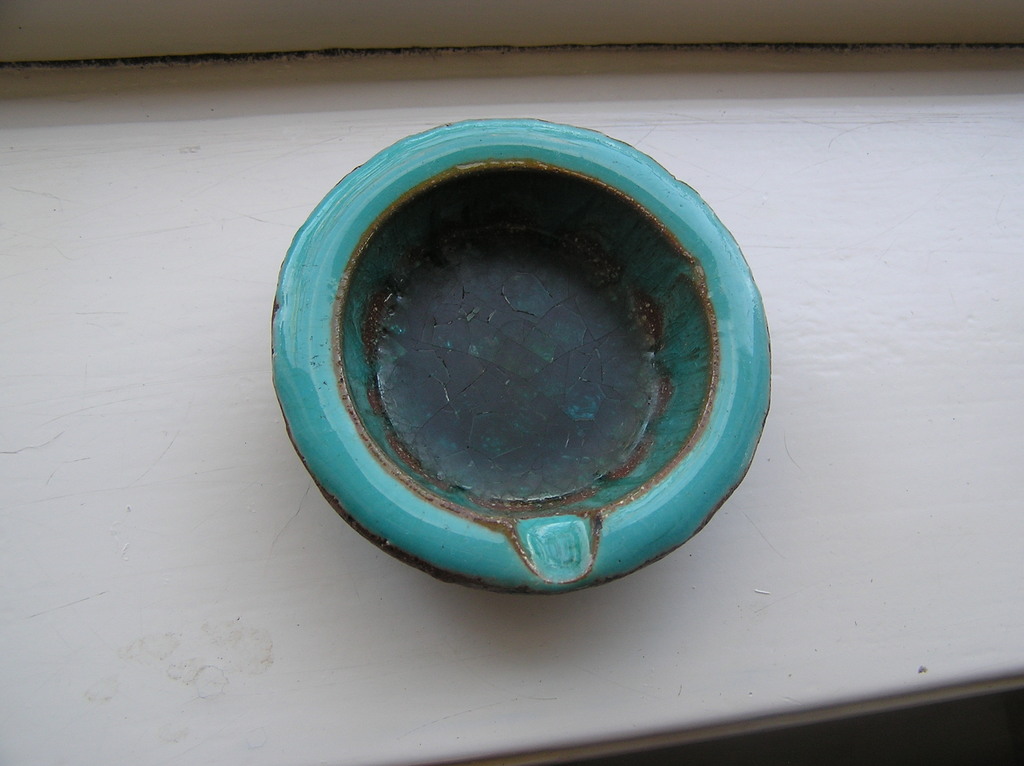Klein rood chamotte aardewerken travertine asbakje met aquamarijn craquele glazuur. Geen beschadigingen. Niet gemerkt, onderzijde voorzien van vilten laagje, hierdoor is merk misschien niet zichtbaar. Afmetingen; 3,5 cm hoog en een doorsnede; 9 x 9 cm.
