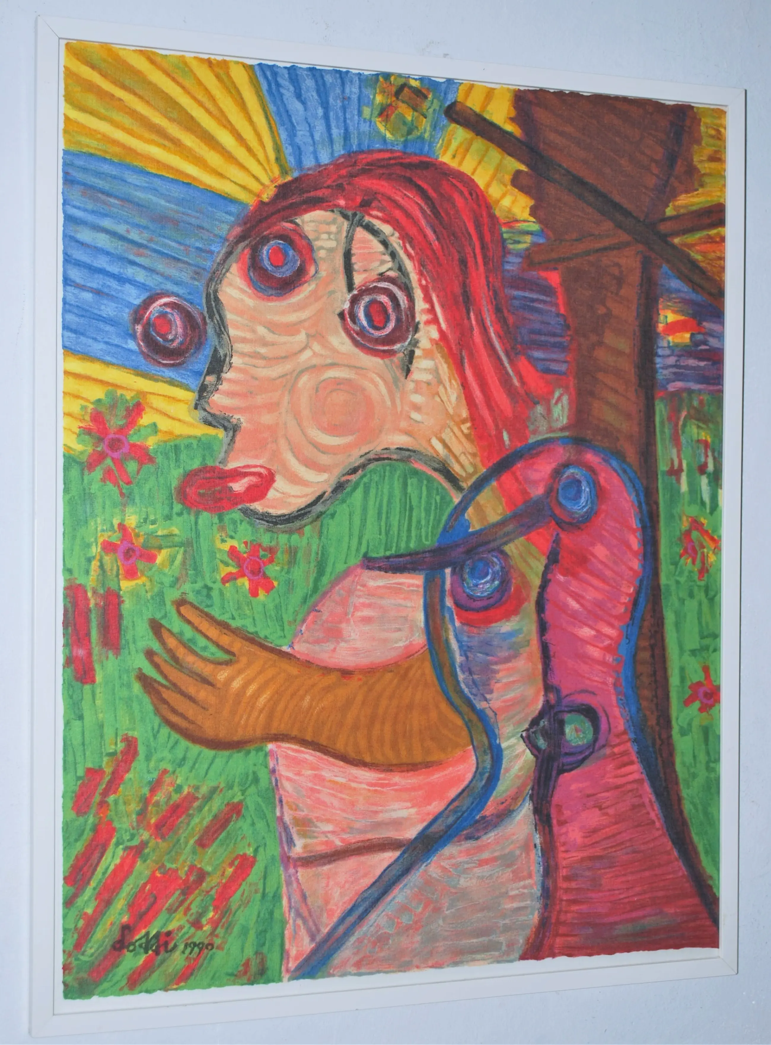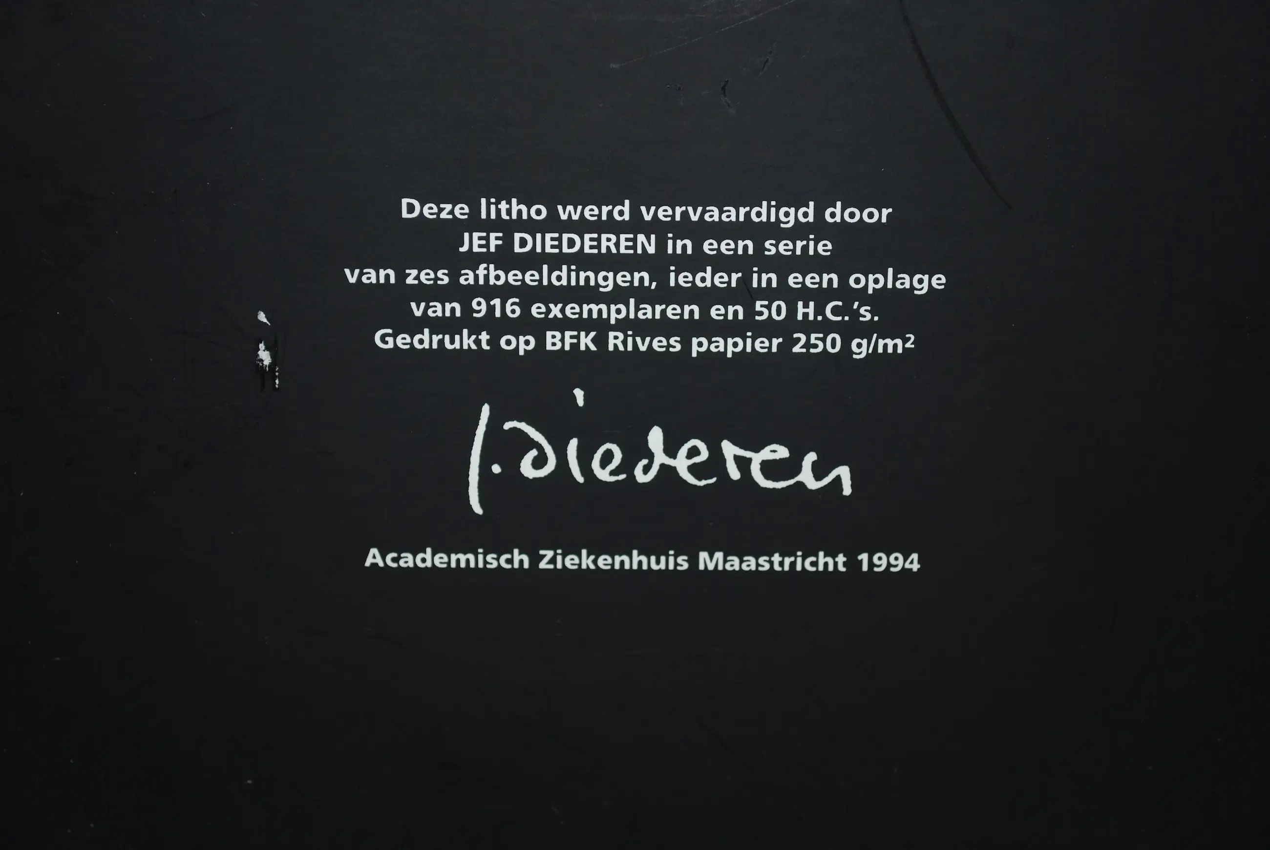 * Litho van Jef Diederen, maat 30x21 cm, licht bevestigd op papier, in prima staat. Achter glas in een witte houten lijst, 35x26 cm.