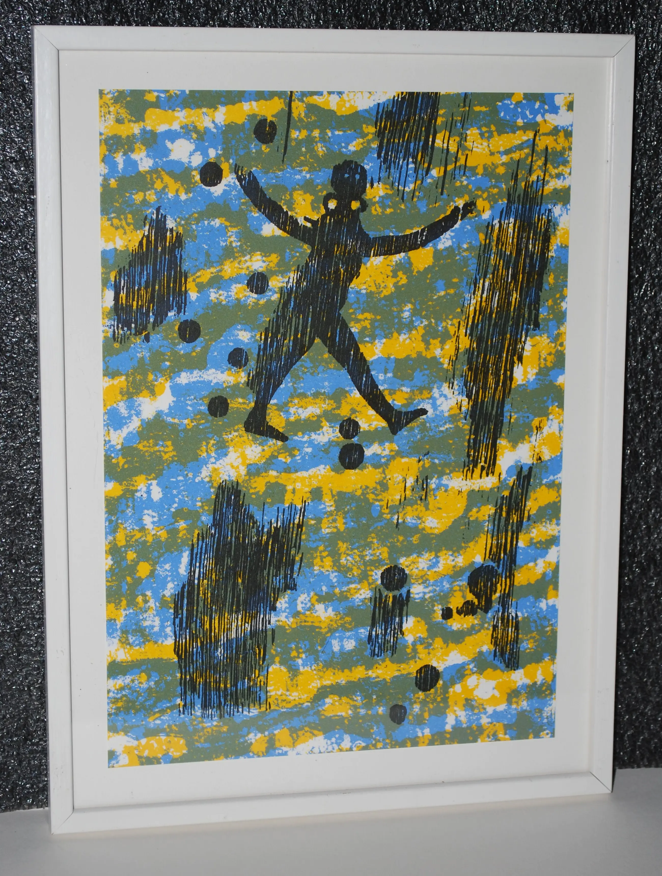 * Zeefdruk op katoenzijde, met een zeer ruime omslag. Los gevouwen om zuurvrij karton. In een witte houten lijst achter glas. 67x53 cm.