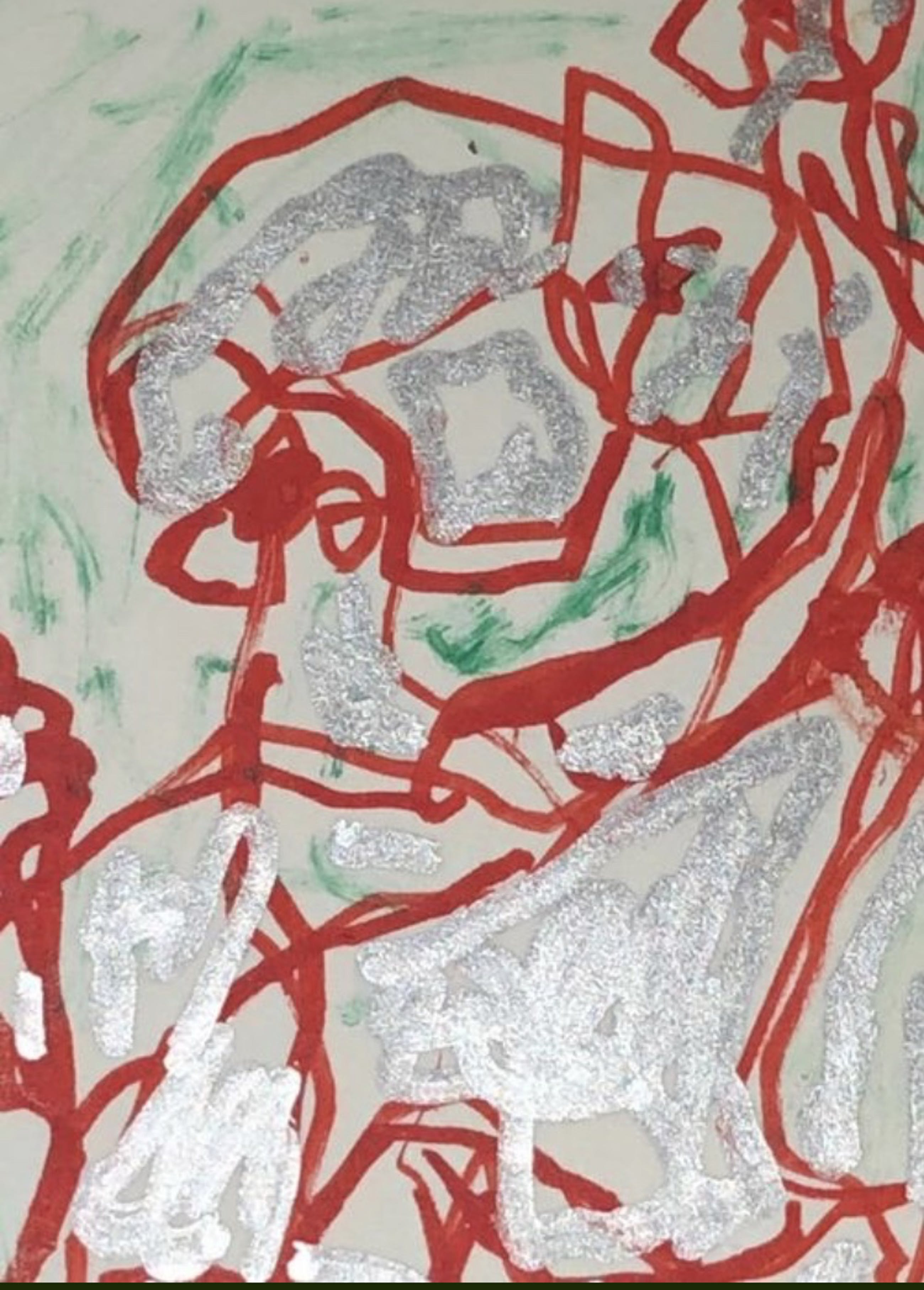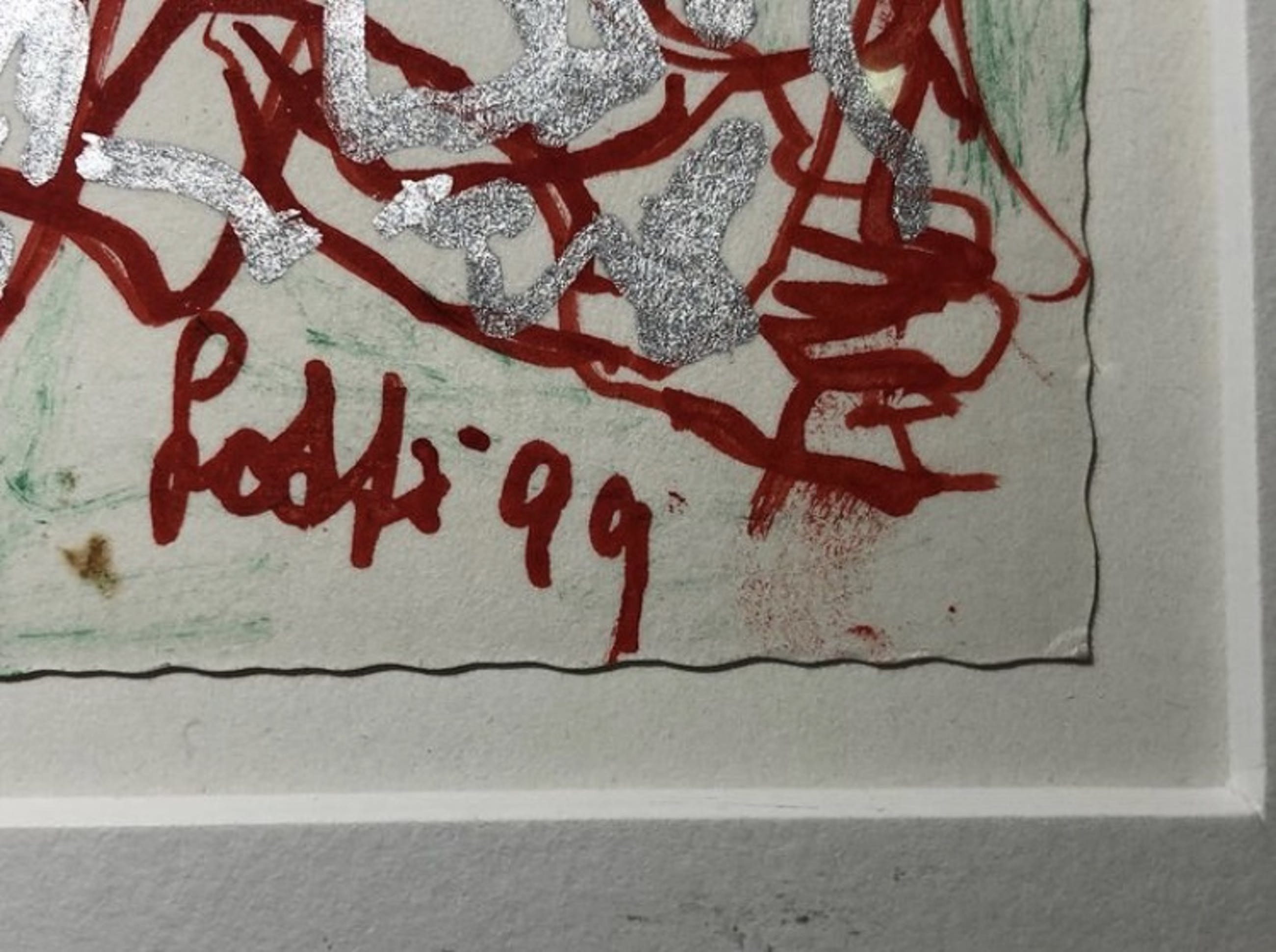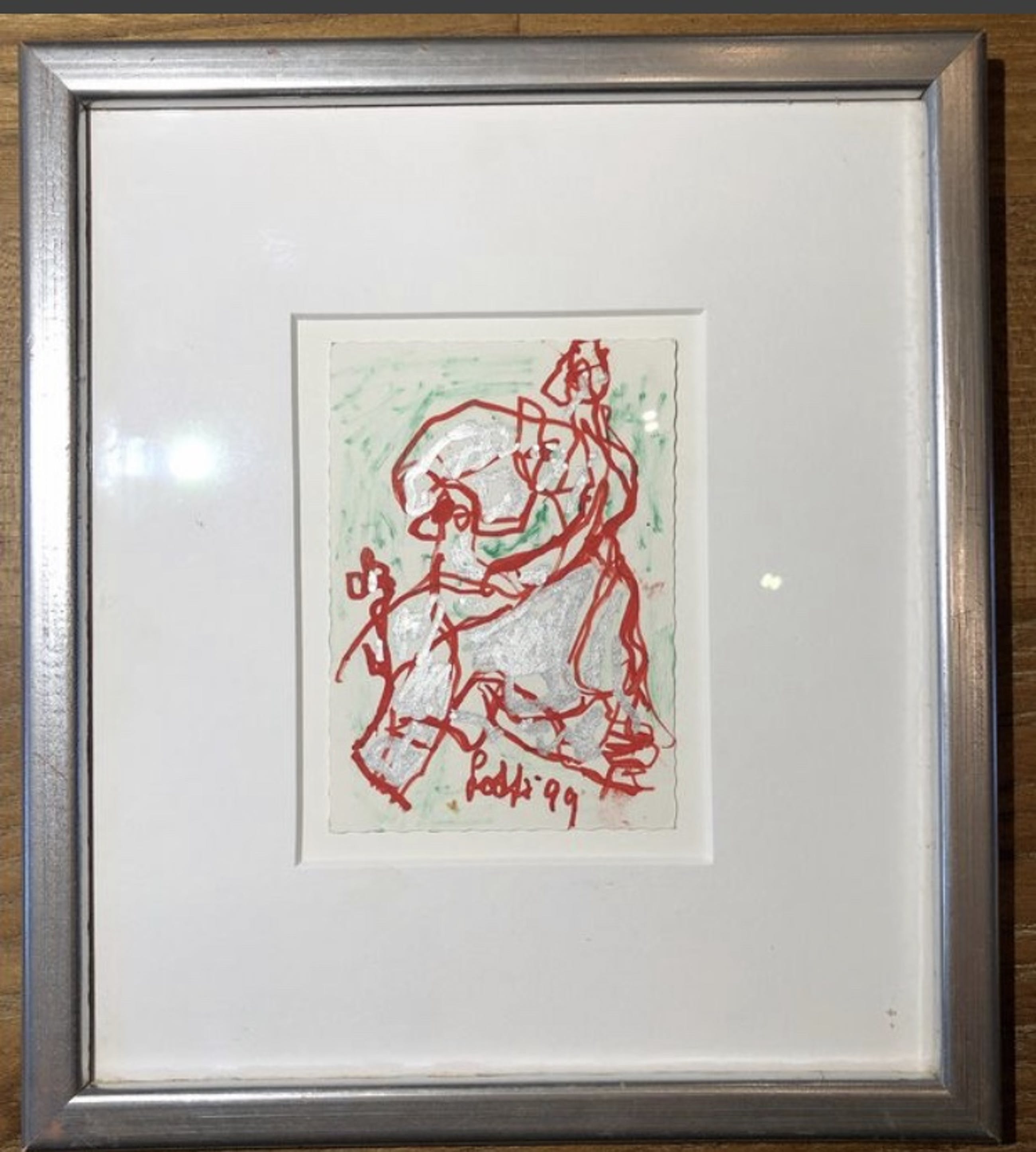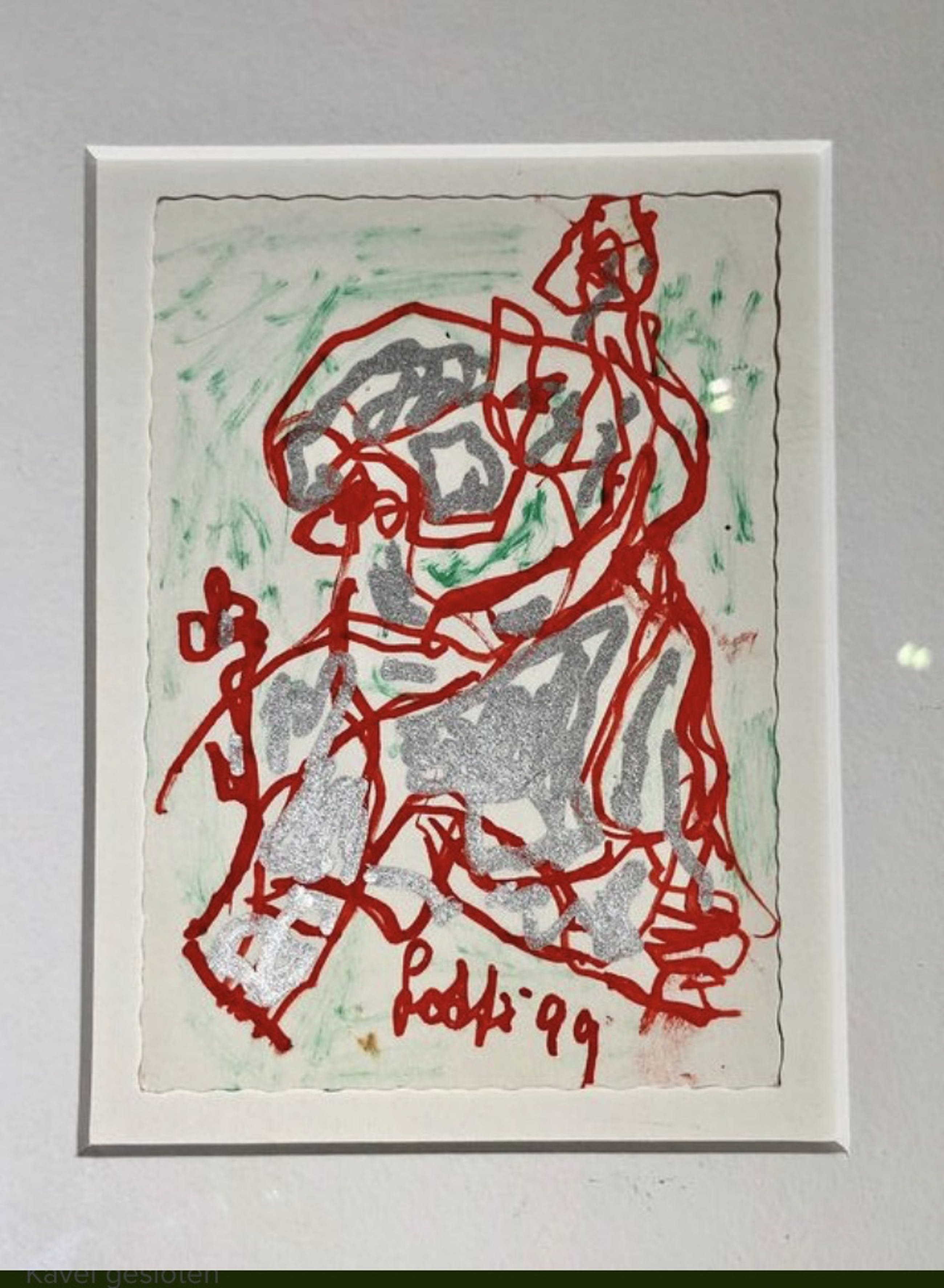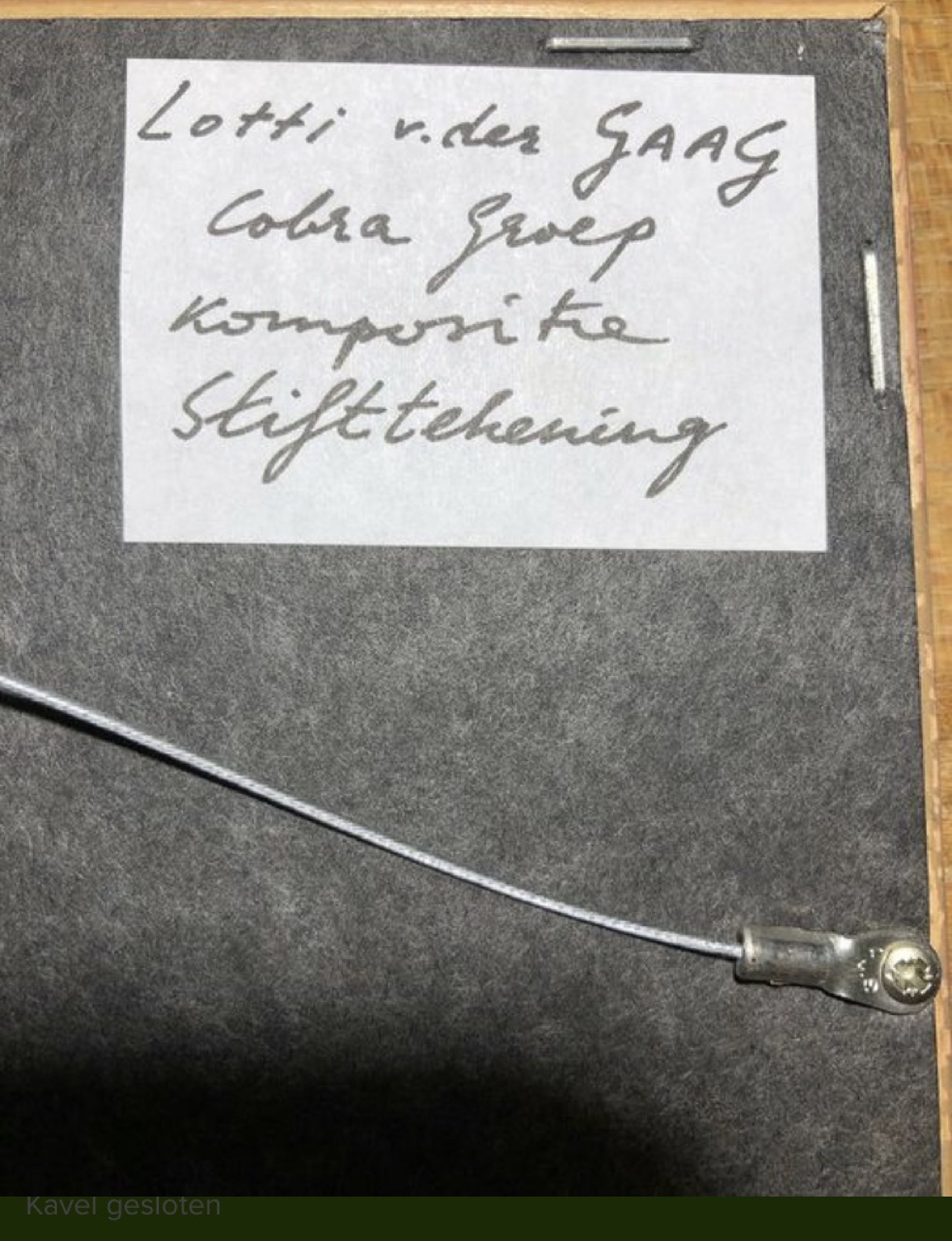 Mooie werkje met viltstift door mevrouw Lotti Van der Gaag. Deze kunstenares heeft op het einde van haar leven met Karel Appel en Corneille opgetrokken in Parijs en zich zo in de Cobra-beweging gemengd.