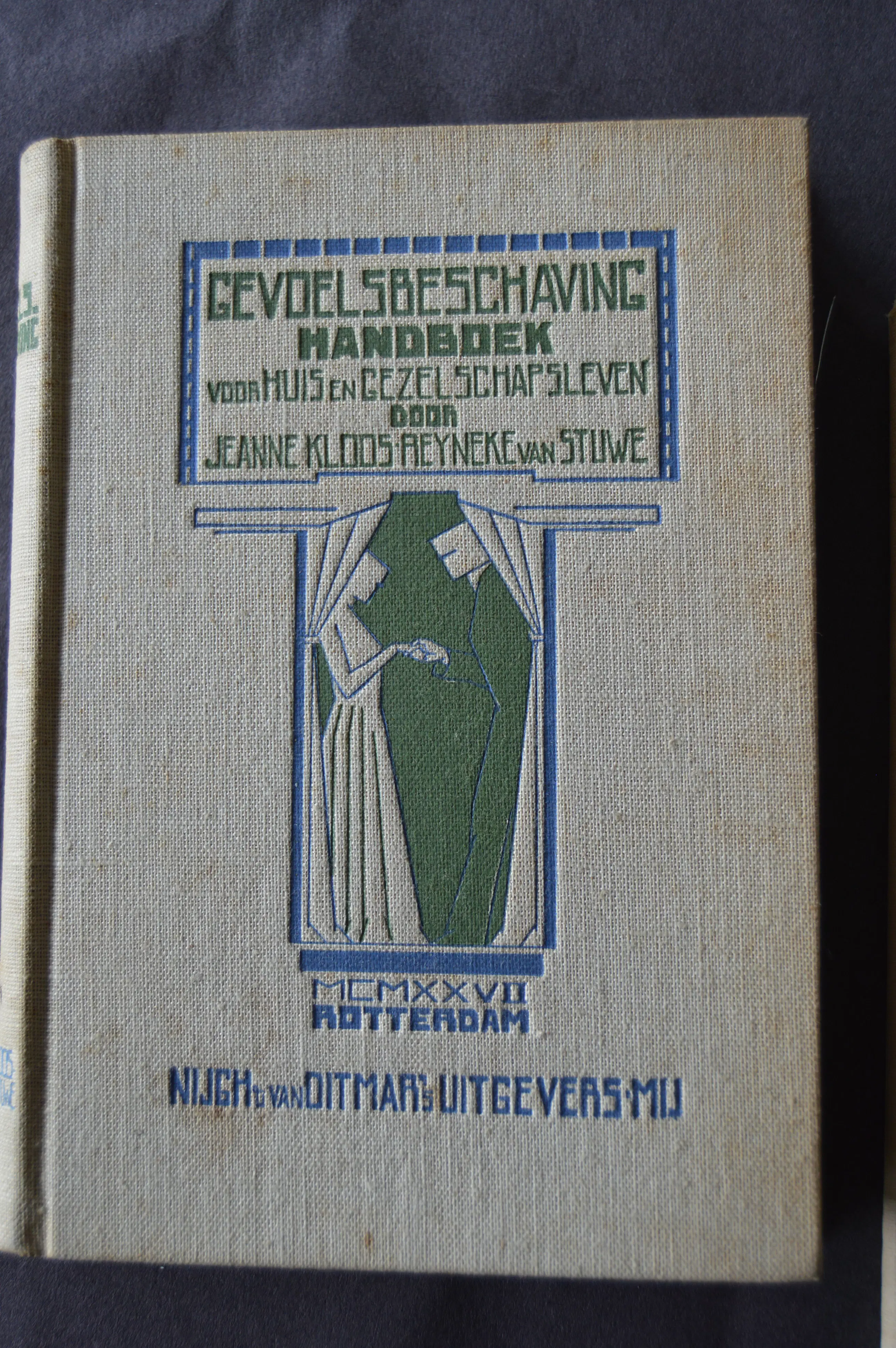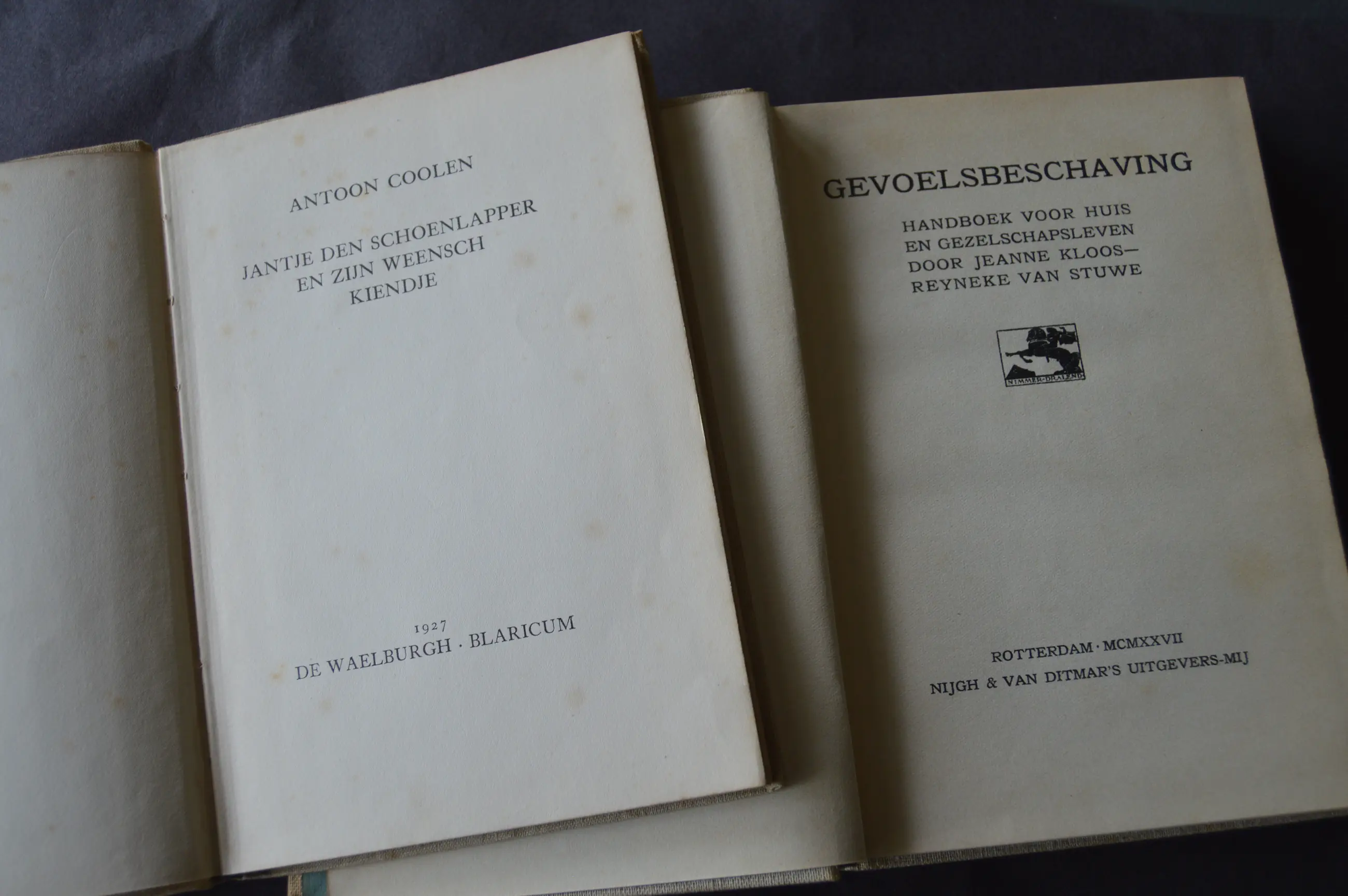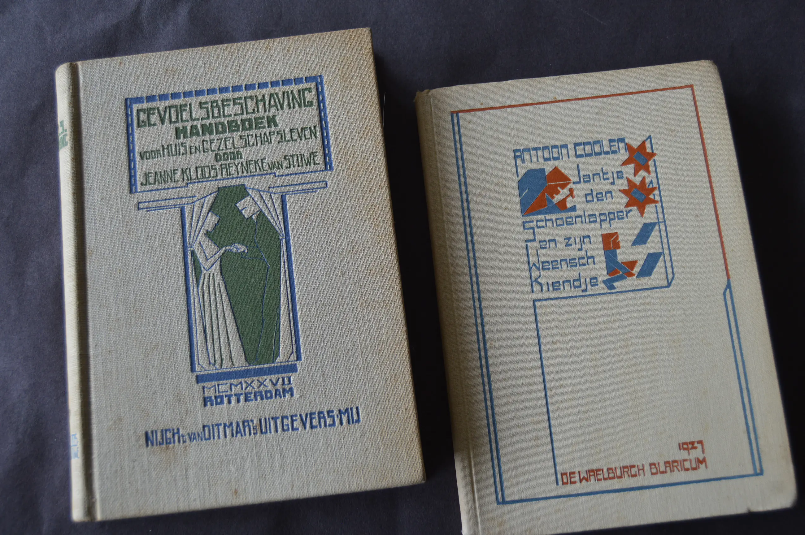 Gevoelsbeschaving. J. Kloos-Reyneke van Stuwe. 168pp Jantje den Schoenlapper. Antoon Coolen. 61pp Beiden HC. Beiden met prachtig bandontwerp van Lou Loenen.