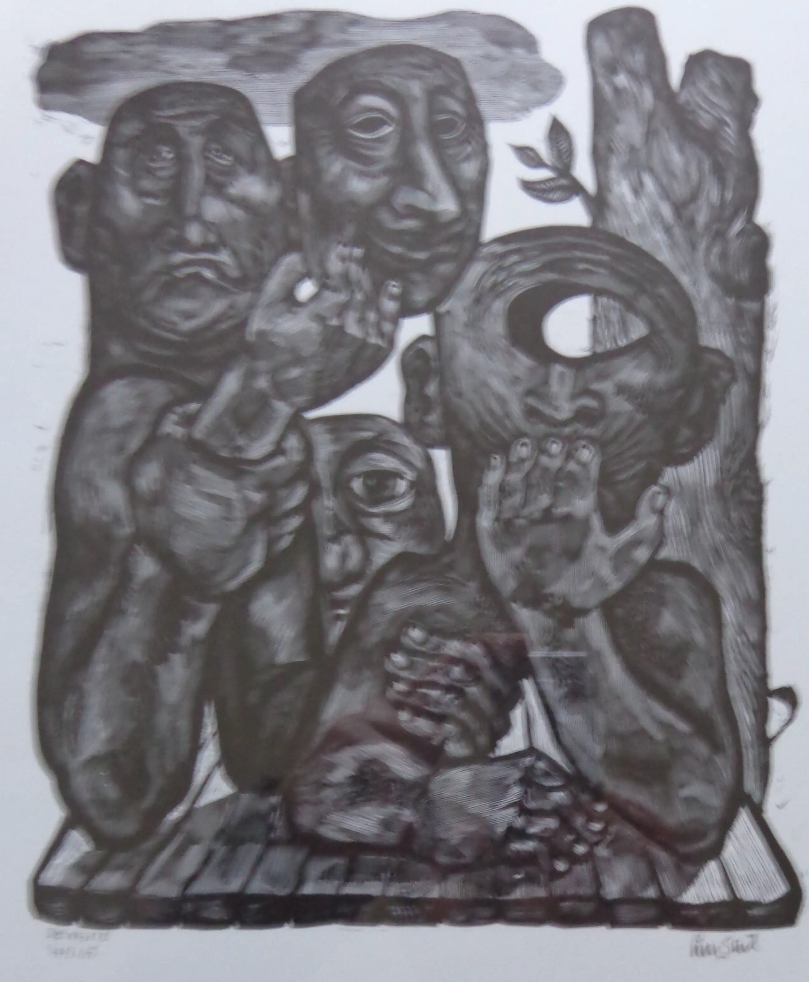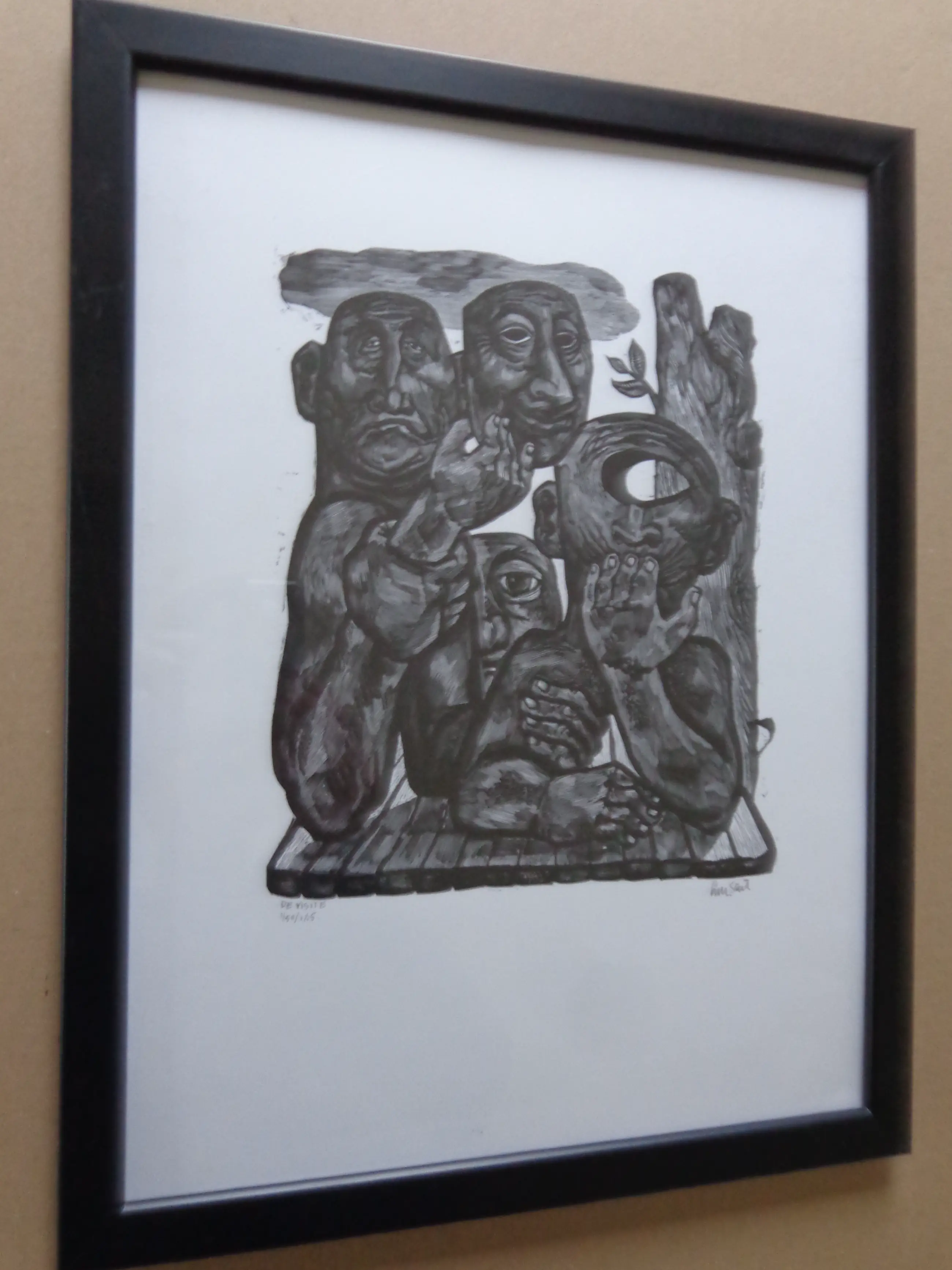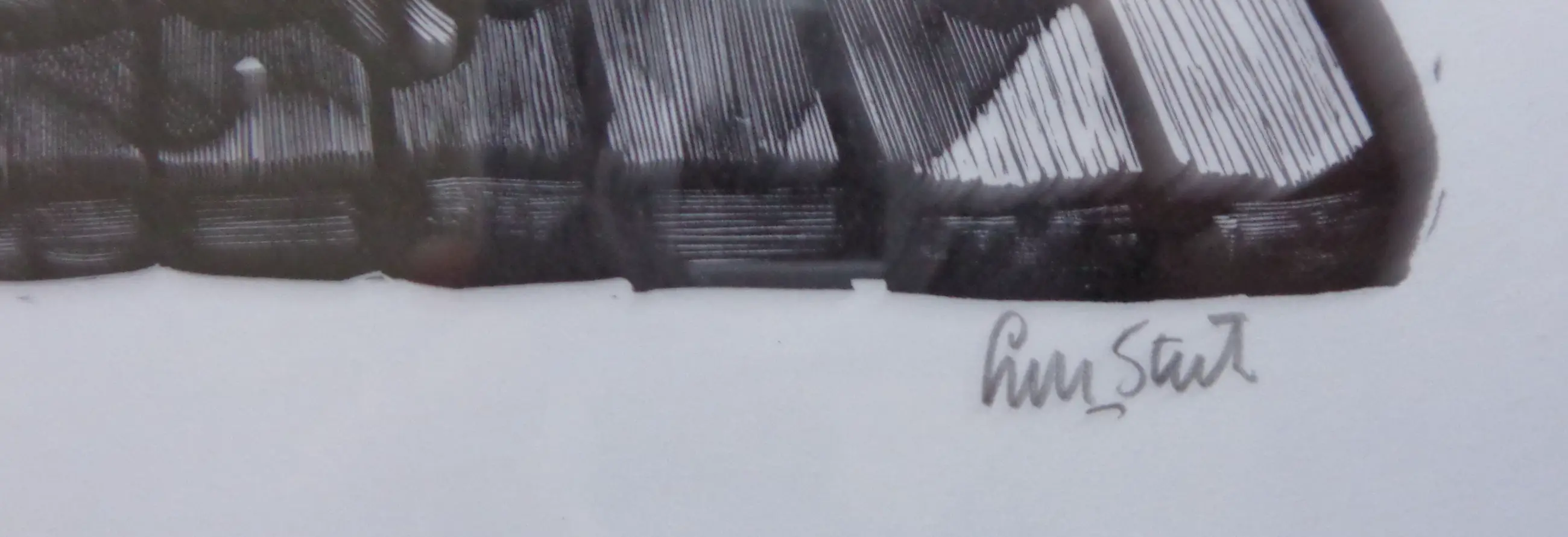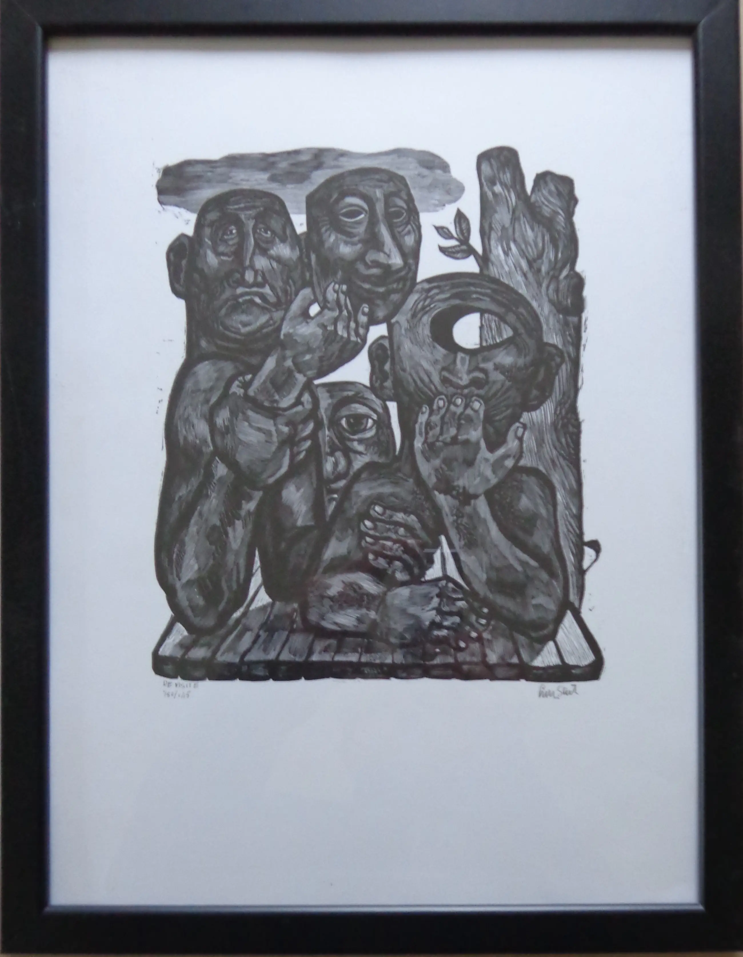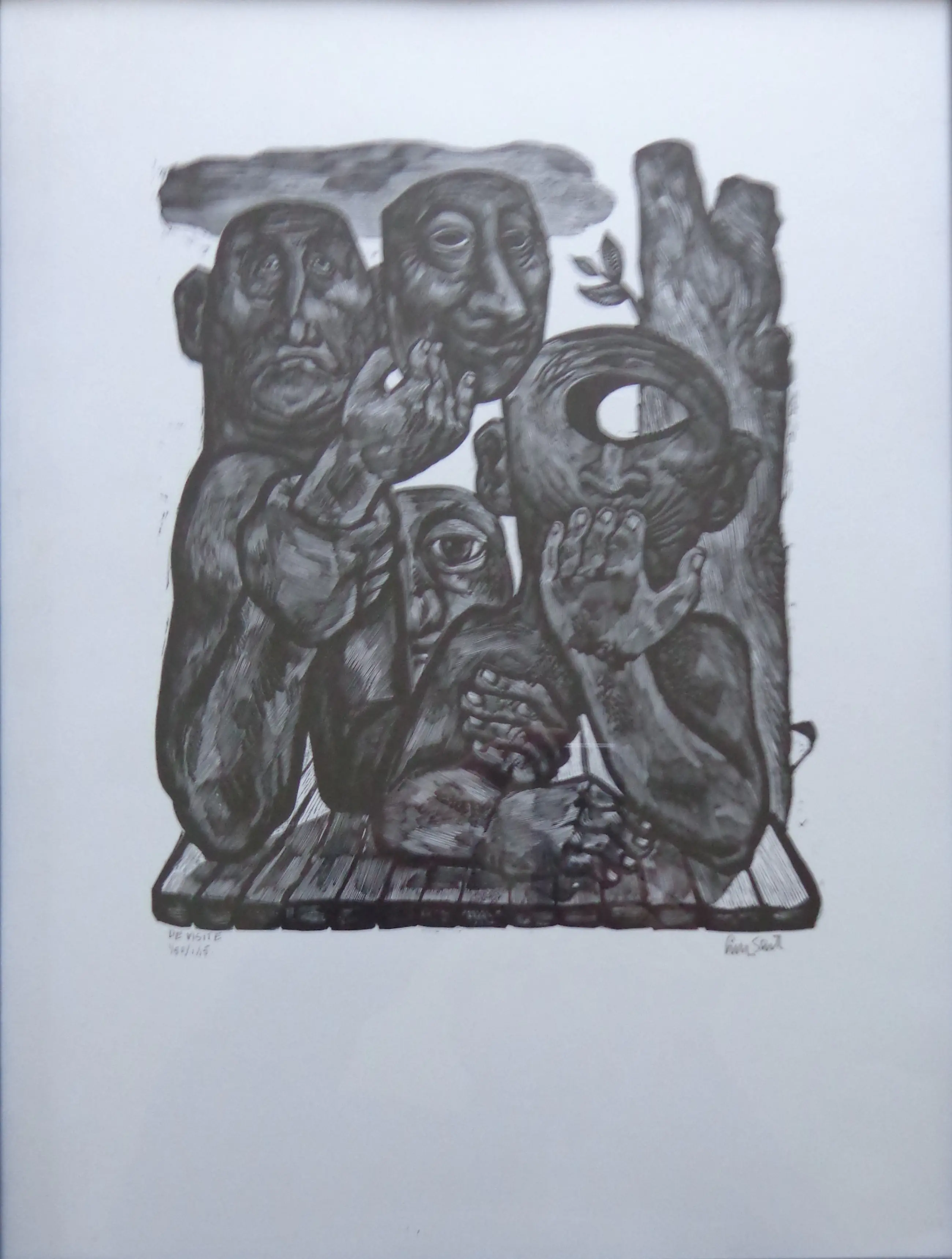 Lou Strik (1921-2011). Titel: "De Visite". Zwart-wit linosnede op papier. Gesigneerd met potlood. Ex.nr. 1/50 1/15 (?). Blad: 39x29cm. Kader: 43x33cm. Goede staat.