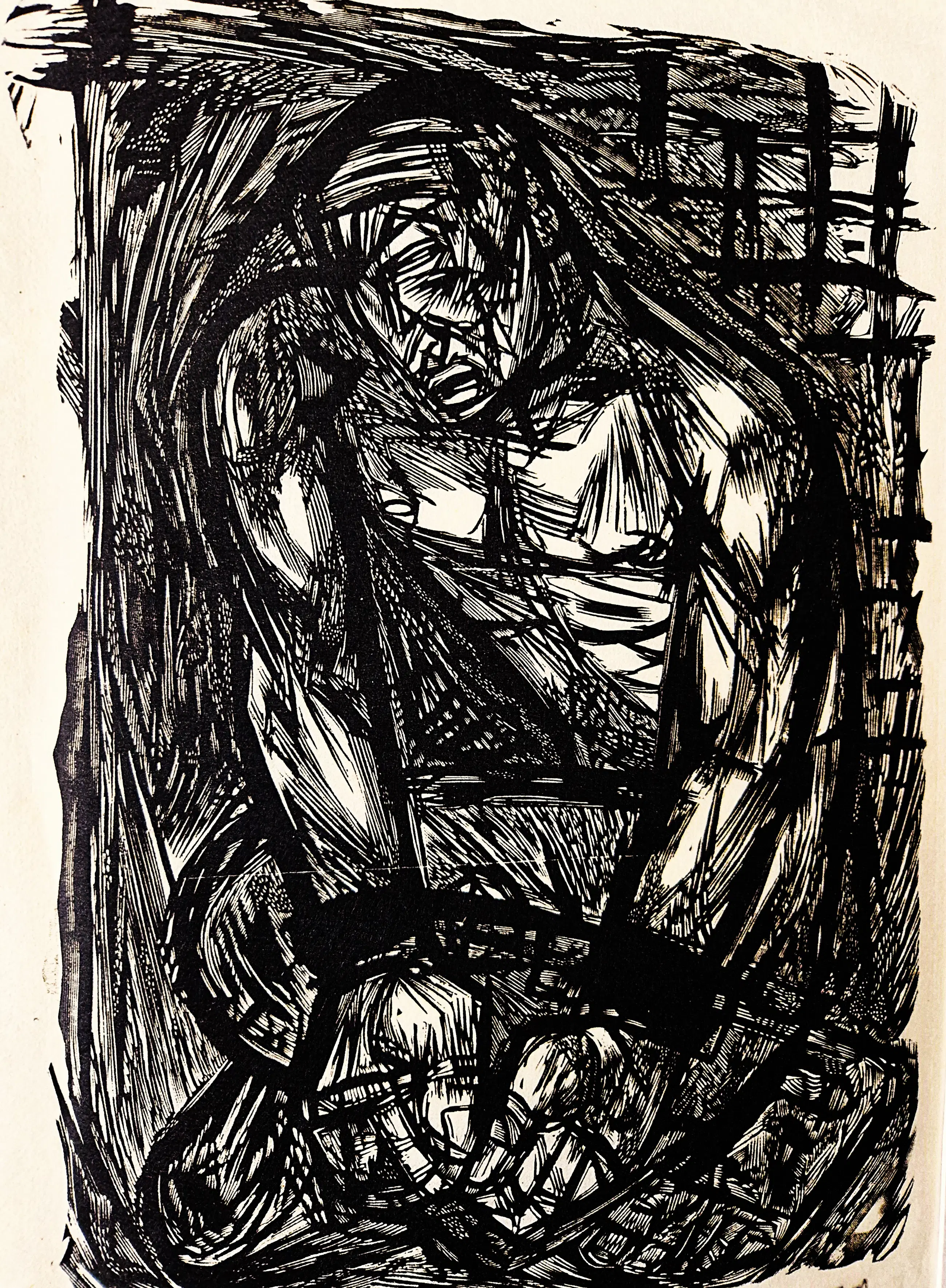 Lou Strik - Grote monochrome Hout/Linosnede "geketende slaaf" potlood-gesigneerd