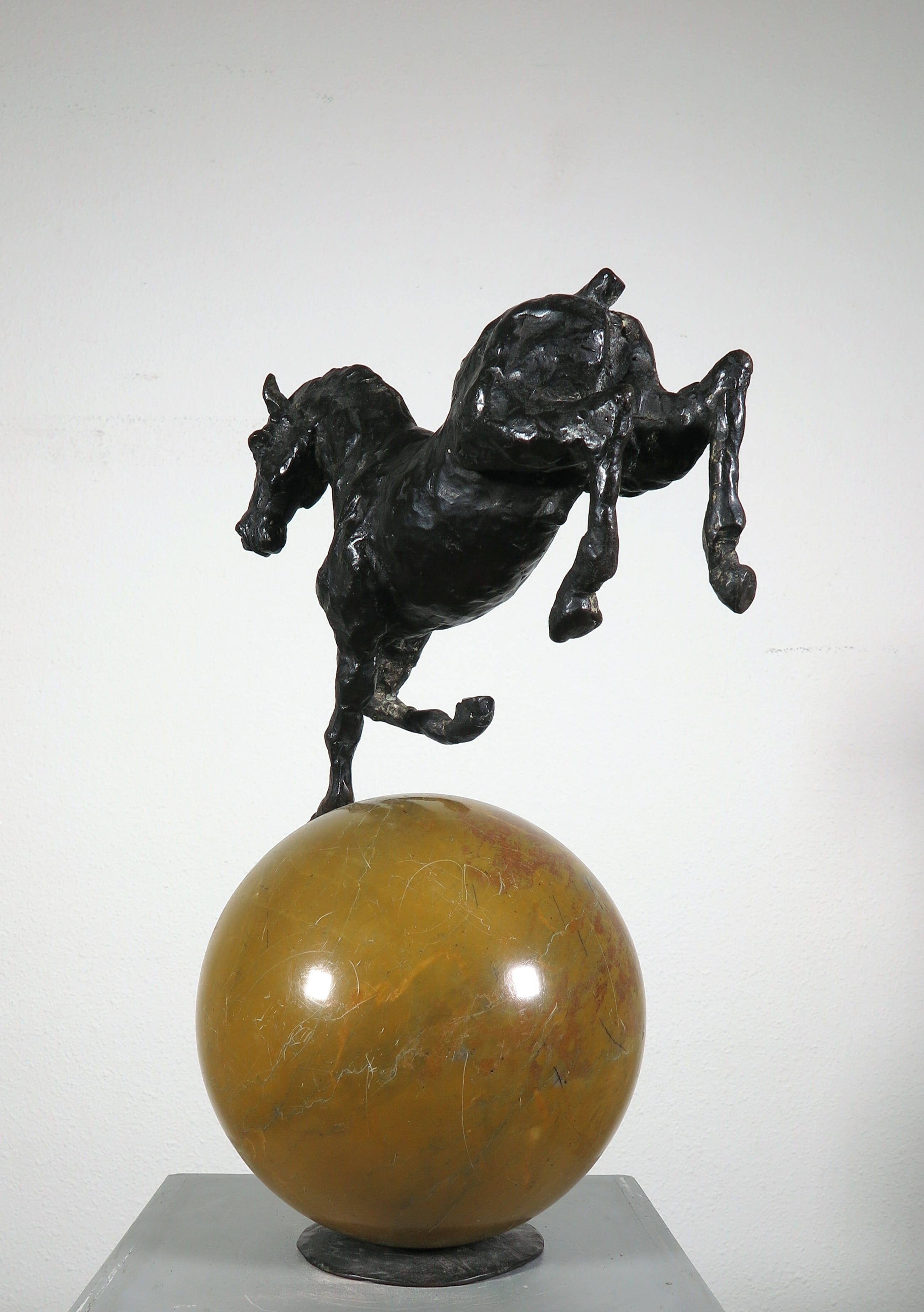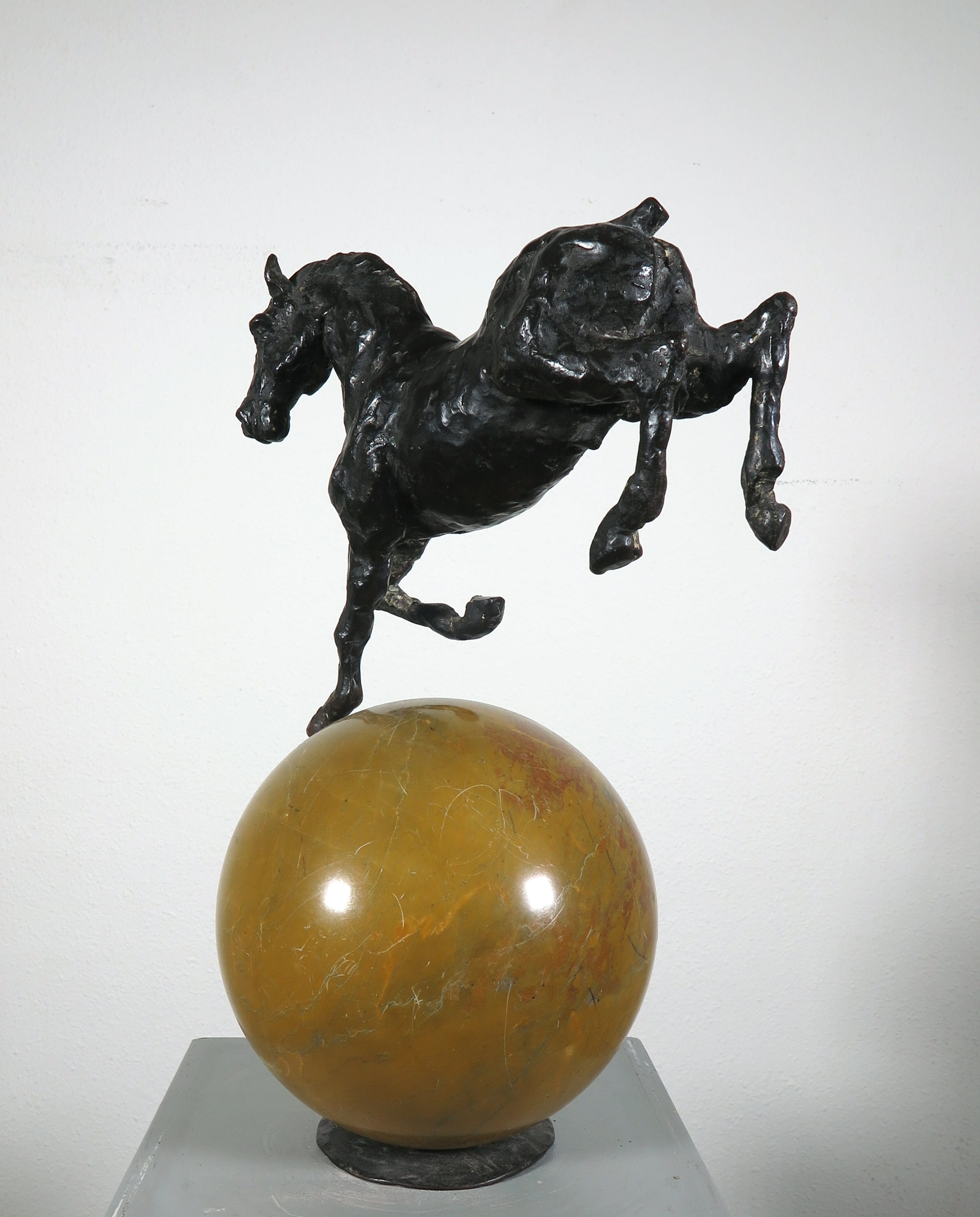 Groot bronzen beeld van een galopperend paard, balancerend op een natuurstenen (marmer?) bol, op een bronzen voet.