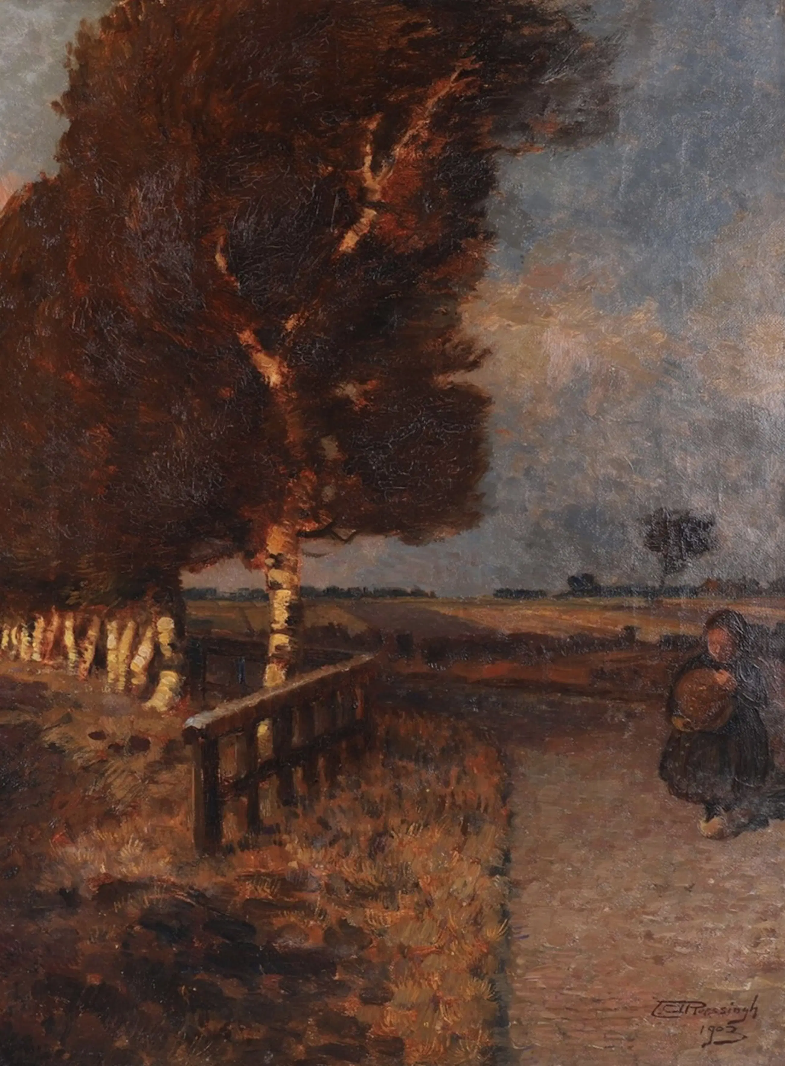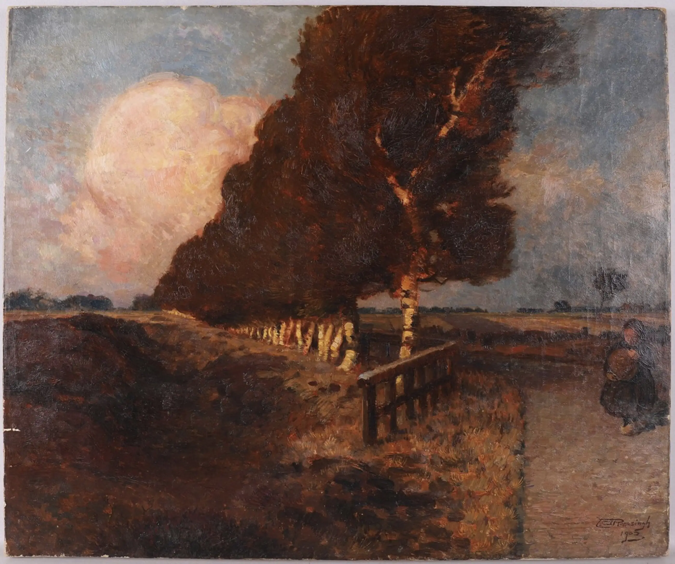 Aangeboden olieverf op doek van de Drentse schilder Louis Albert Roessingh (1873-1951) voorstellende een heide landschap in de buurt van Beilen en Elp. Afmetingen 50 x 60 cm en rechtsonder gesigneerd en gedateerd. Achterop het doek is het werk beschreven en nogmaals gesigneerd door de kunstenaar.