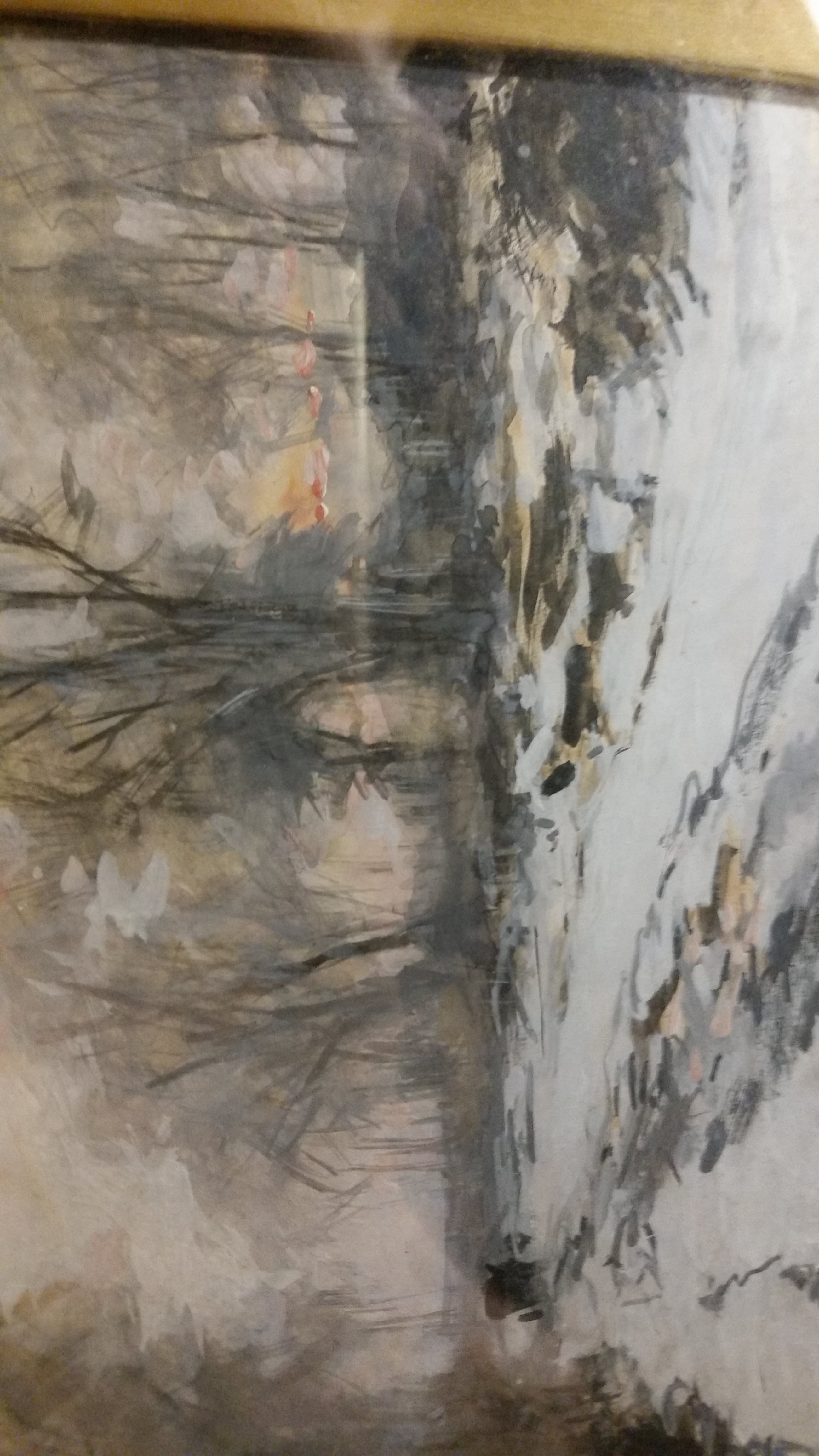 De aquarel is zorgvuldig achter glas ingelijst, en duidelijk nooit eruit geweest. De lijst heeft wel enige beschadiginkjes. Het werkje is in een paasepartout gevat, welke in de eigenlijke lijst gemonteerd is, en vrijwel zeker de originele lijst. | |||