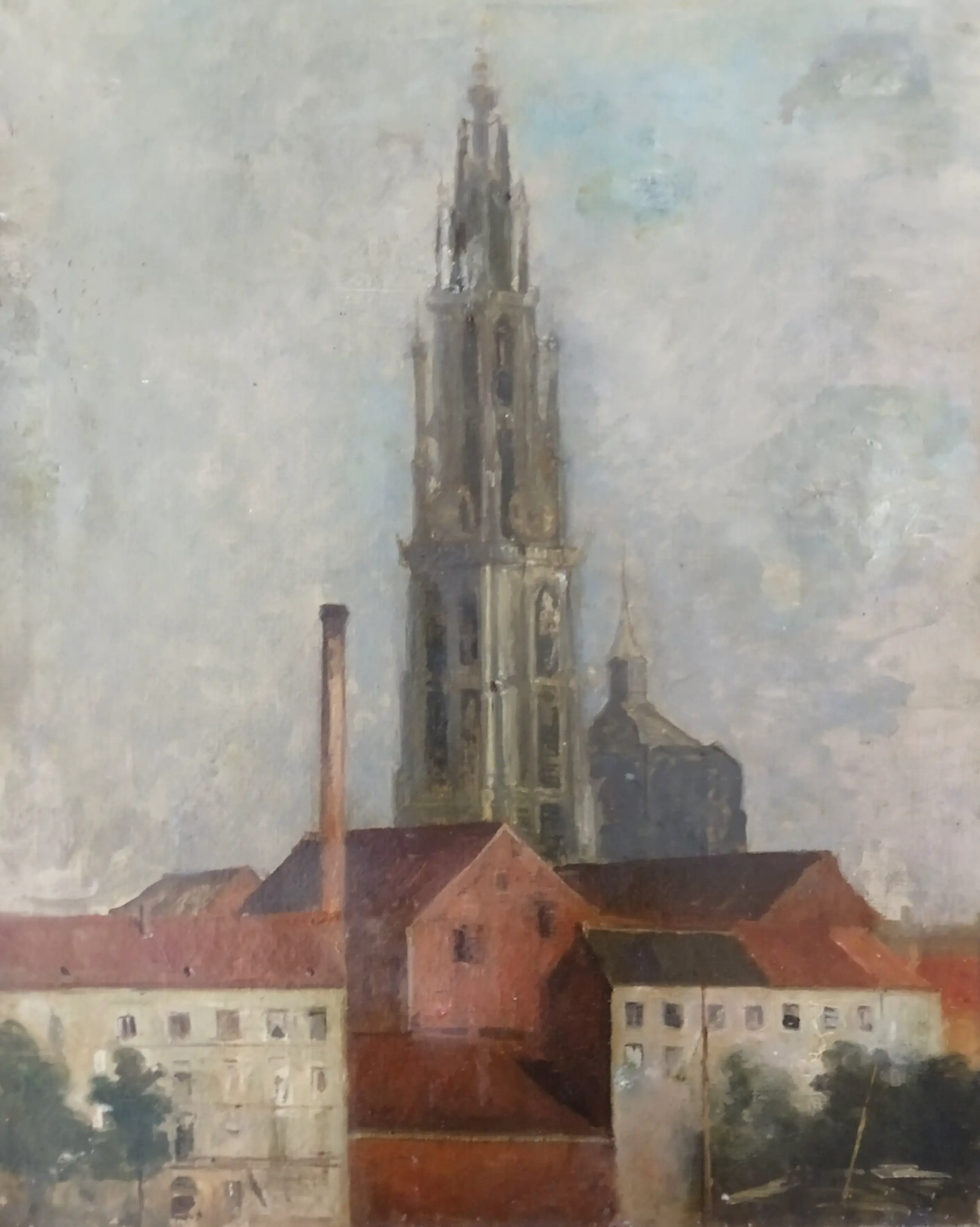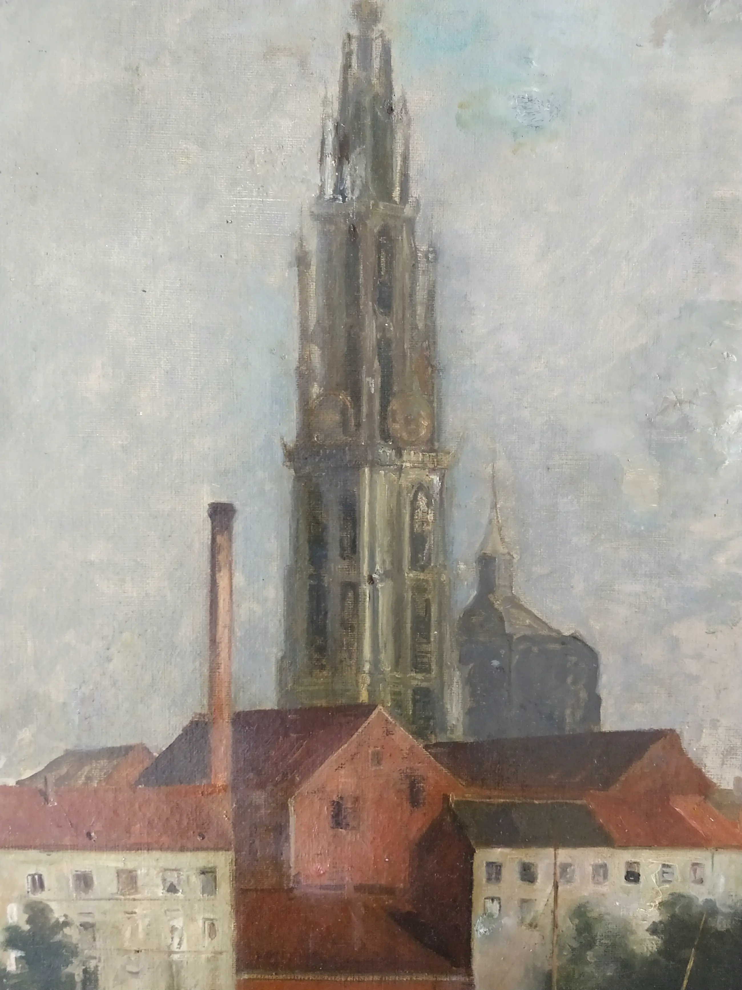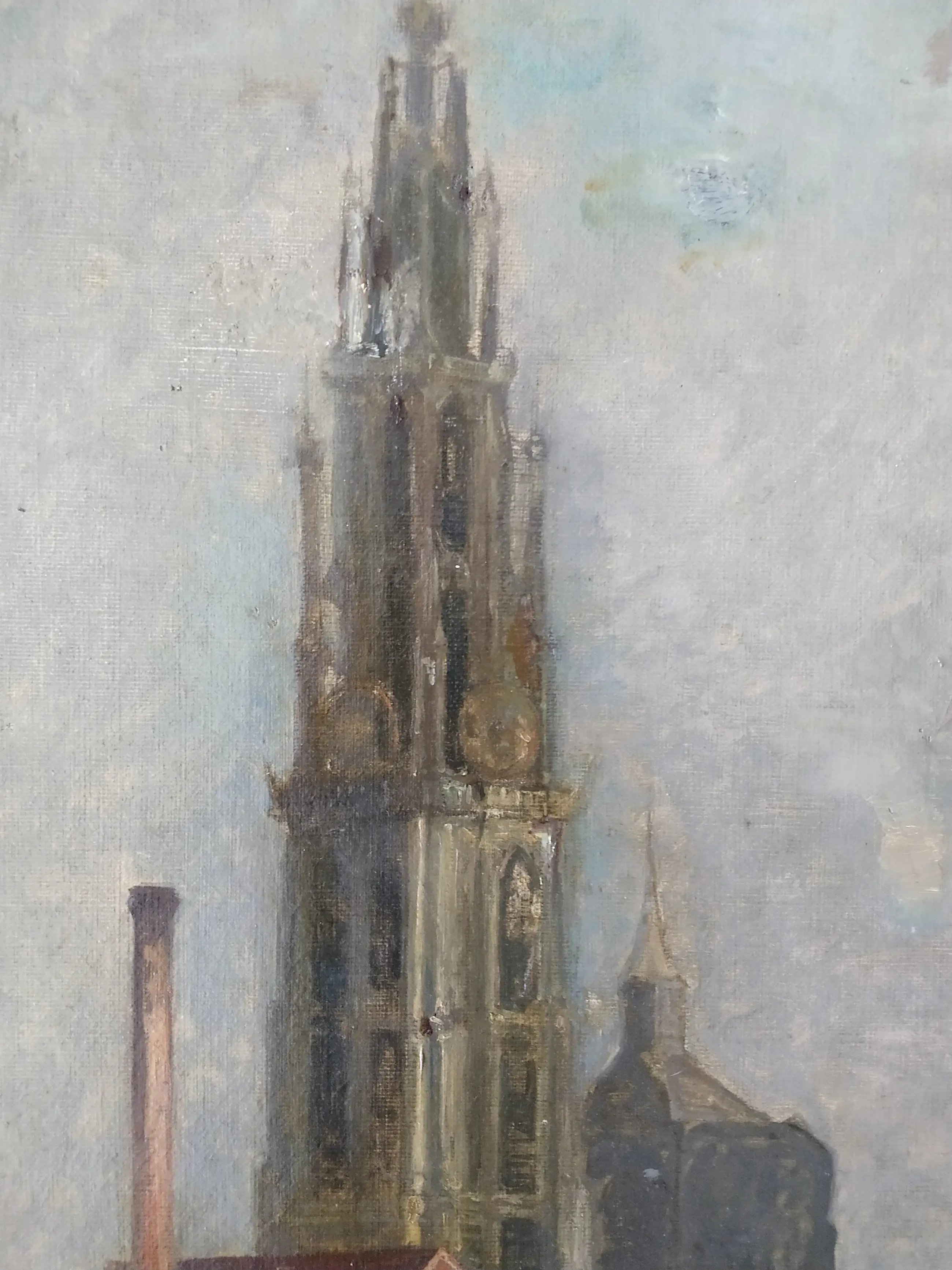 Louis Artan (1837-1890). Stadsgezicht met kathedraal. Het schilderij heeft een goed aanzicht. Wel heeft het stuk meerdere herstellingen, ouderdomssporen en gebruikssporen. Gesigneerd op de achterzijde.