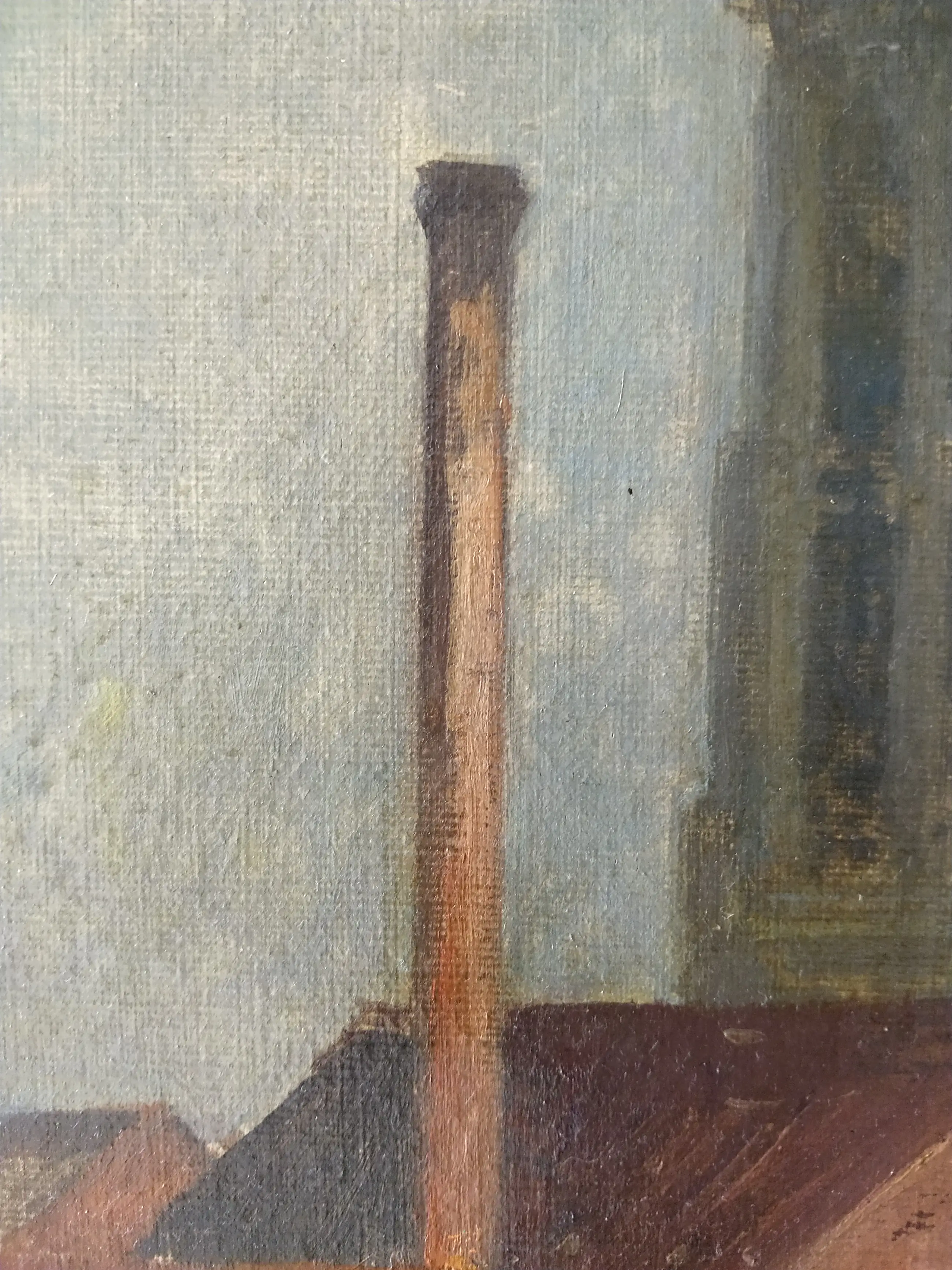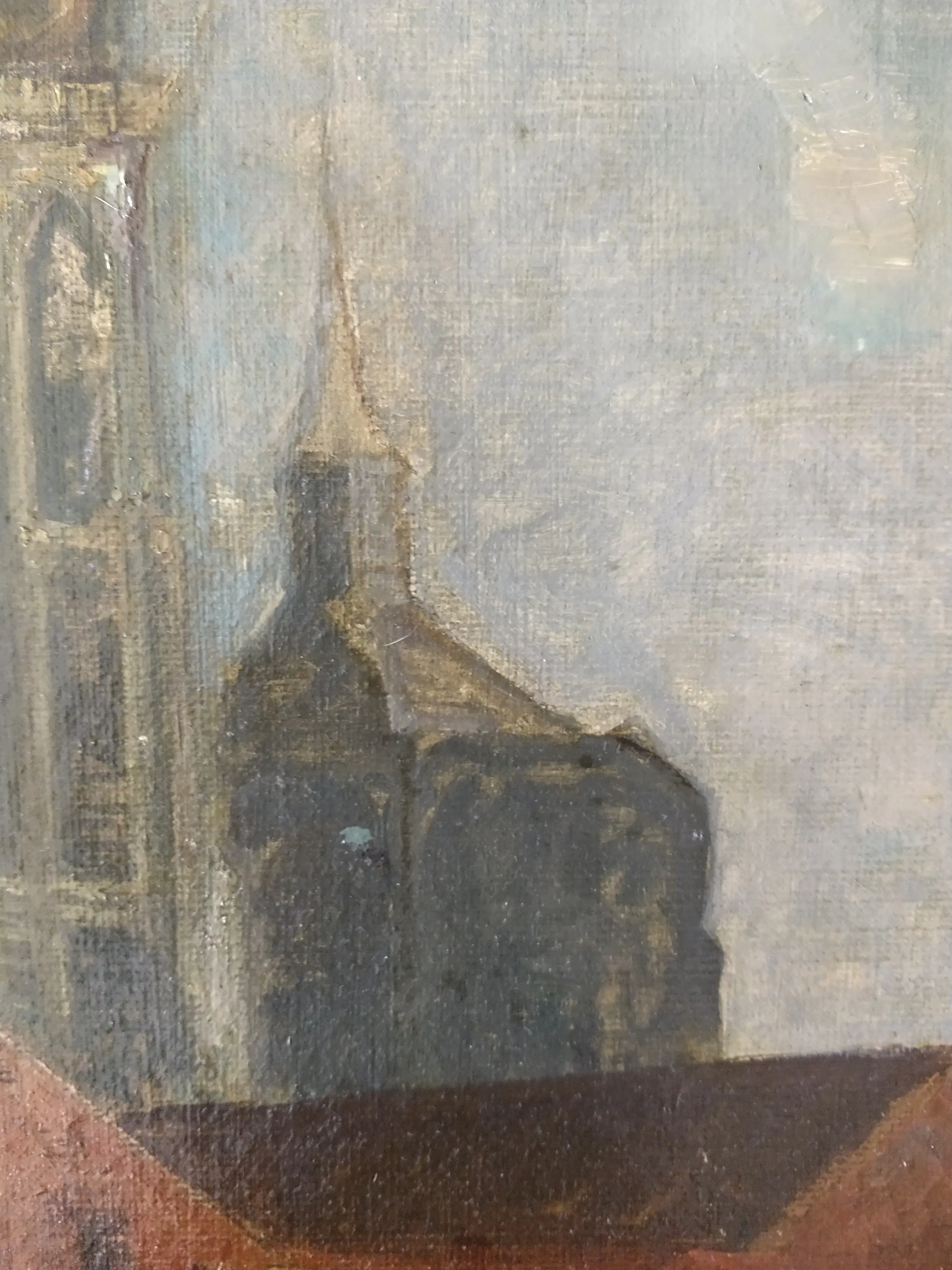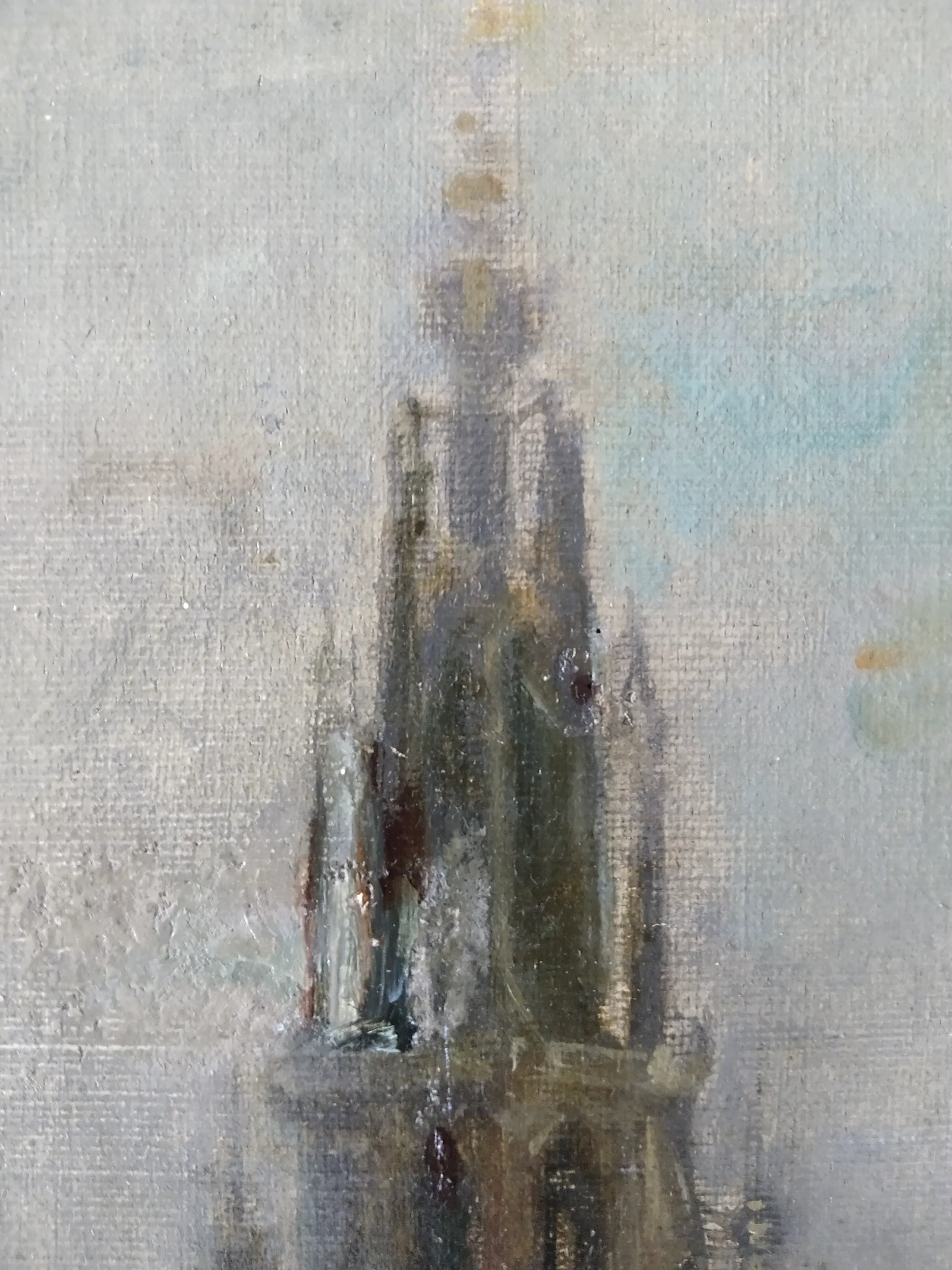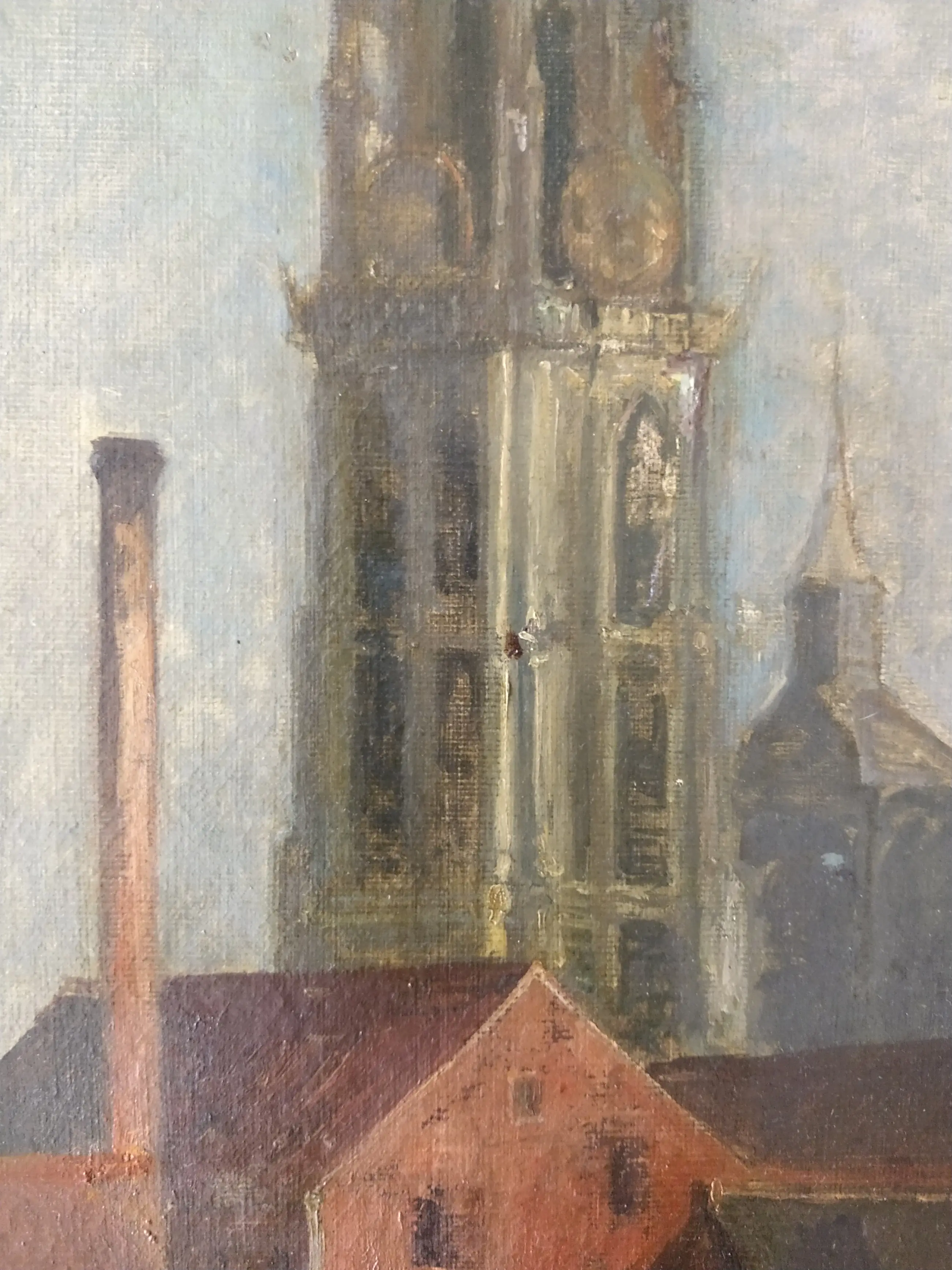 Louis Artan (1837-1890). Stadsgezicht met kathedraal. Het schilderij heeft een goed aanzicht. Wel heeft het stuk meerdere herstellingen, ouderdomssporen en gebruikssporen. Gesigneerd op de achterzijde.
