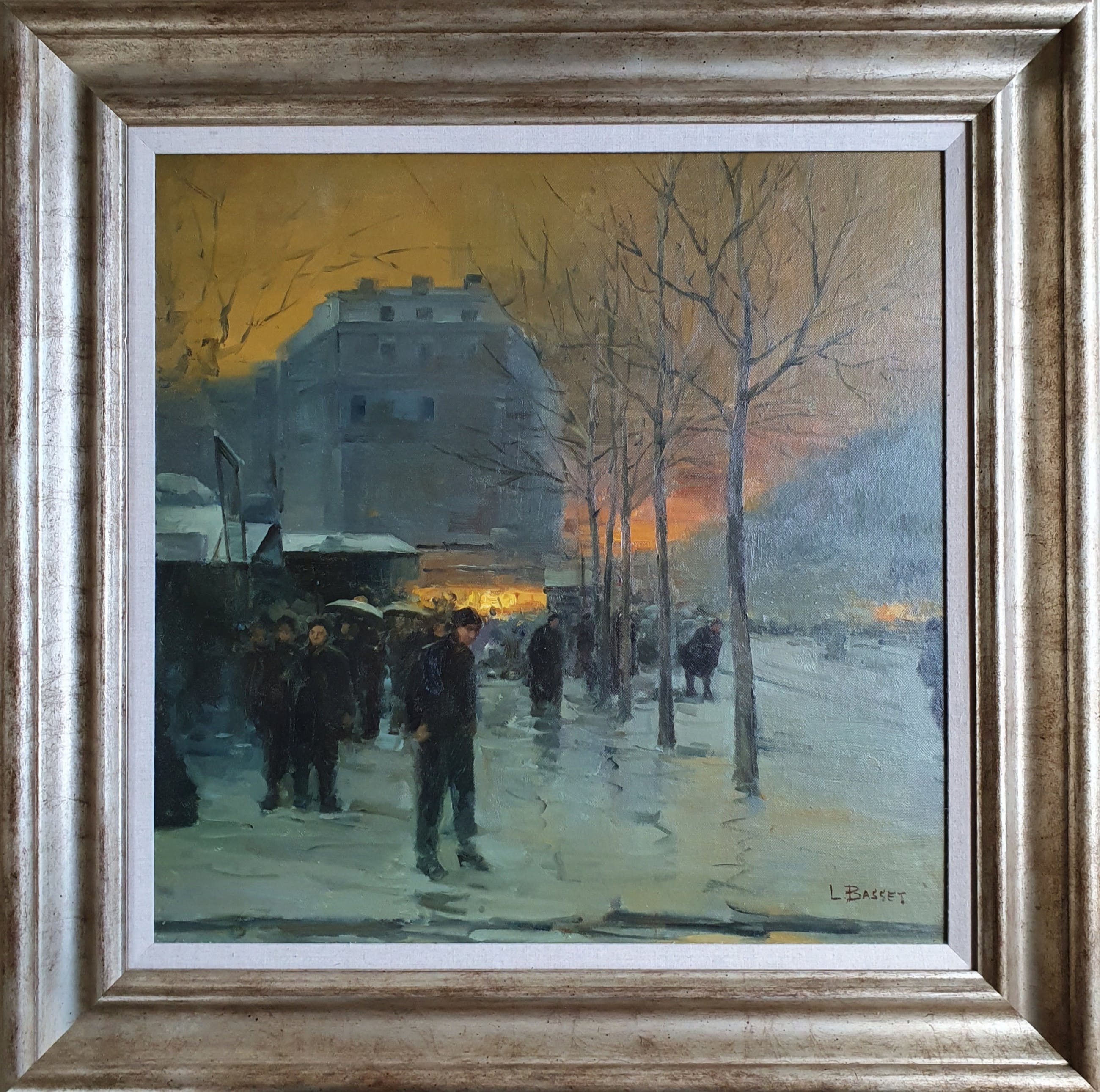 Mooi stadszicht van Parijs in zachte 'vage' tinten. Louis Basset is een Franse kunstenaar die graag stadsgezichten maakte, meestal Parijs met paraderende dames met mooie jurken en parasols met leuke winkels met hun luifels met reclame en / of naam van de winkel.