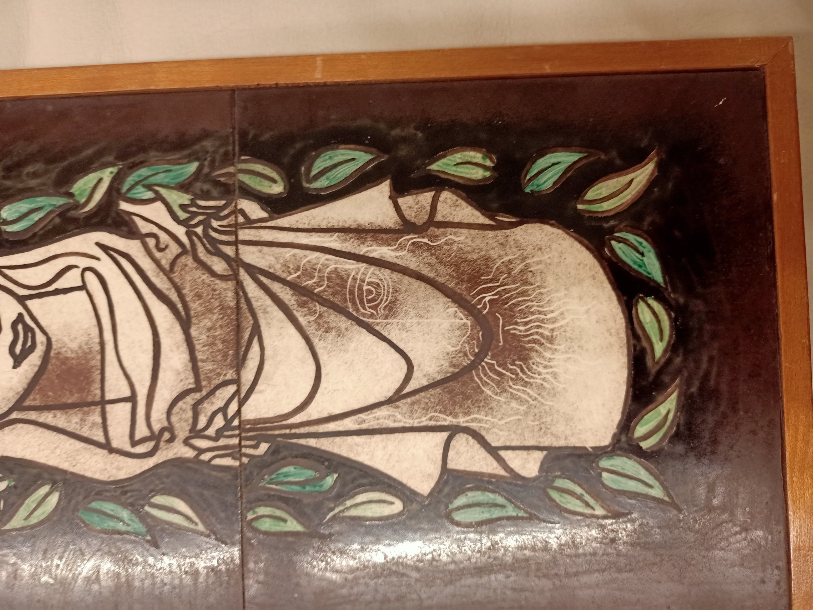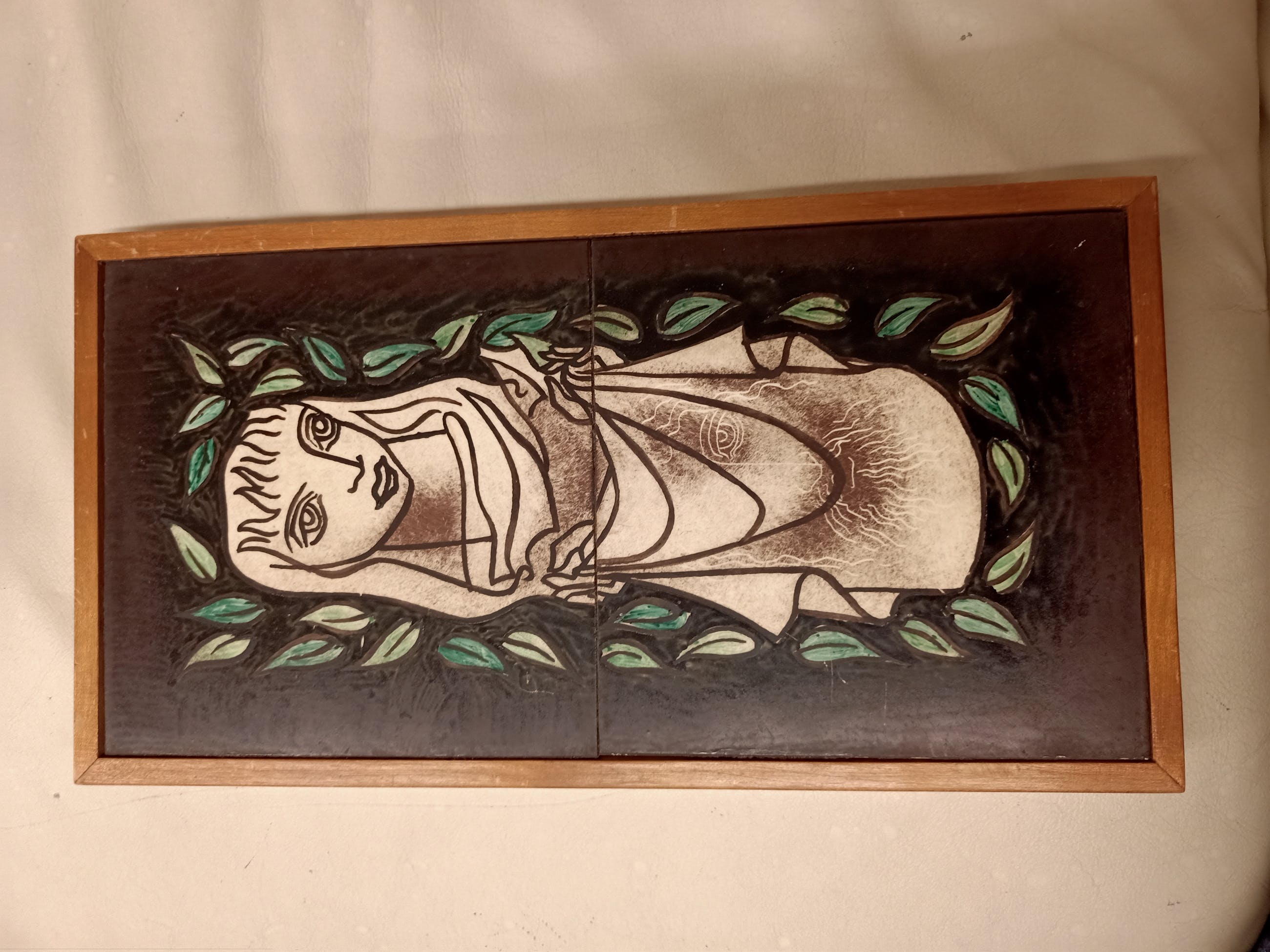 Het is een bijzonder werk op de achterkant staat zijn naam, een soort van Maria met Jezus verwerkt onder in haar gezicht. Het is denk ik een kunststof tegel of echt steen, moeilijk te zien omdat het in een lijst zit. Bijzonder werk.