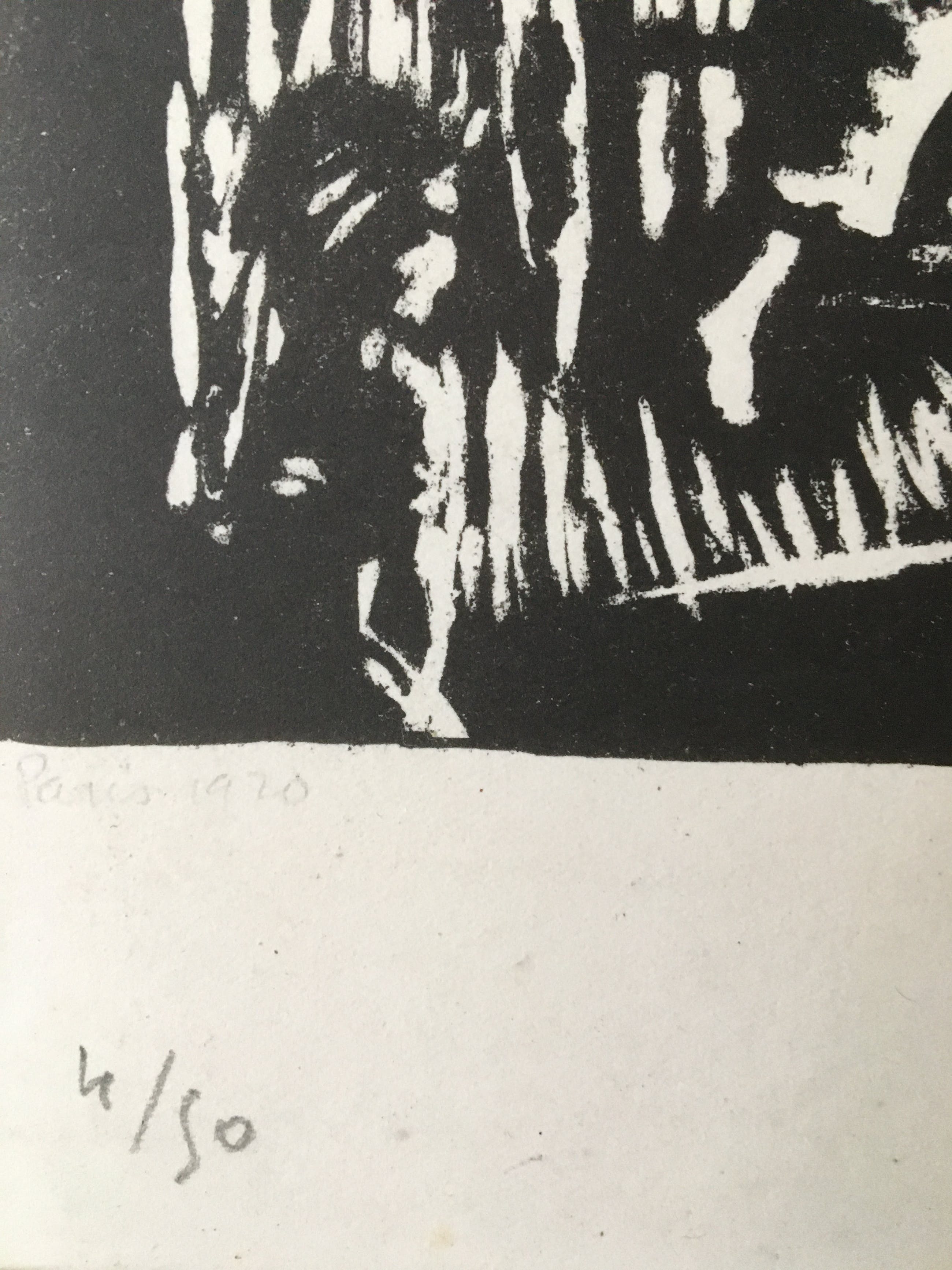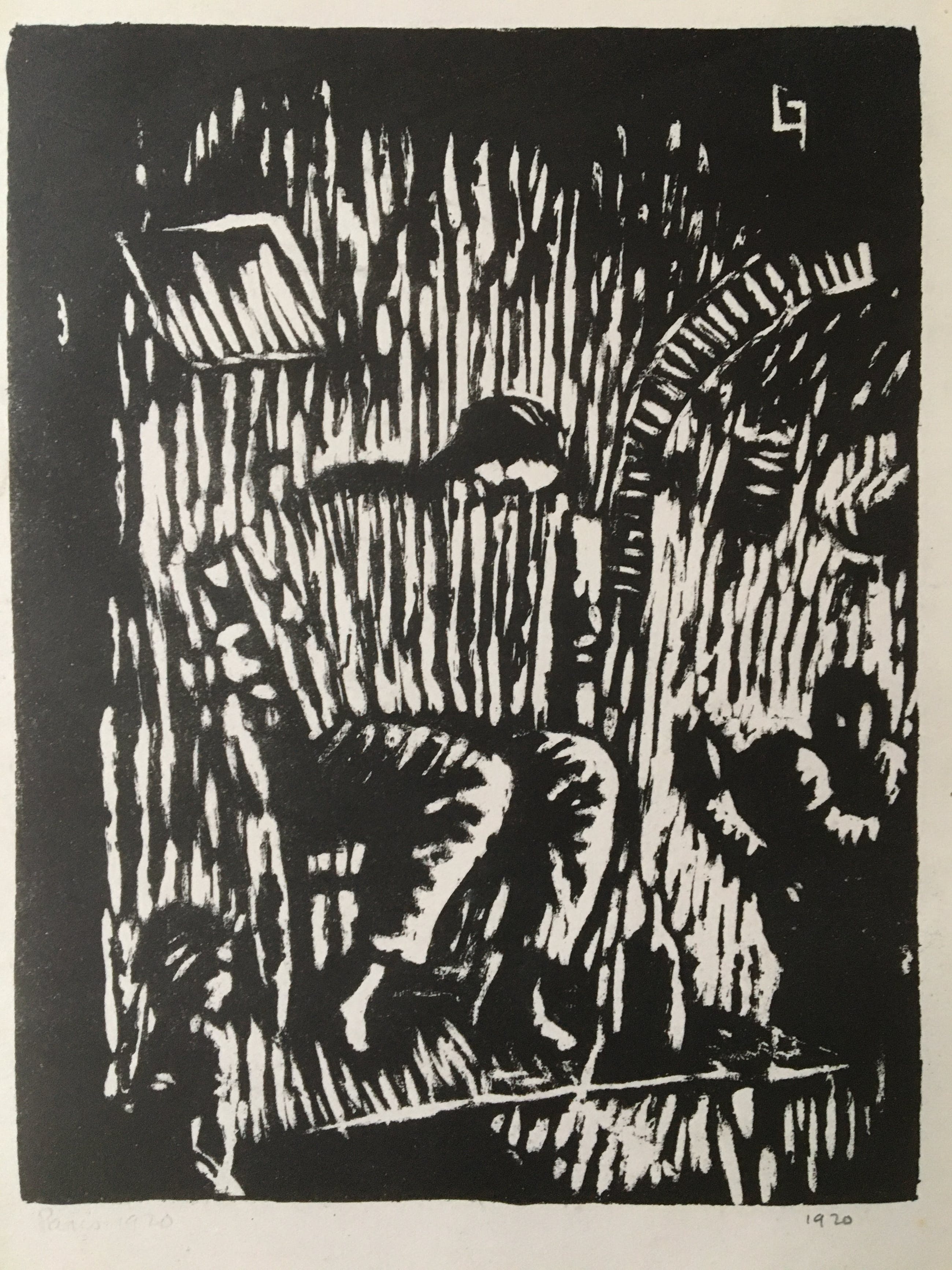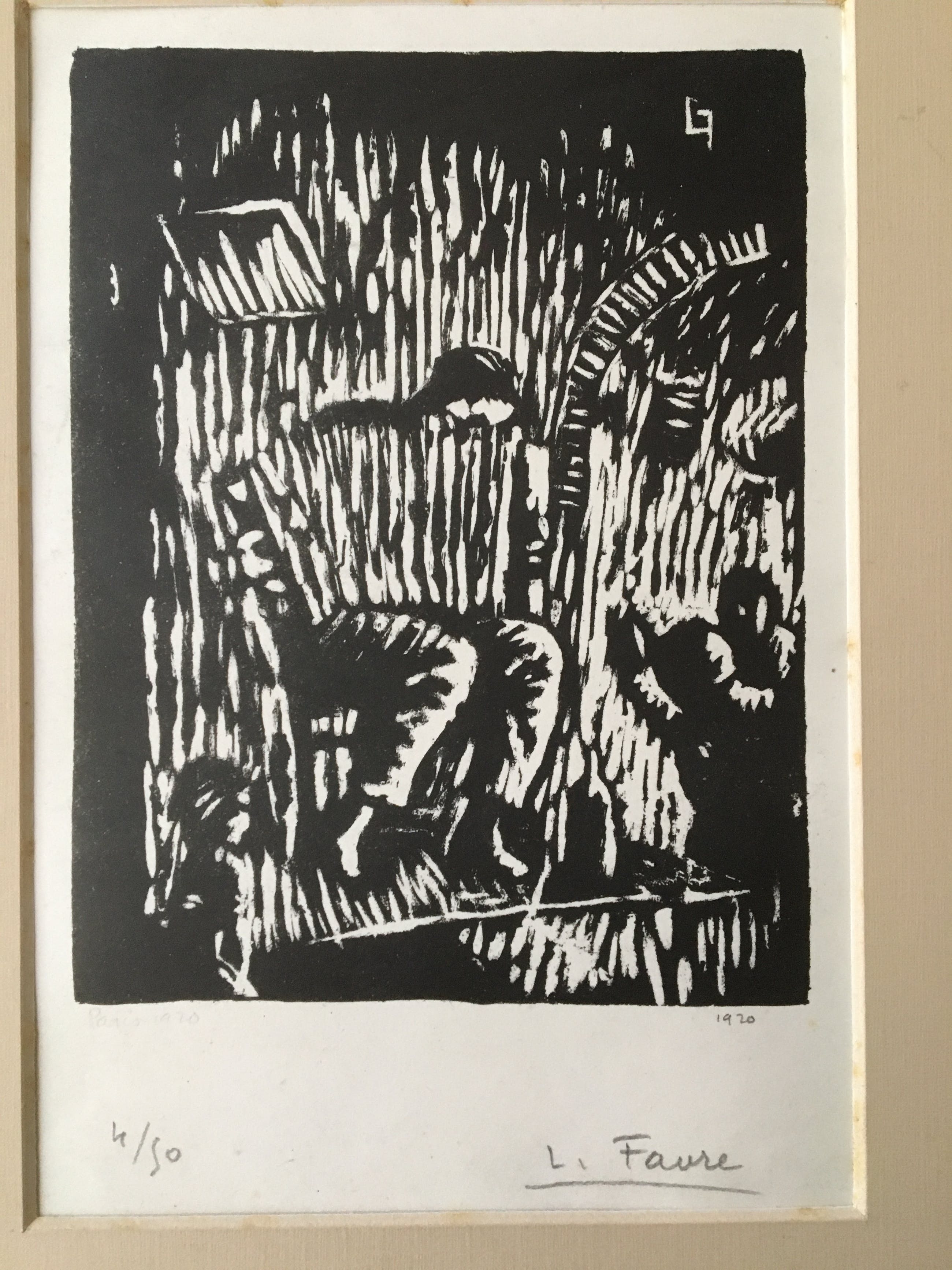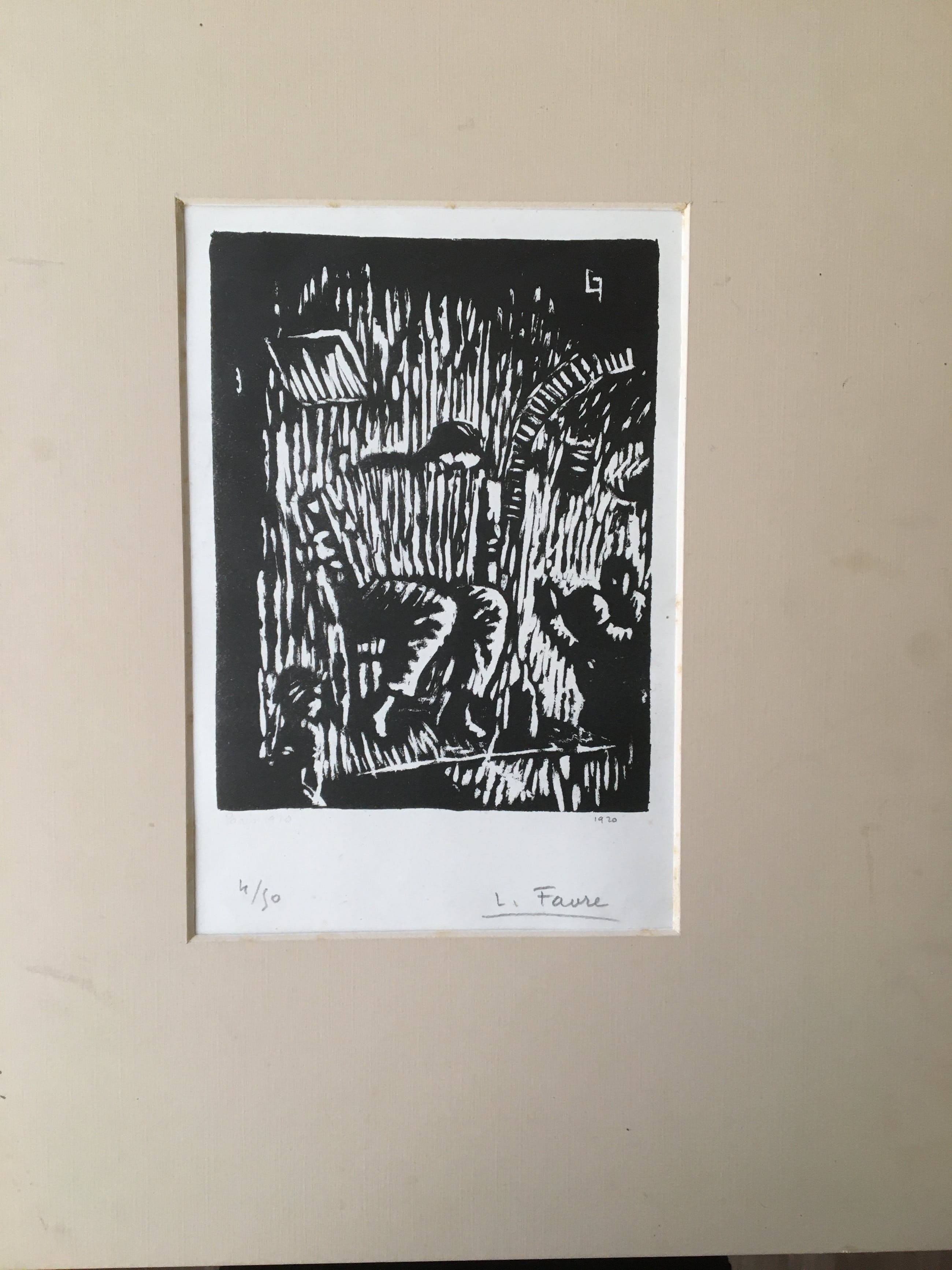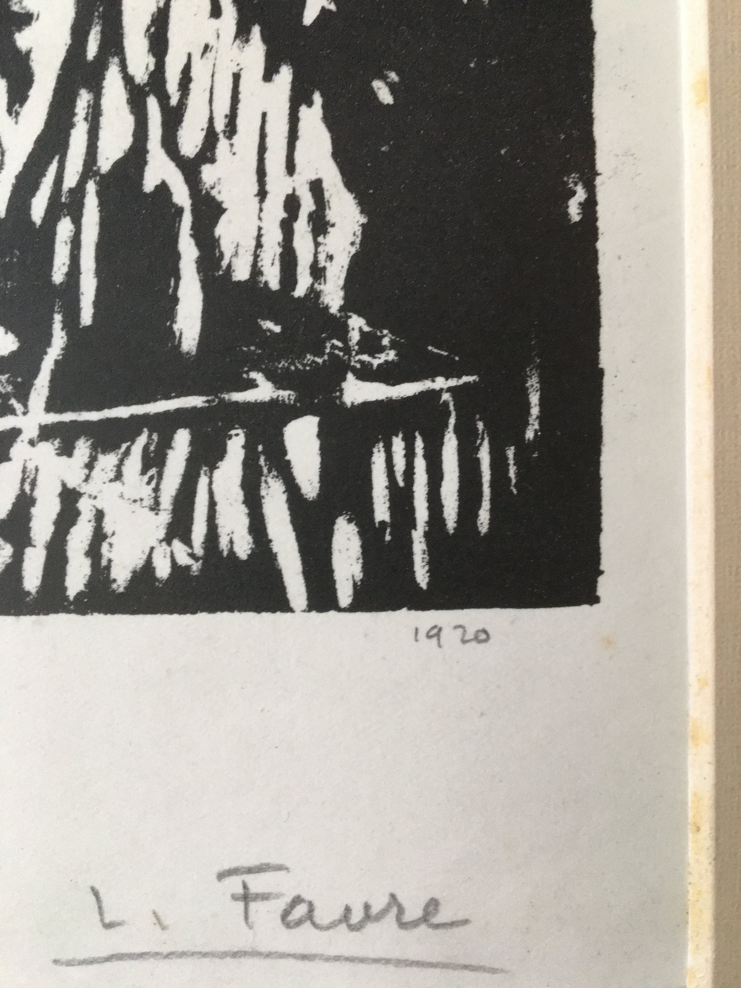 Houtsnede door L Favre, handgesigneerd, 1920. Afmeting is van de afdruk van de houtsnede exclusief handtekening. Accordeonspeler in uitgaansgelegenheid.