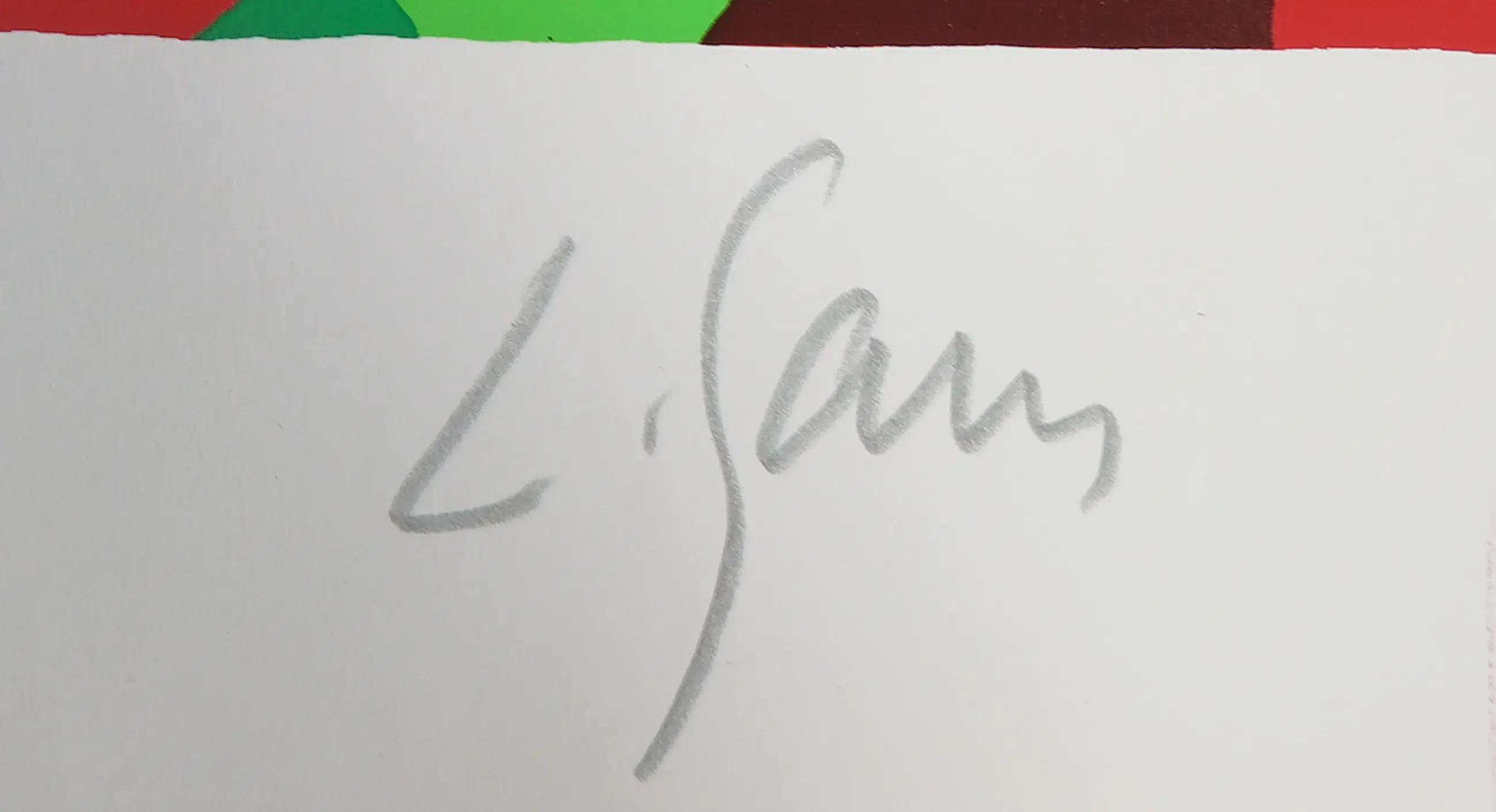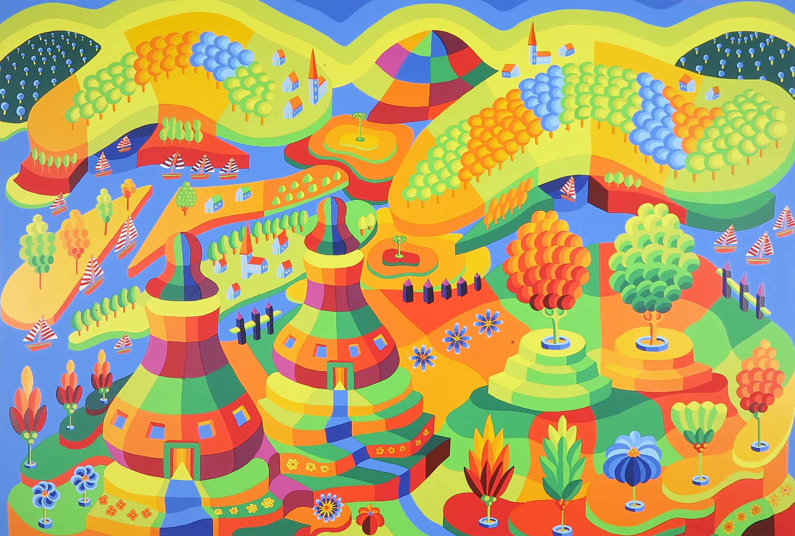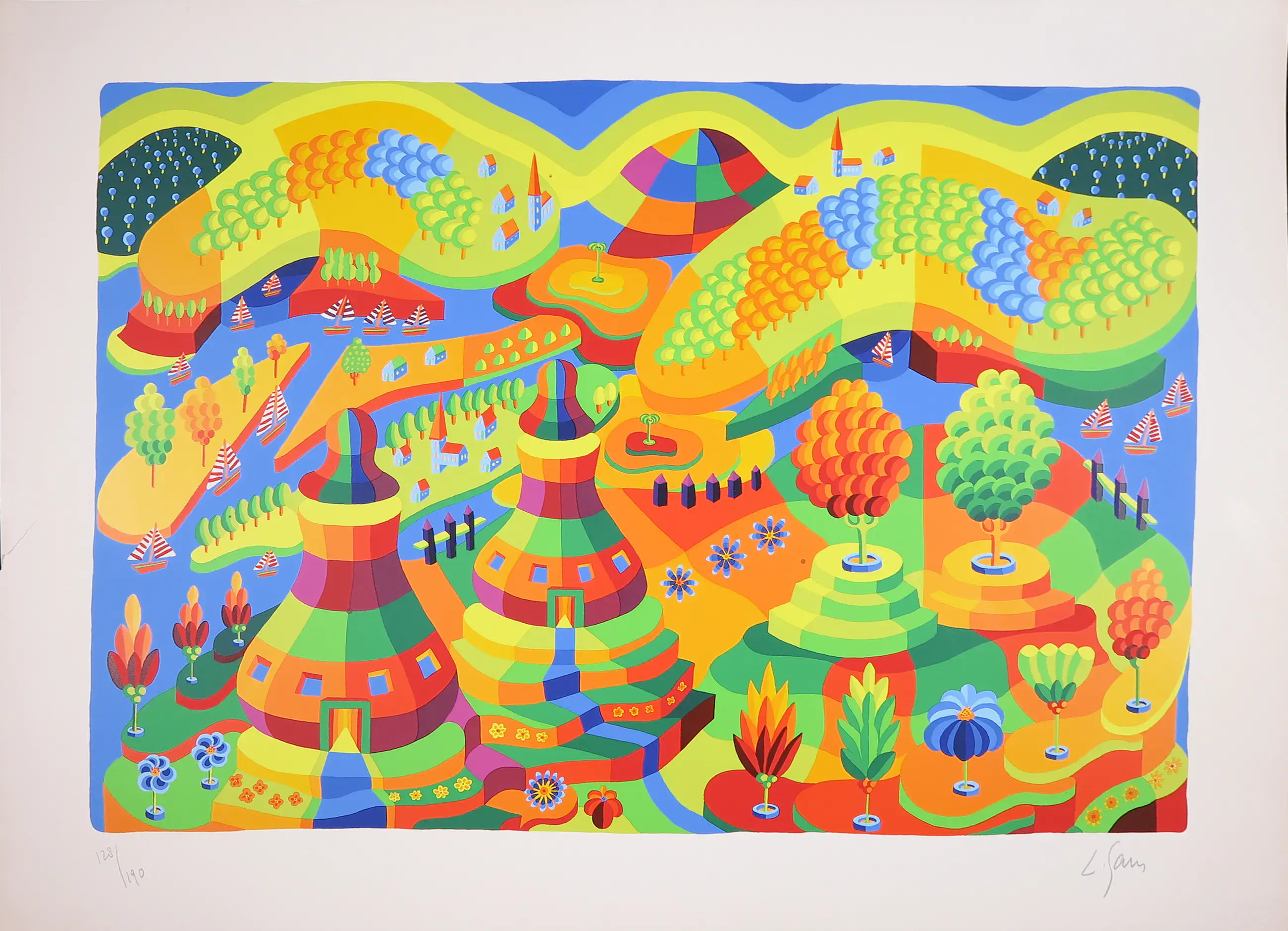 Kleurrijke zeefdruk van een fantasielandschap met huisjes door Louis Gans. Deze zeefdruk is onderdeel van een uitgave voor Prent 190.