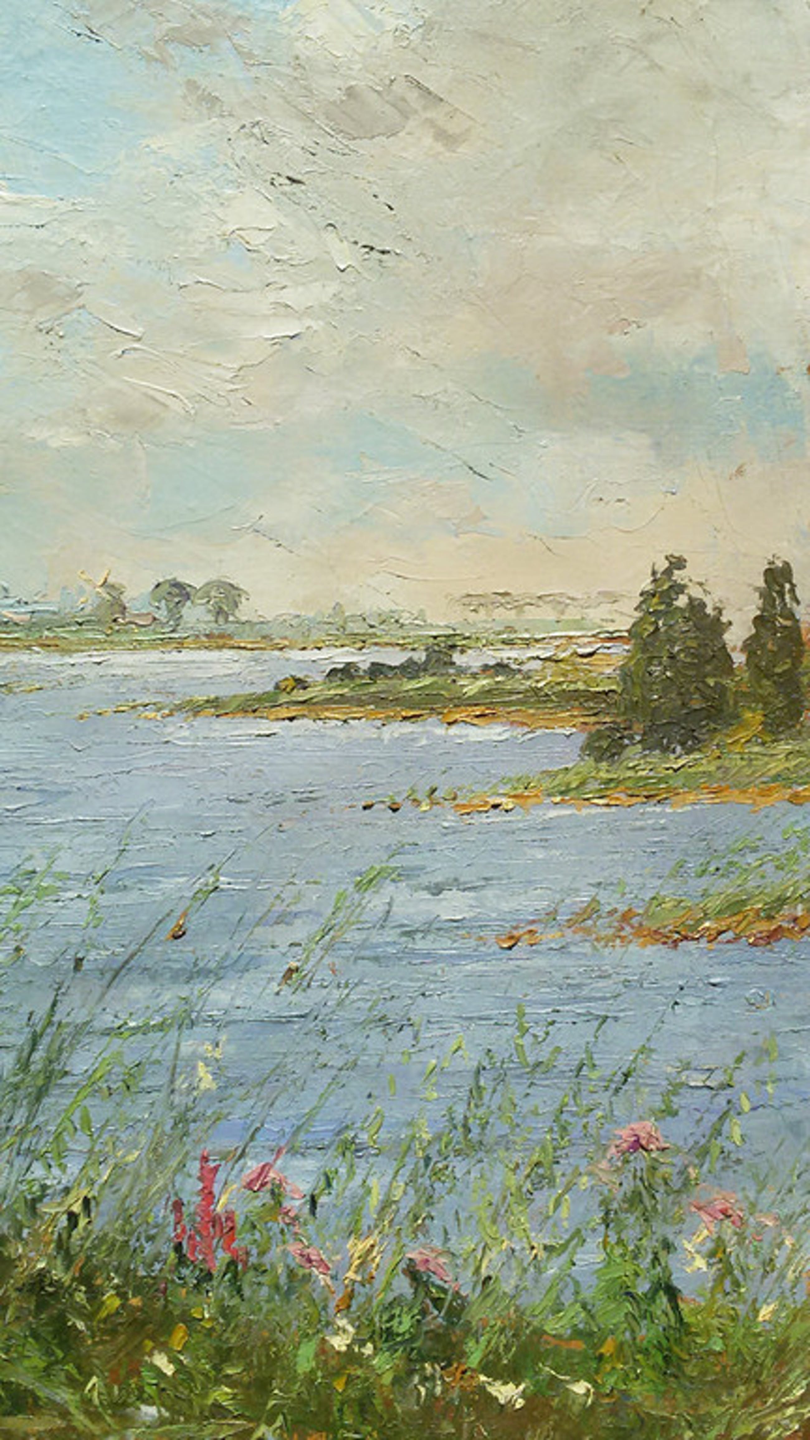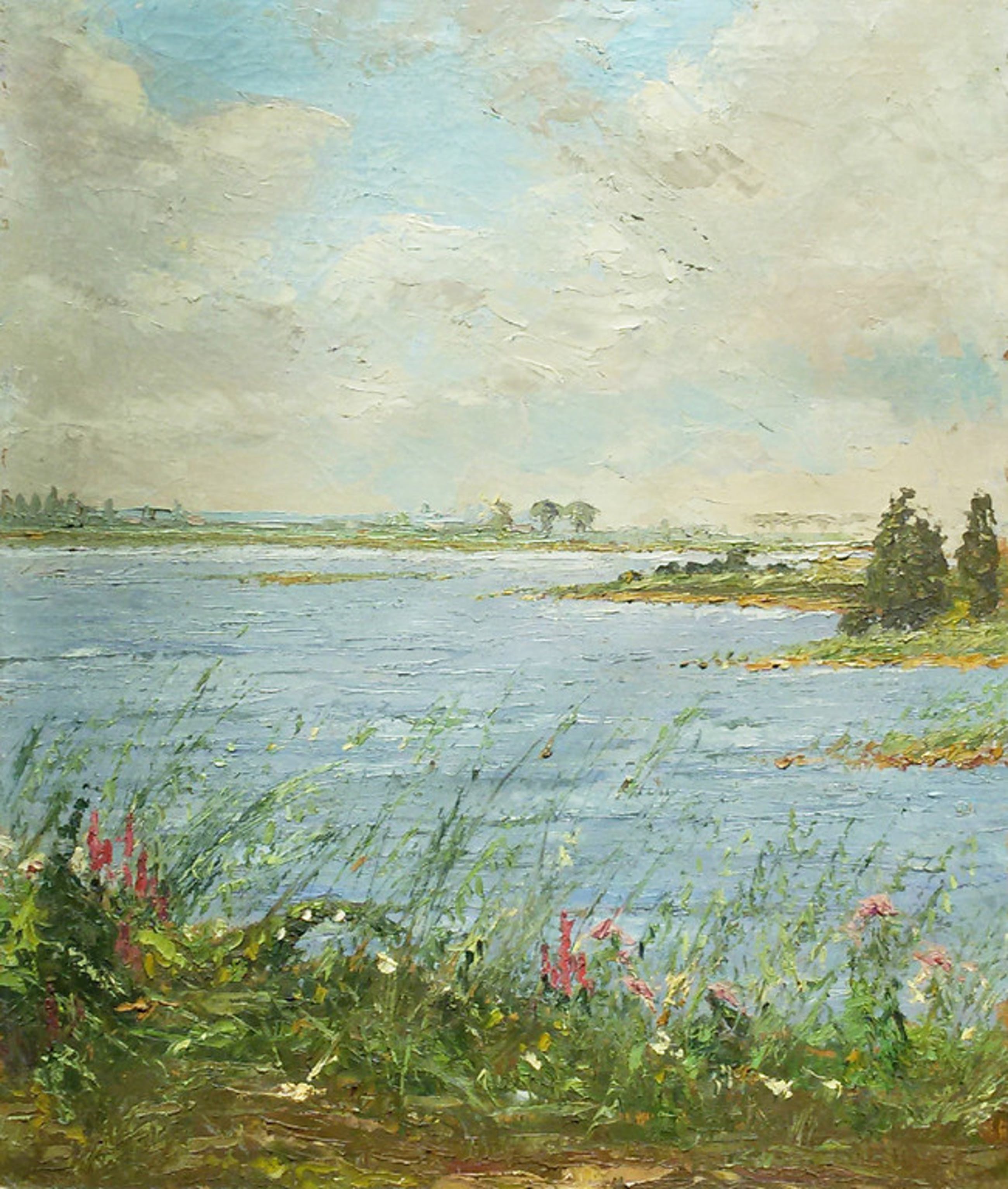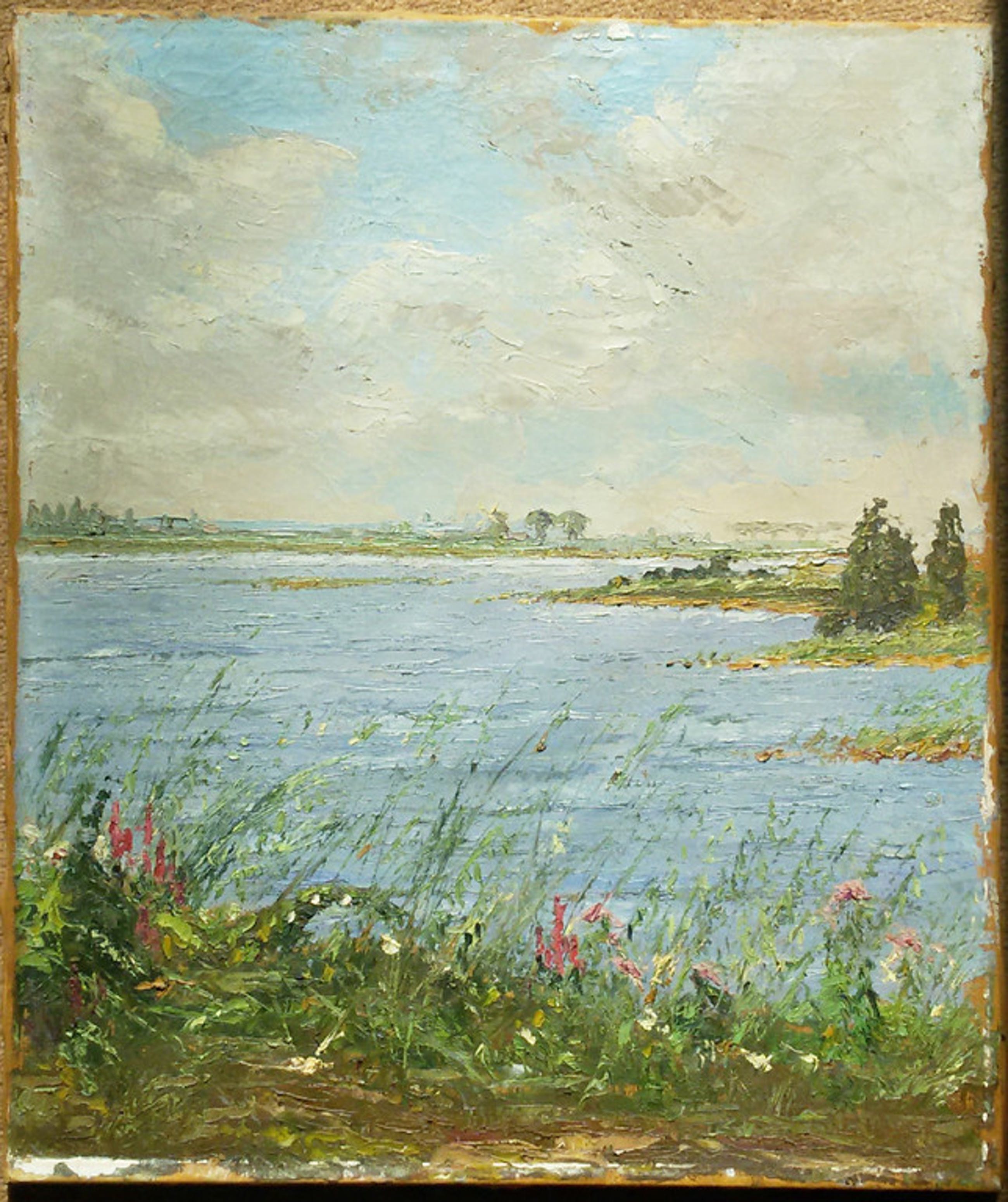 Prachtig, pasteus geschilderd werk van Louis Haver te dateren eerste helft 20e eeuw. Waarschijnlijk een gezicht op de Loosdrechtse plassen waar Haver vlakbij woonde. Olieverf op doek, gesigneerd in de verf rechtsonder. In goede conditie; langs de randen is er wat schade aan de verf van een vorige lijst (wat niet ongewoon is). Werk moet dus wel weer ingelijst worden om volledig tot zijn recht te komen.