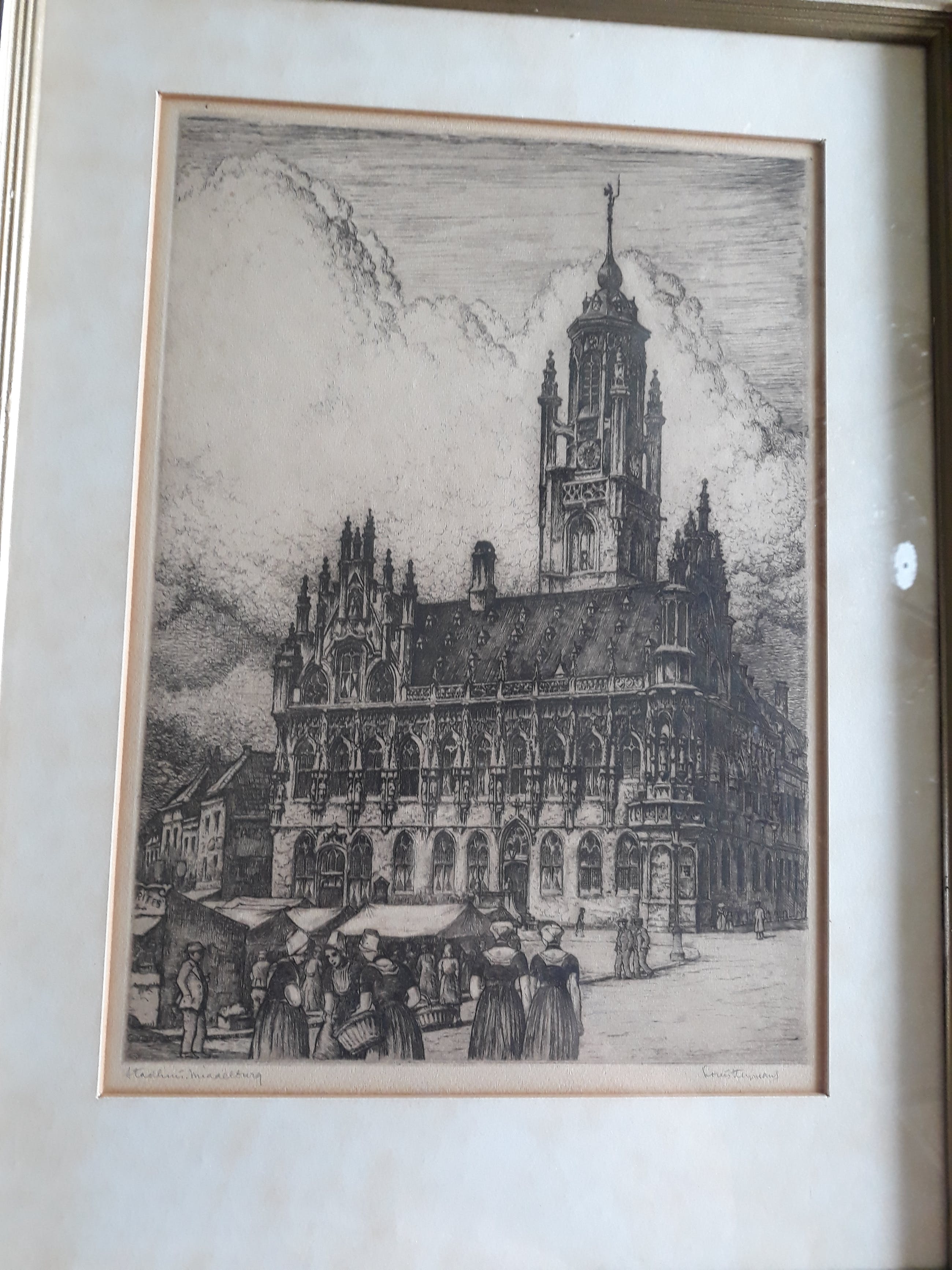Prachtige ets marktdag bij het Stadhuis te Middelburg,potlood gesigneerd,26 bij 38 cm,totaal 42 bij 56,herkomst kunsthandel Minderhoud Middelburg,fraai stuk grafiek met veel stoffige van figuren in traditionele klederdracht.