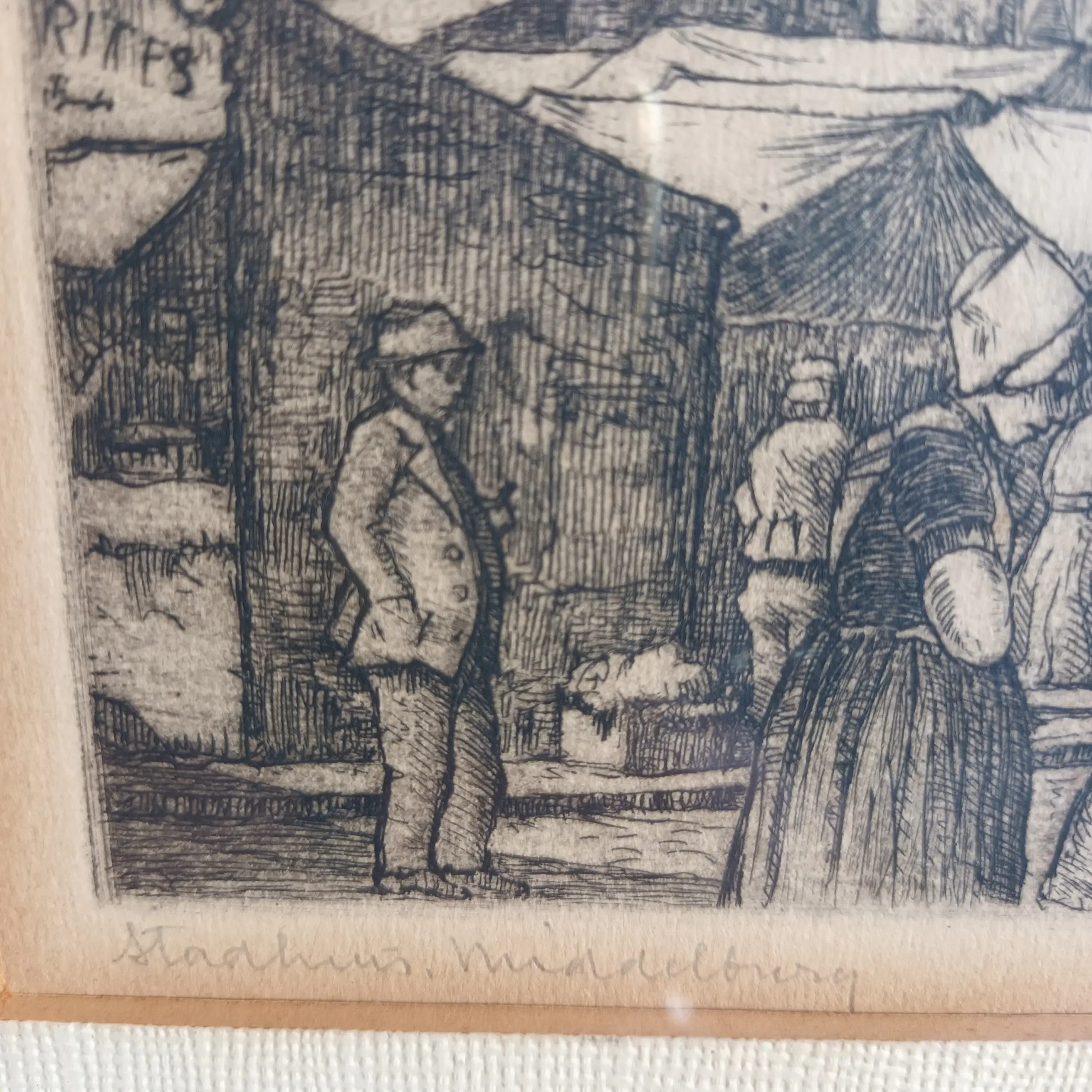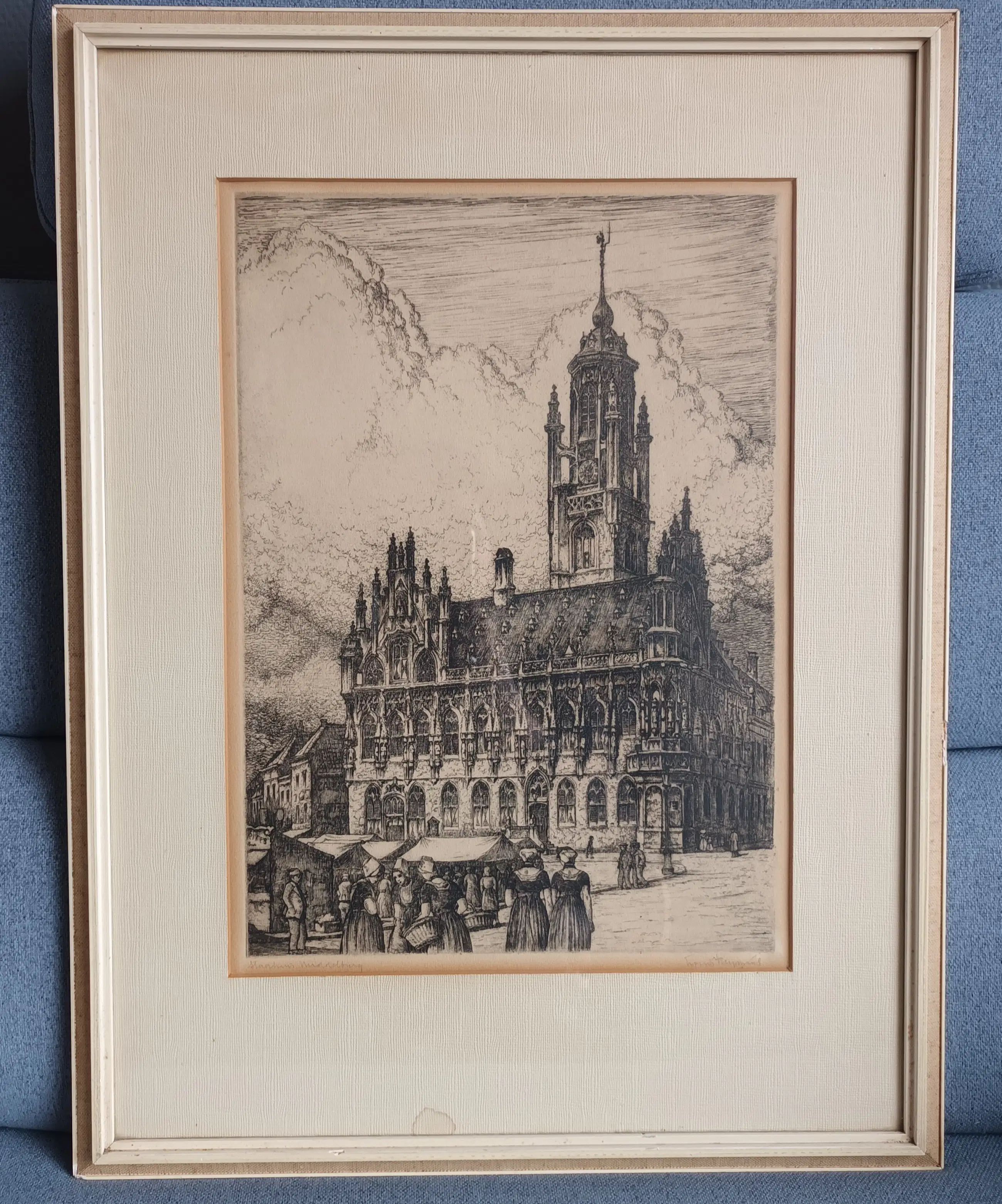 Bijzonder leuk tafereel met dames in klederdracht die hun waar in manden komen verkopen. De lijst heeft een soort jute rand wat het net wat authentieker en speciaal maakt.