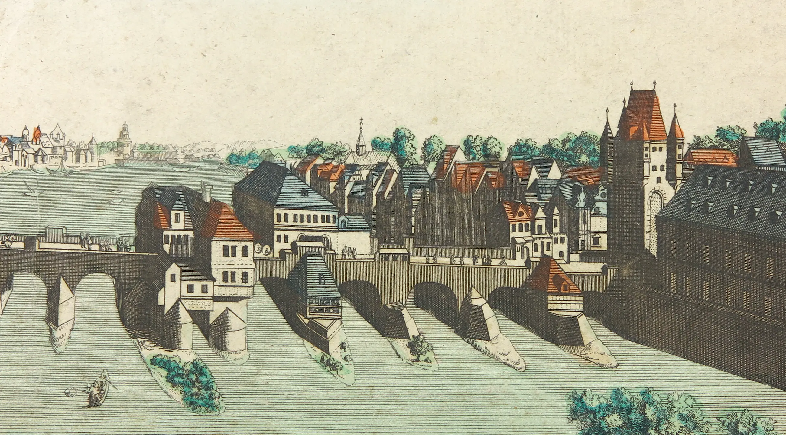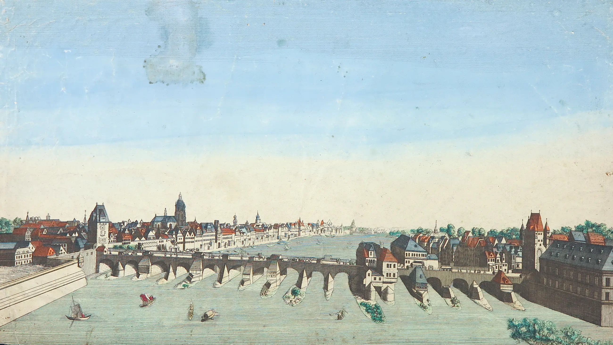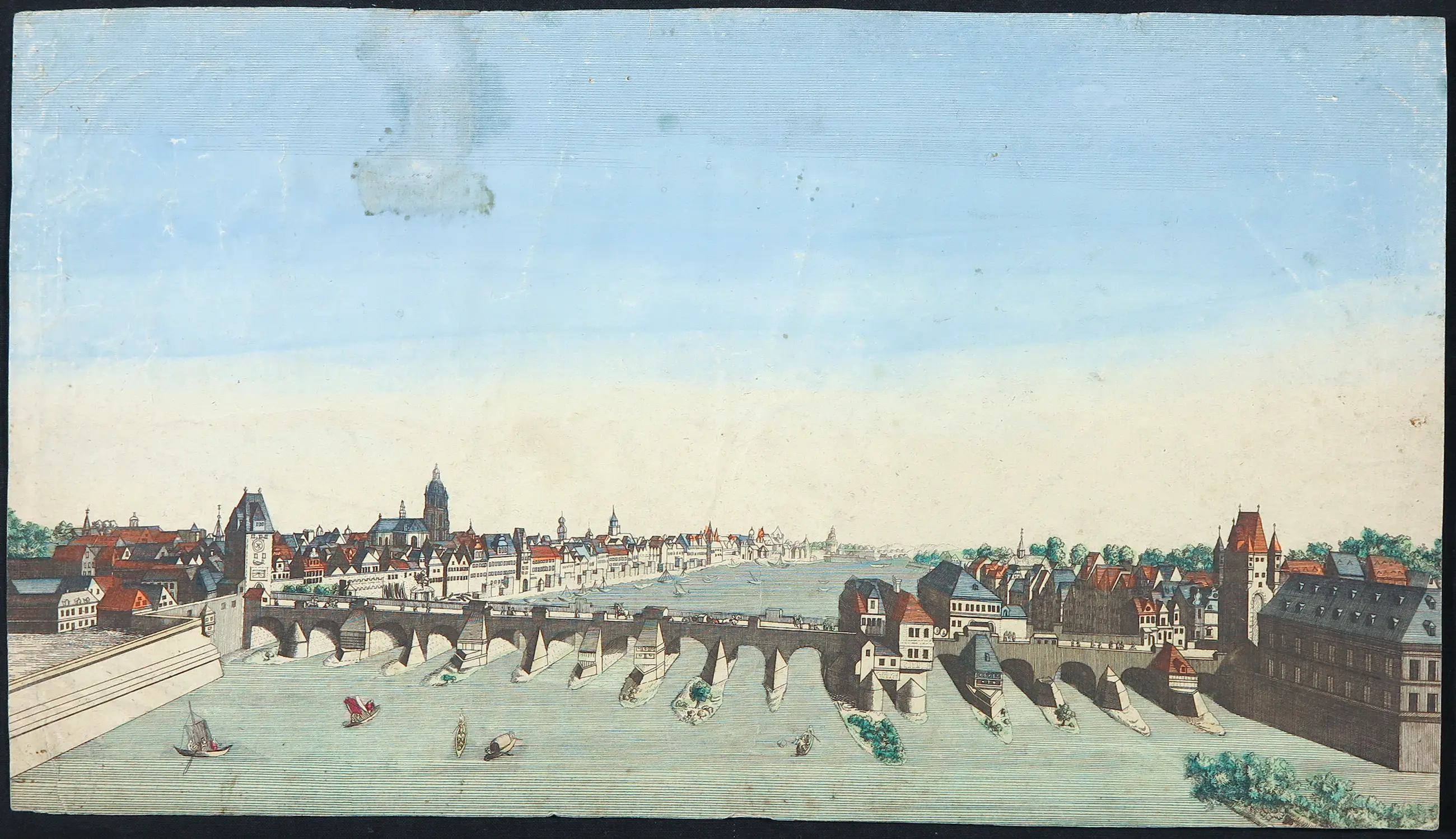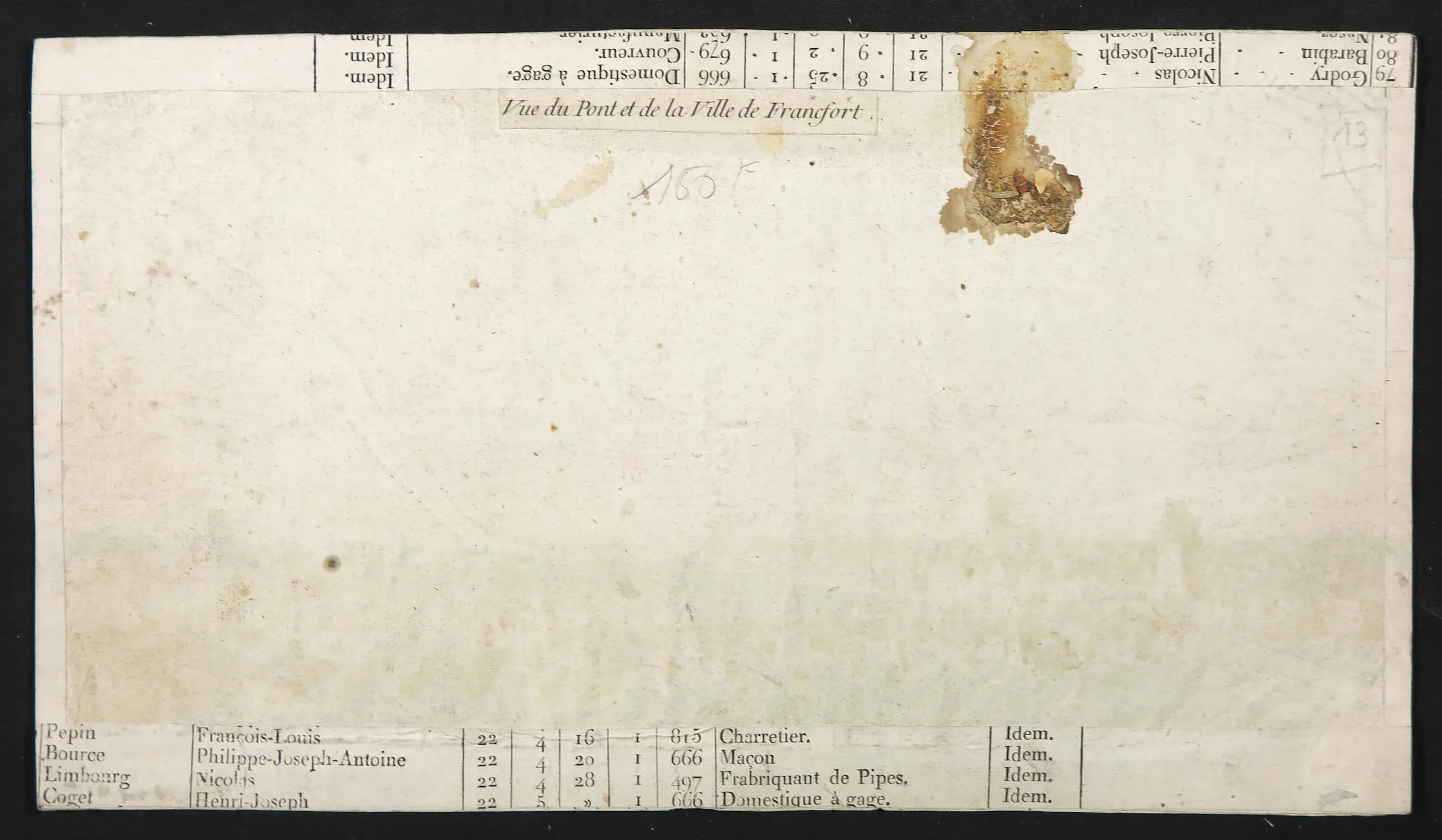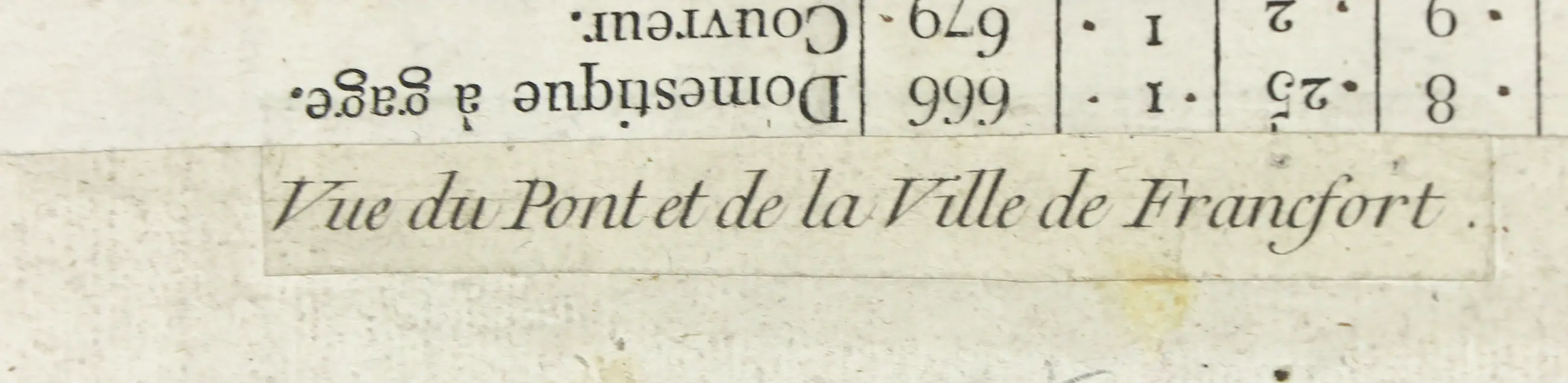 | Redelijke staat gezien de leefitjd, met vergeling/verkleuring van het blad en krasjes/beschadigingen in de kleurlaag. Langs de bovenste rand loopt een vochtplek tot in het beeld. Het blad heeft geen marges meer. | |||