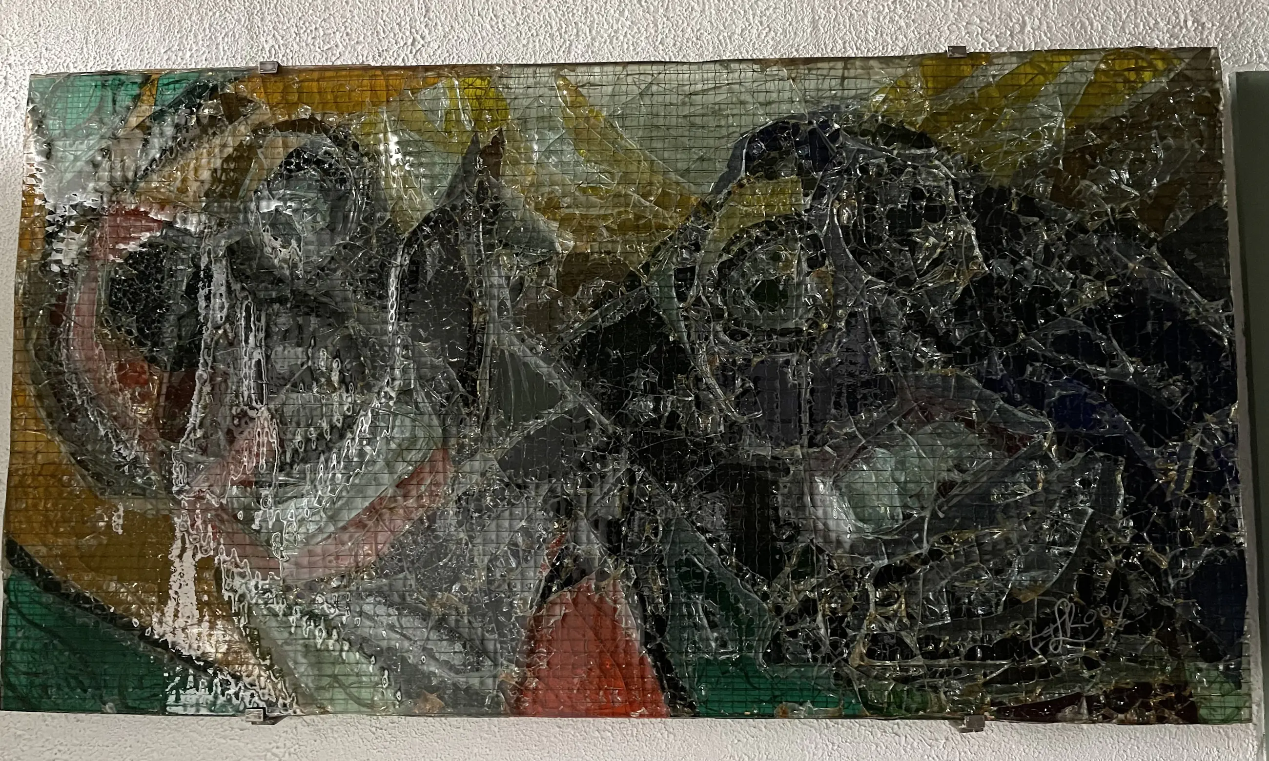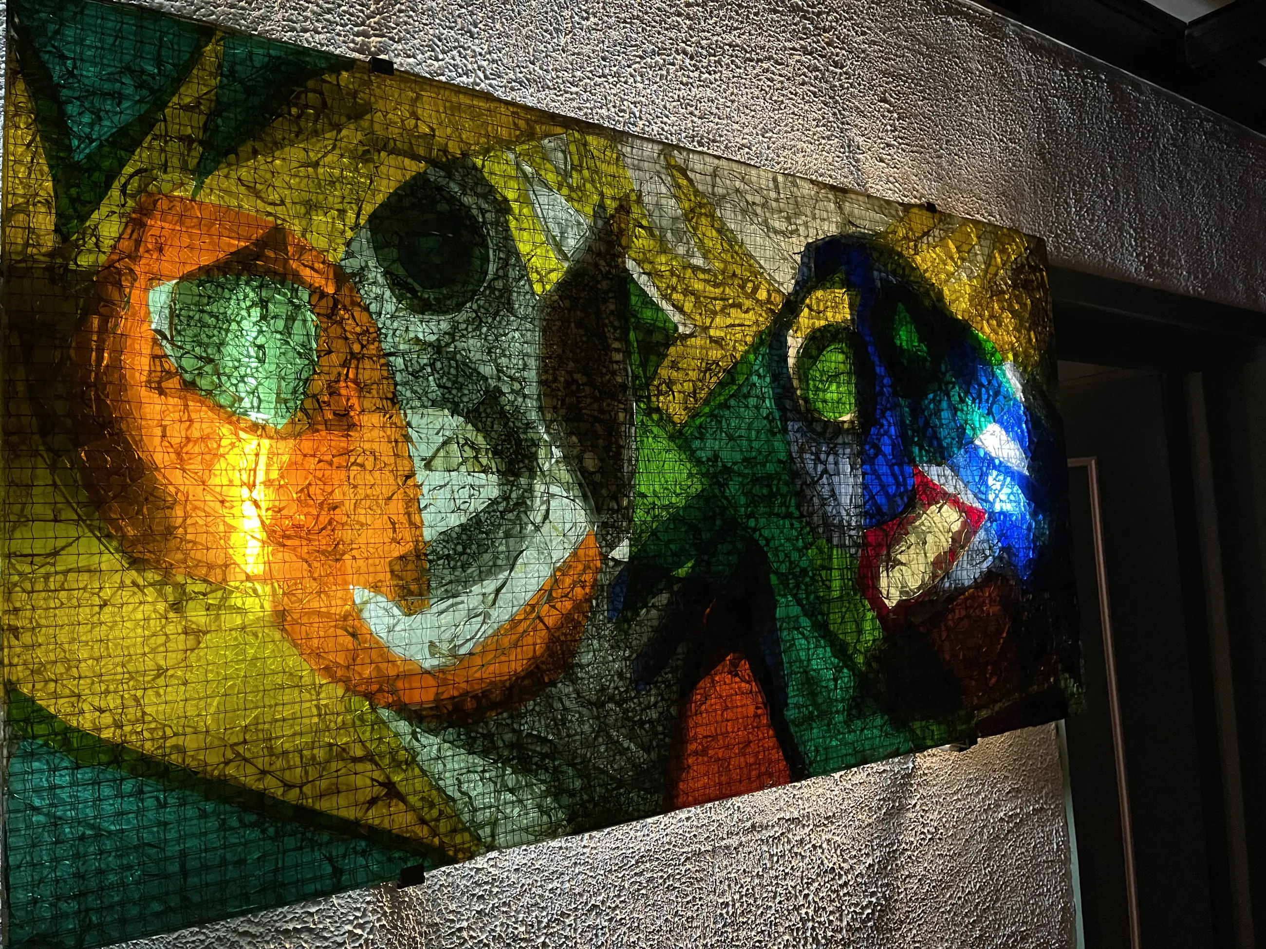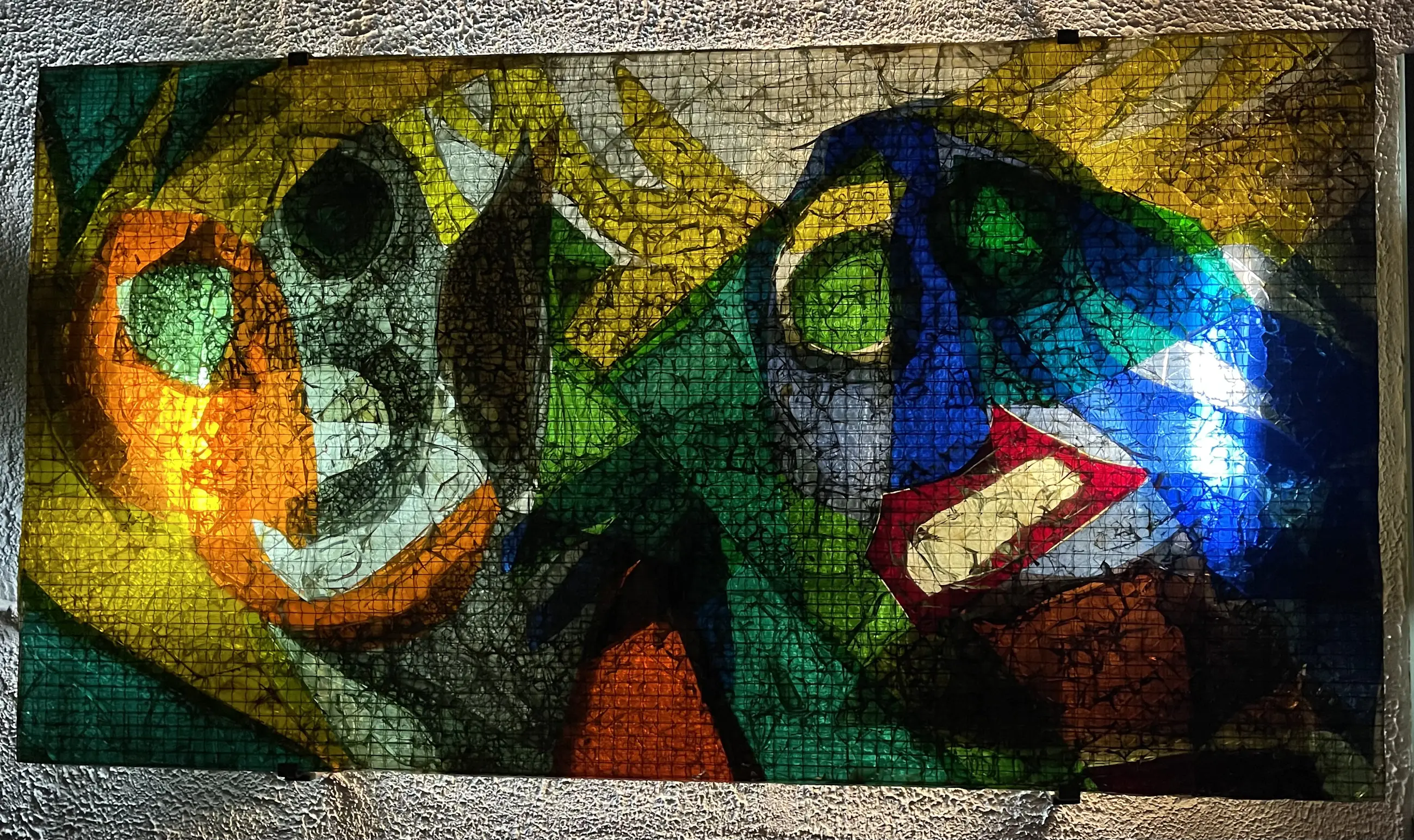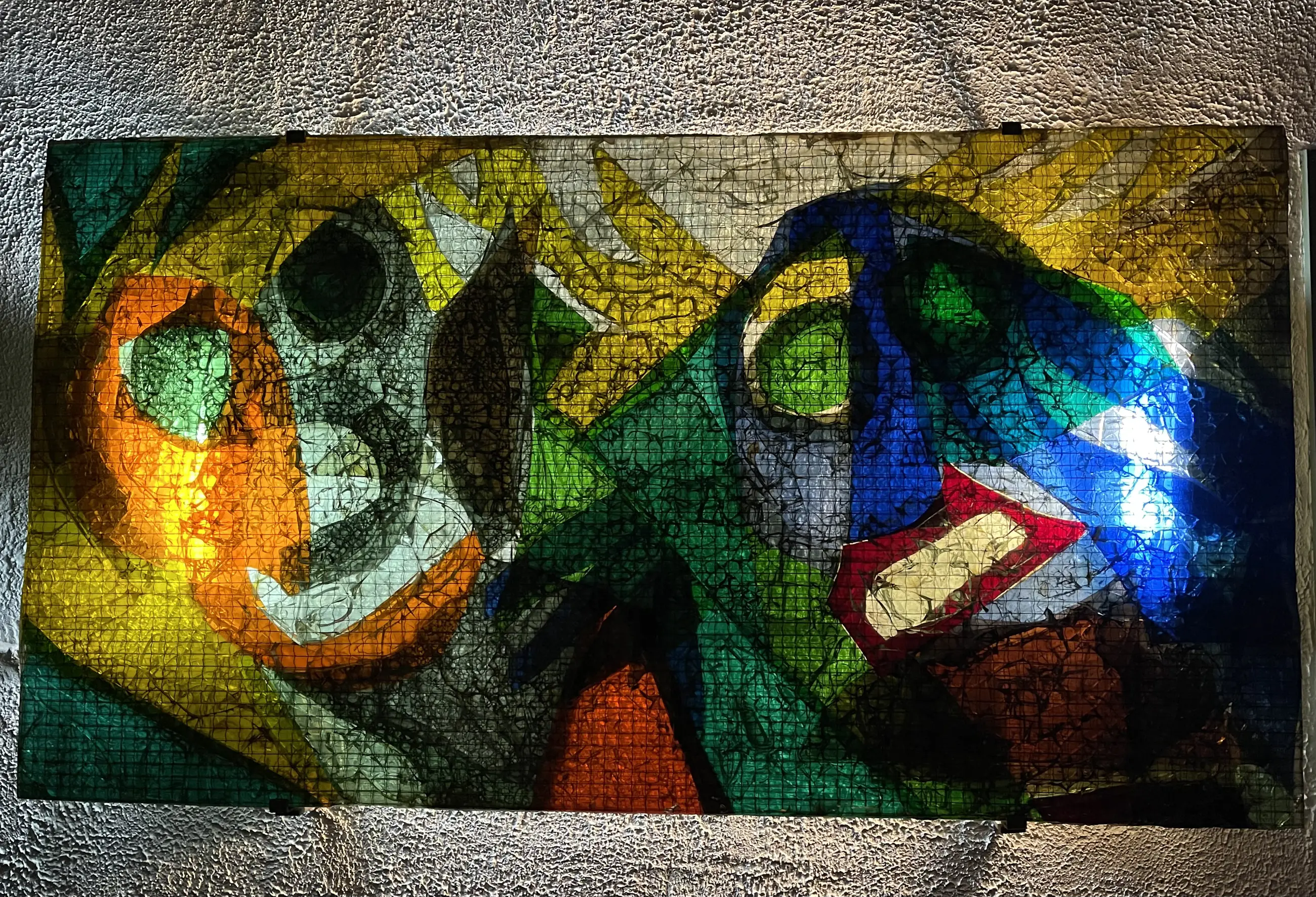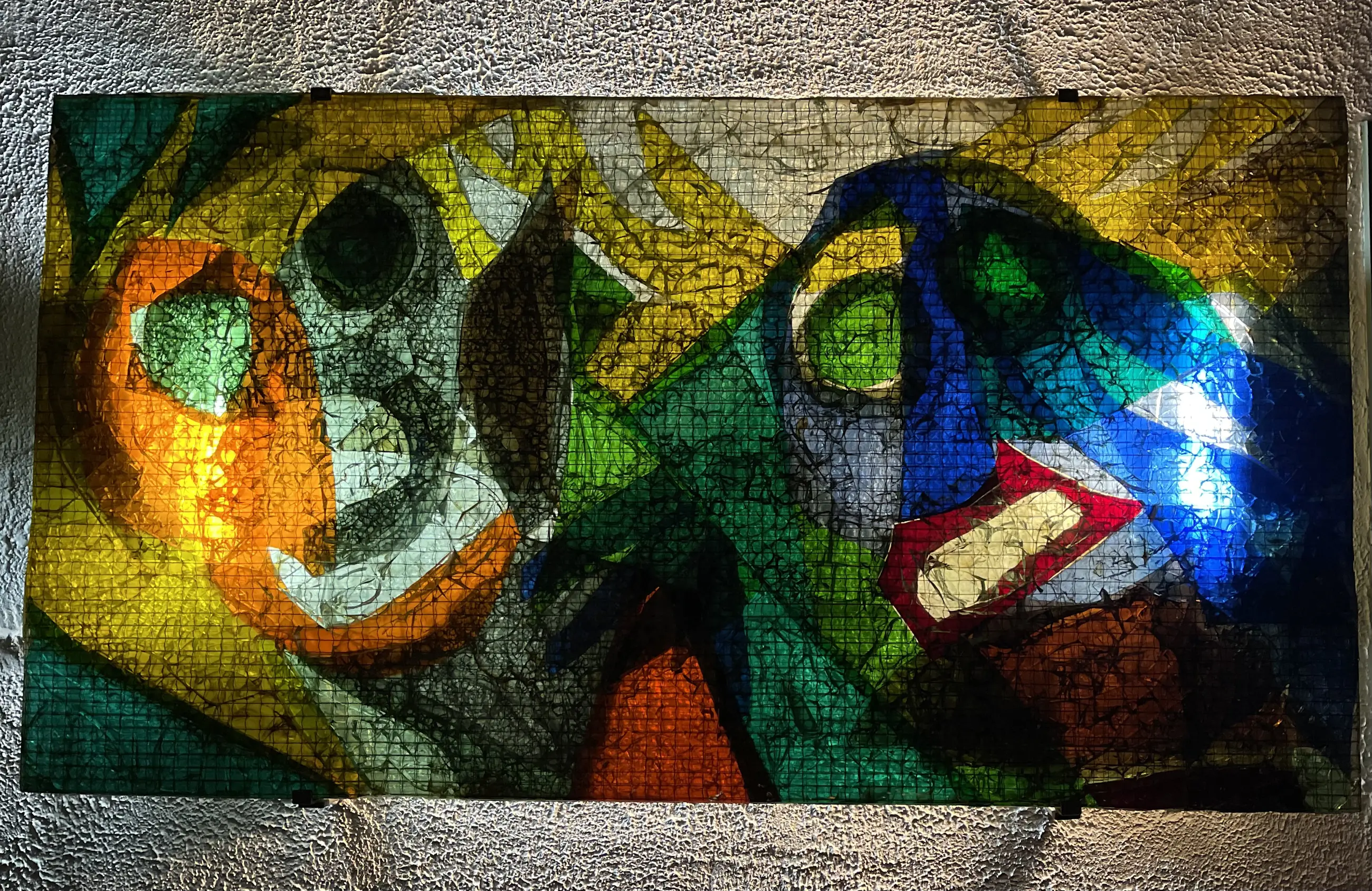 Het is gemaakt van gekleurd draadglas en heeft daglicht of kunstlicht nodig om het mooi tot zijn recht te laten komen.