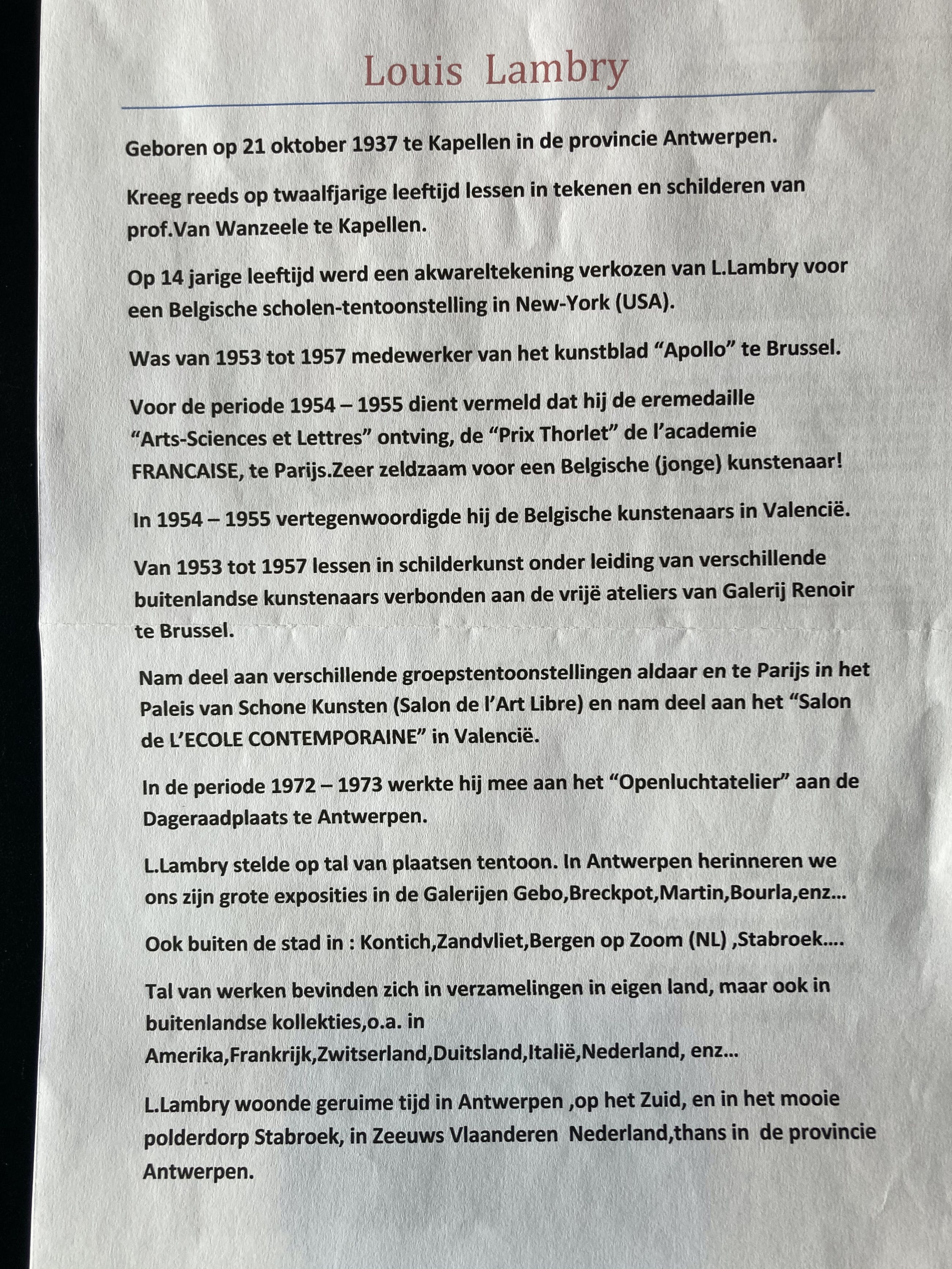 Krachtig opgezet, expressief schilderwerk, in warme tinten uitgevoerd. Louis Lambry typeerde zichzelf in deze periode (1974) als Cobra-artiest. Zijn gehele oeuvre omvat echter veel meer stijlen.