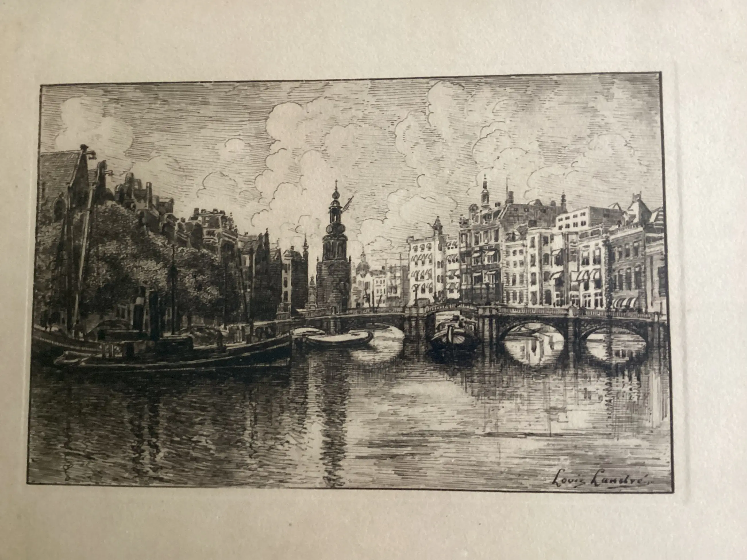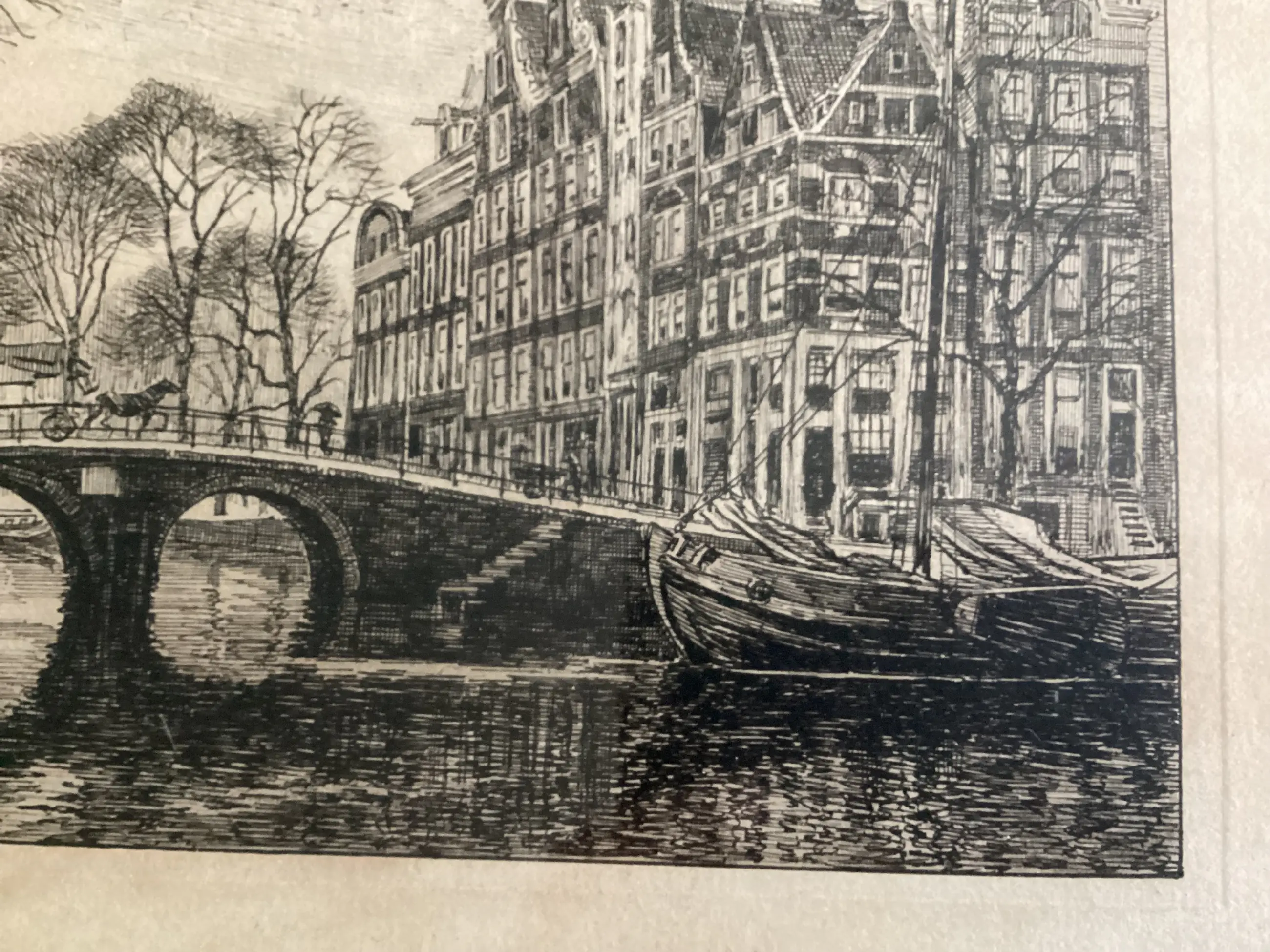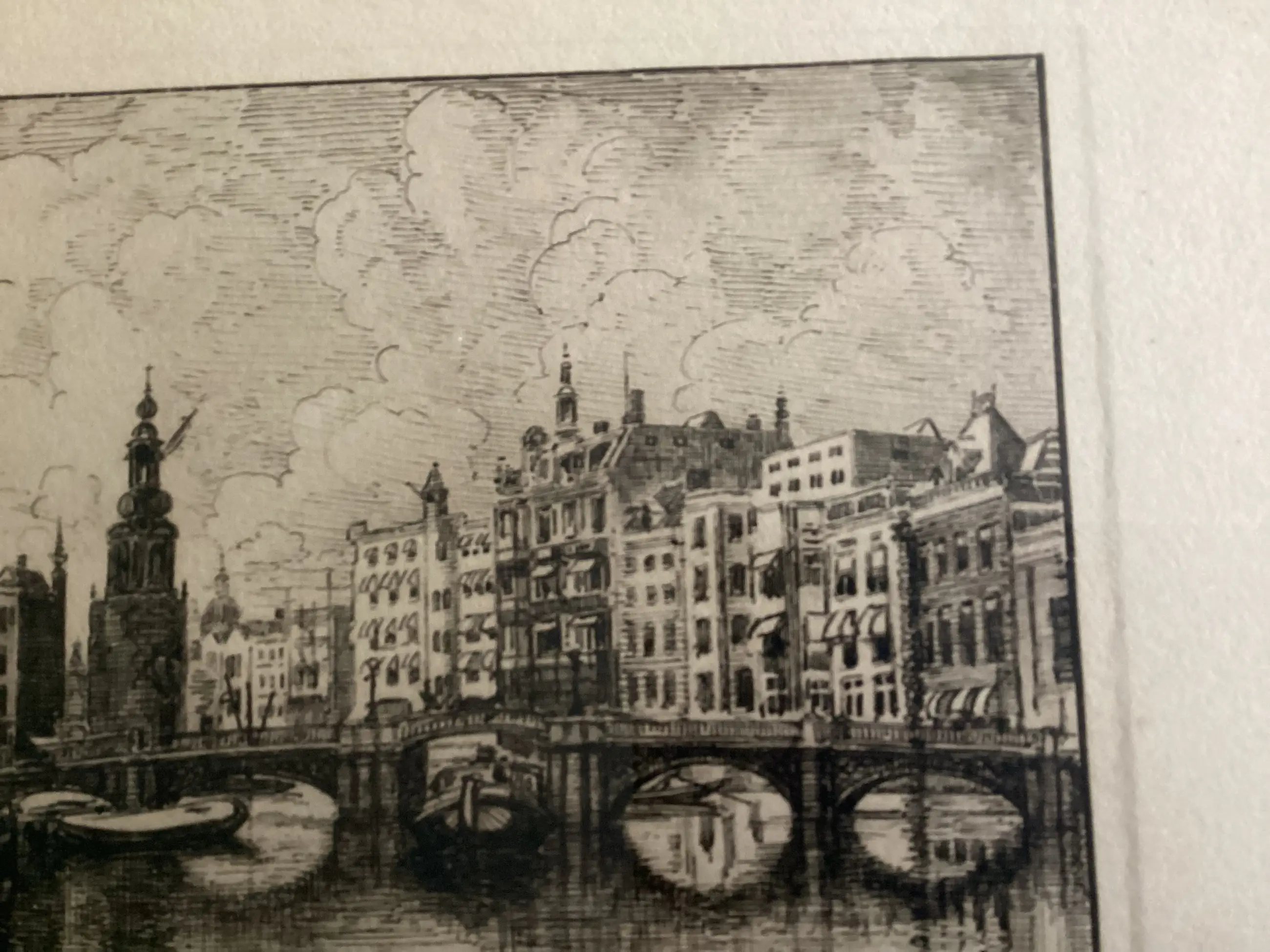 1. Binnenamstel gezien in de richting Munttoren, met links de Engelse huizen en in het midden de nieuwe Halvemaans brug, 2. Brouwersgracht hoek Prinsengracht, 3. Sint Anna dwarsstraat gezien naar de Oudekerkstoren. Van deze ets is bekend dat hij uit de periode 1910-1934 stamt. Etsen zijn in goede staat. Er is verkleuring van de paspartout. Werken kunnen ingelijst(risico voor de koper) of zonder lijst worden verzonden