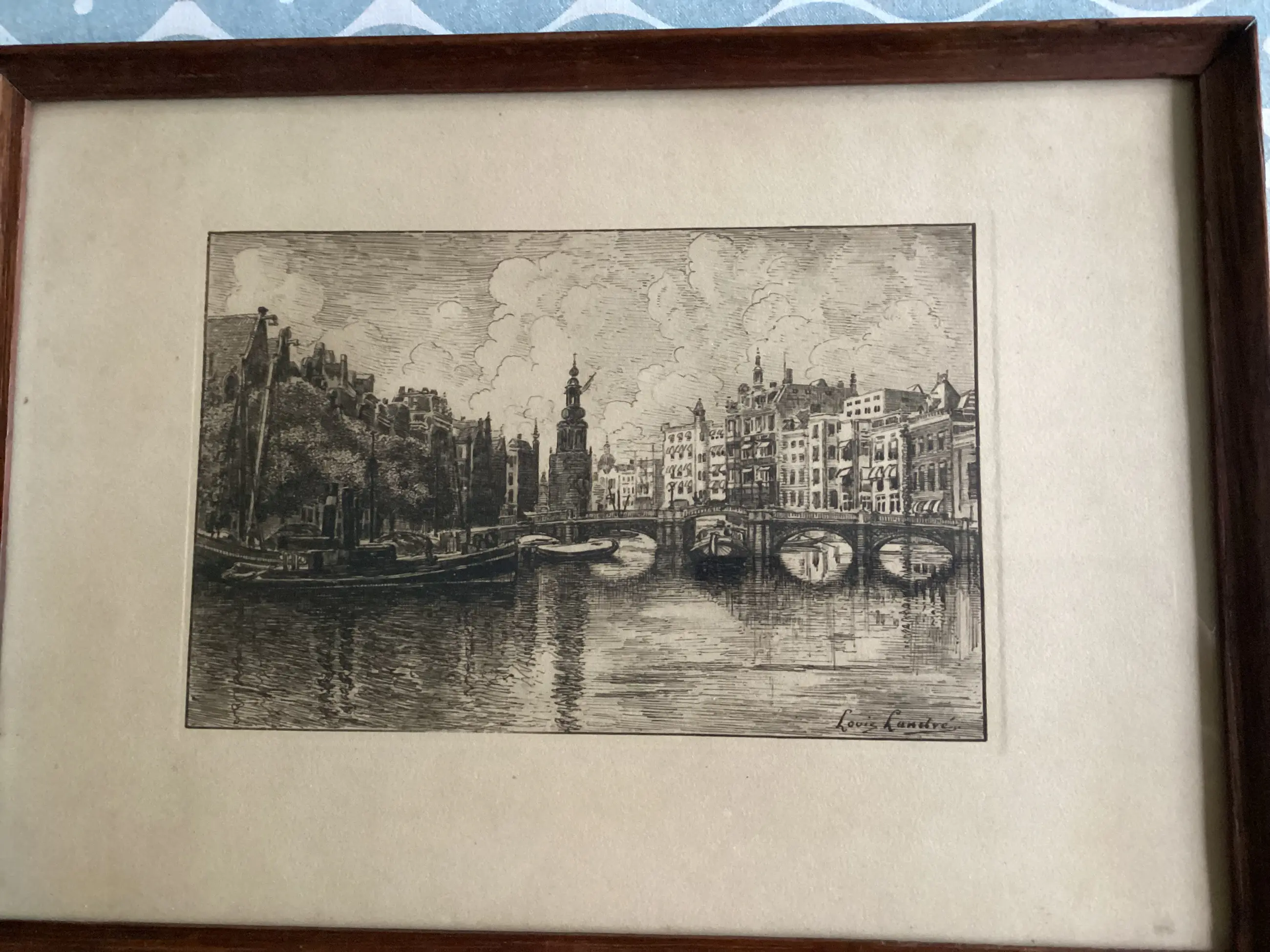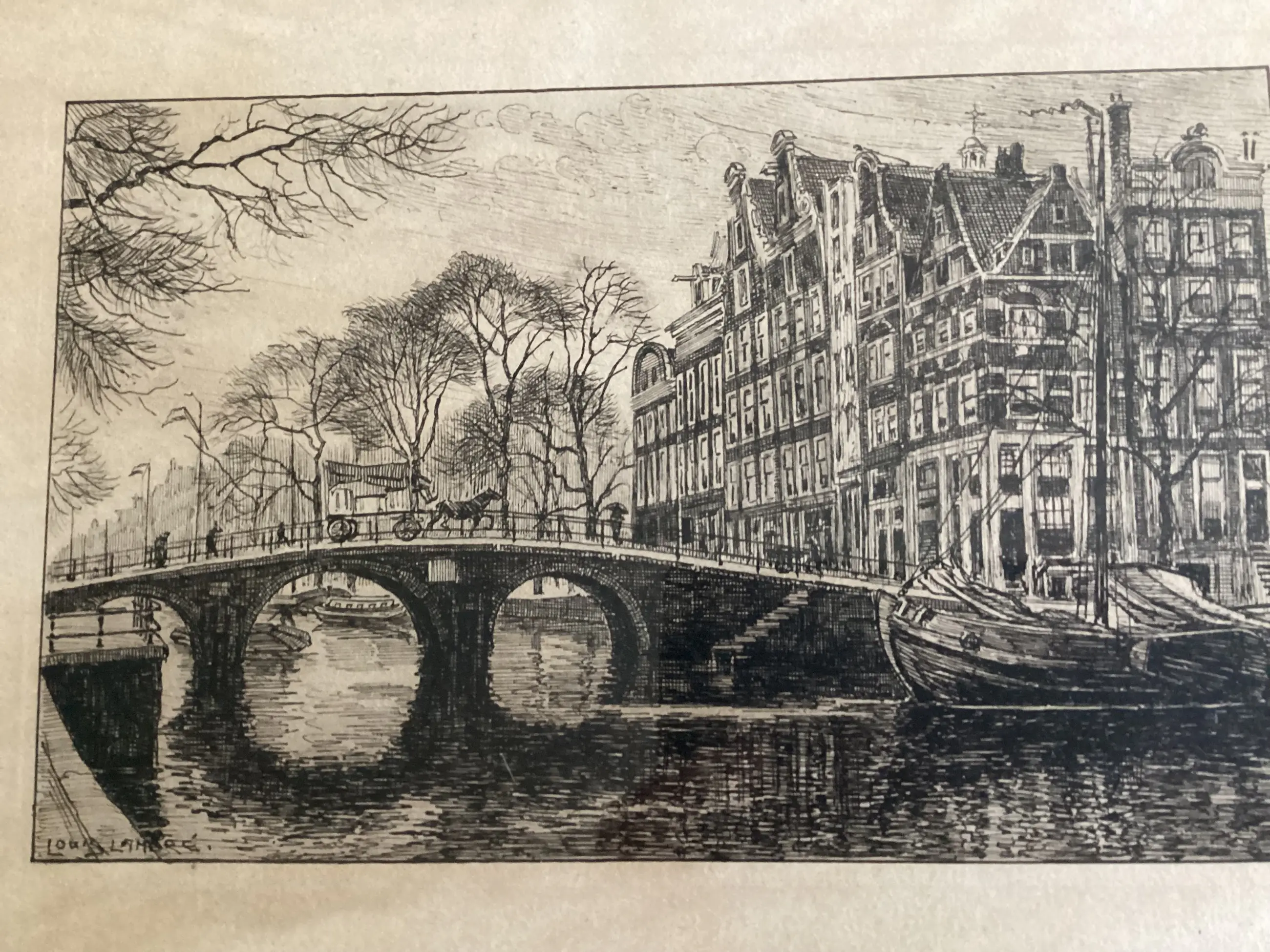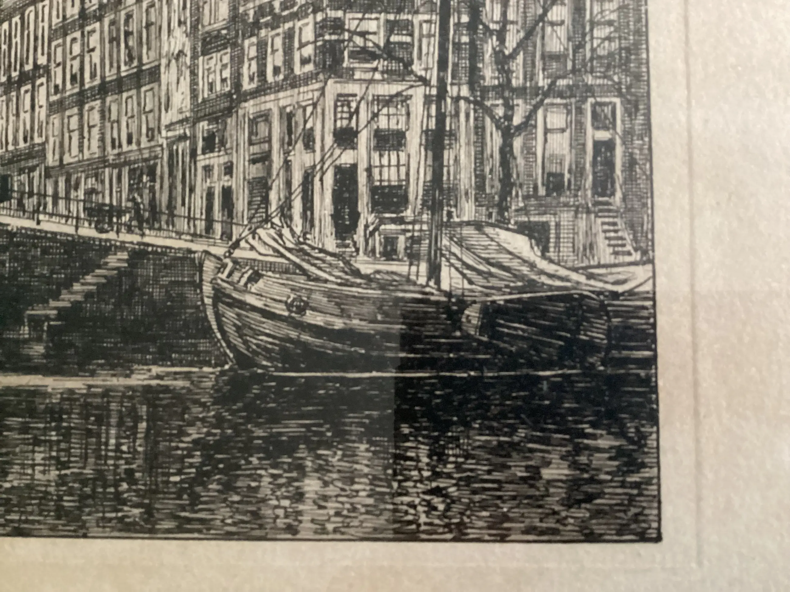 1. Binnenamstel gezien in de richting Munttoren, met links de Engelse huizen en in het midden de nieuwe Halvemaans brug, 2. Brouwersgracht hoek Prinsengracht, 3. Sint Anna dwarsstraat gezien naar de Oudekerkstoren. Van deze ets is bekend dat hij uit de periode 1910-1934 stamt. Etsen zijn in goede staat. Er is verkleuring van de paspartout. Werken kunnen ingelijst(risico voor de koper) of zonder lijst worden verzonden