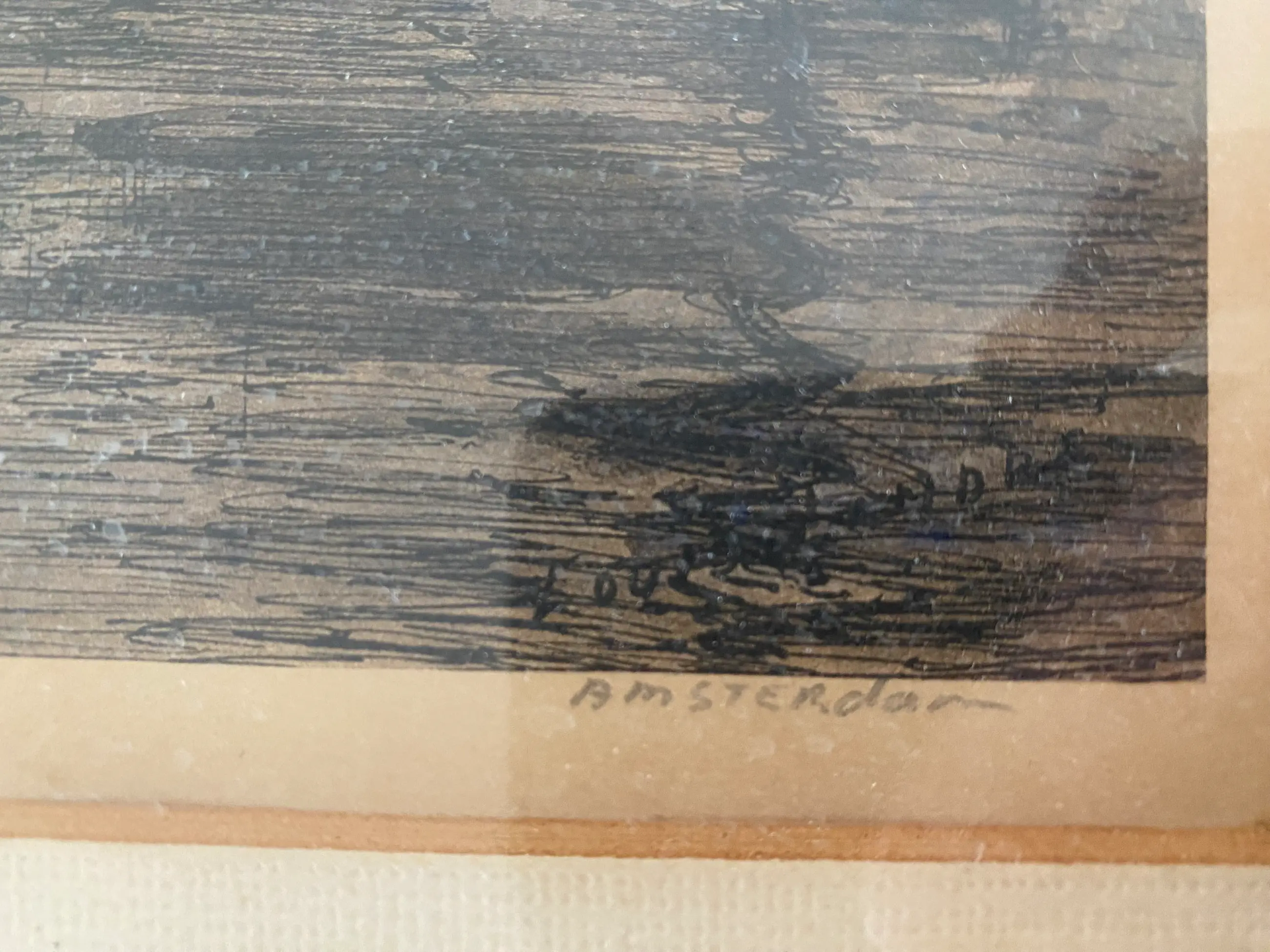 Ingelijst, het geheel is enigszins vervuild en vergeeld. Op de passepartout is een watervlek.