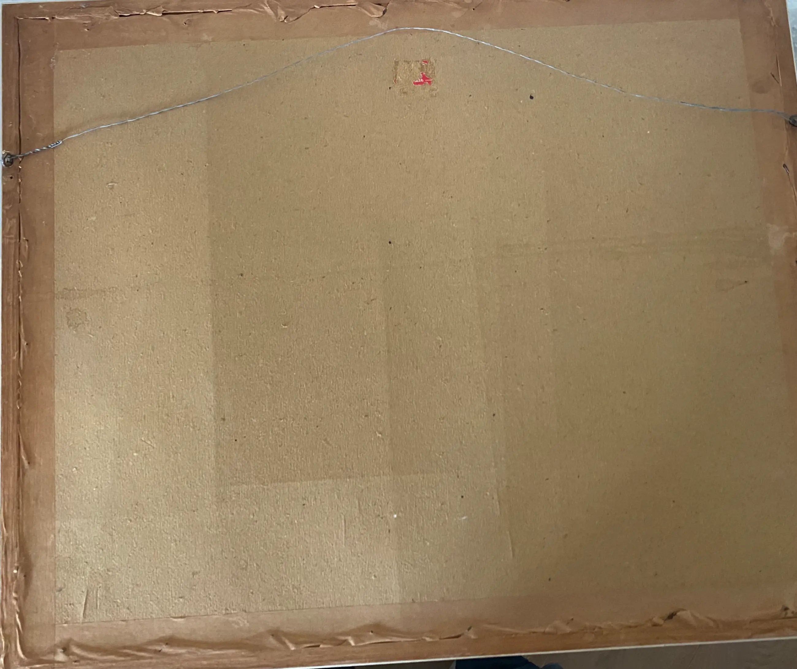 De lijst en glas zijn vuil. Achterzijde vertoont slijtage, op de passepartout zit een watervlek.