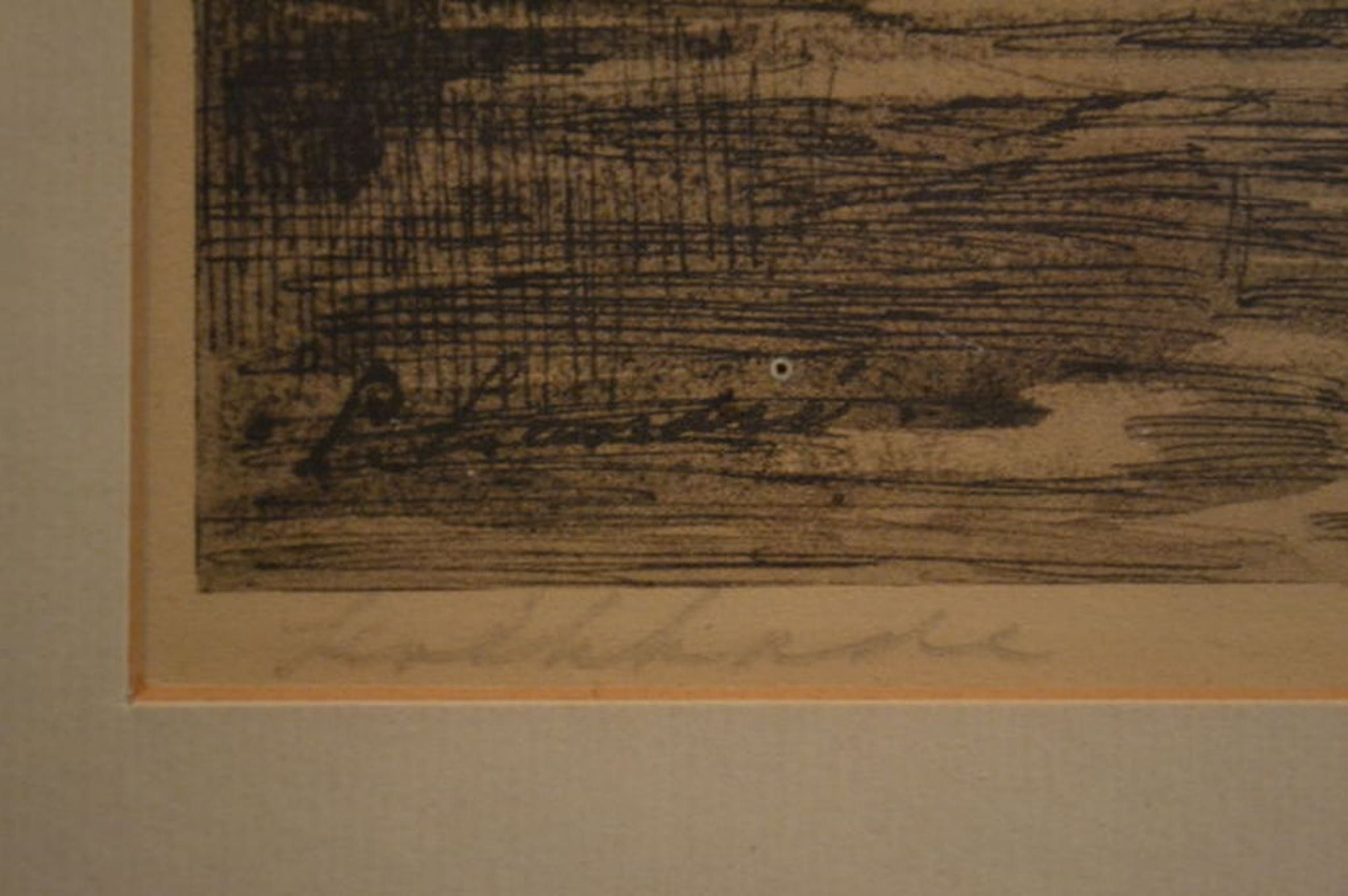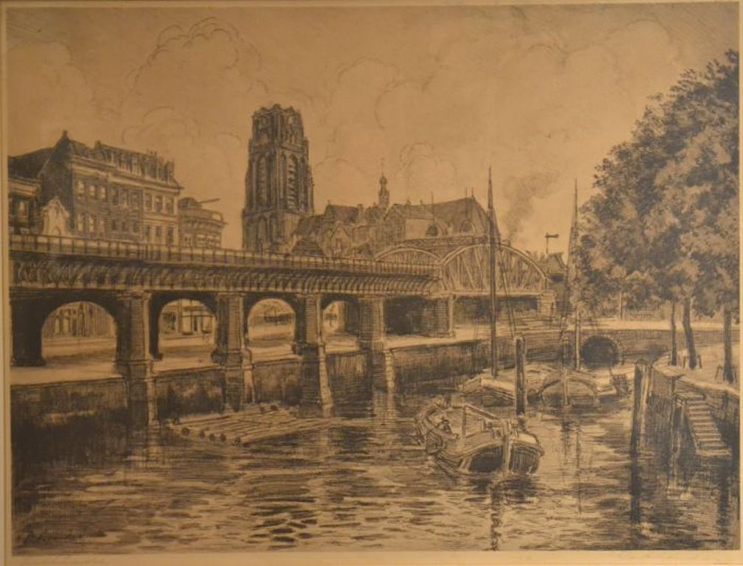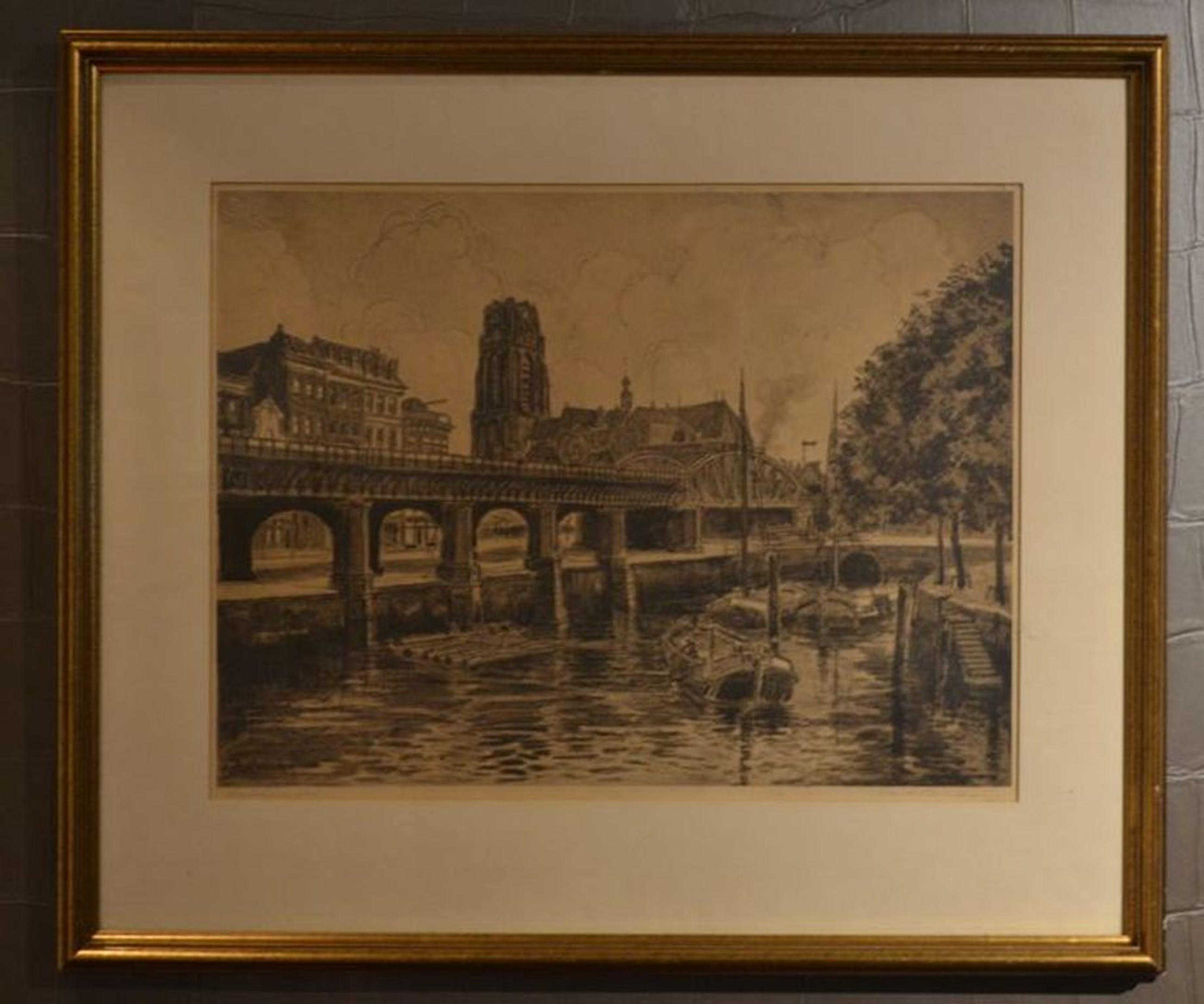 Fraaie ets van de Kolkkade in Rotterdam, gemaakt door Louis Landré. Ets is in de plaat gesigneerd, linksonder. Verder staat linksonder in potlood geschreven "Kolkkade" en rechtsonder "Rotterdam". Ets zit in het goudkleurige lijst en achter glas. Alles in prima conditie. Totale afmeting is 51x60cm.