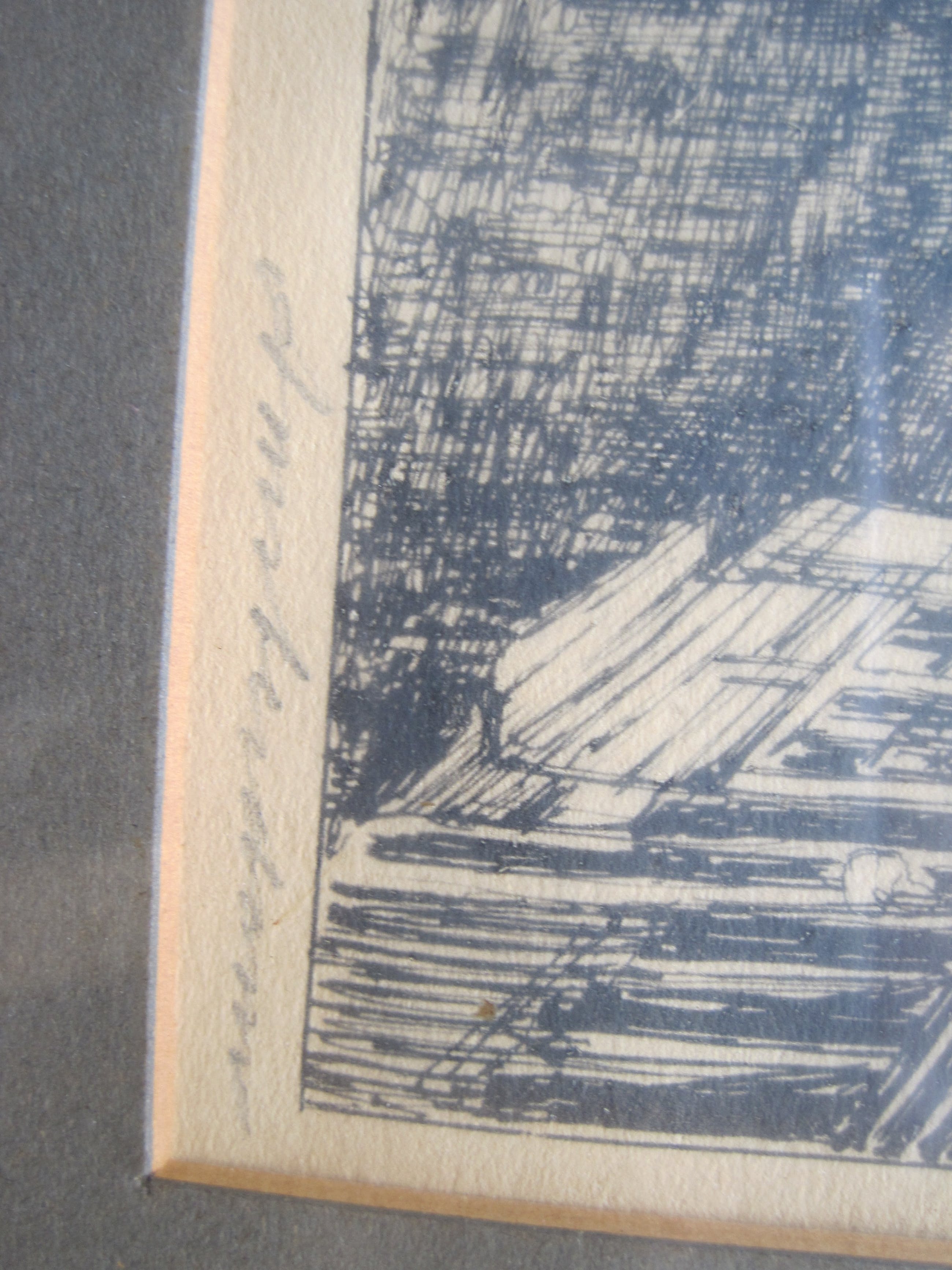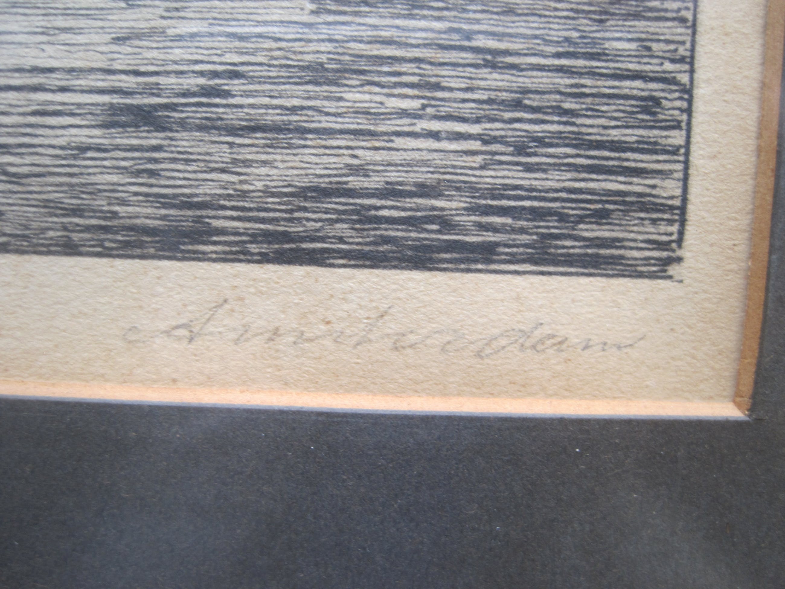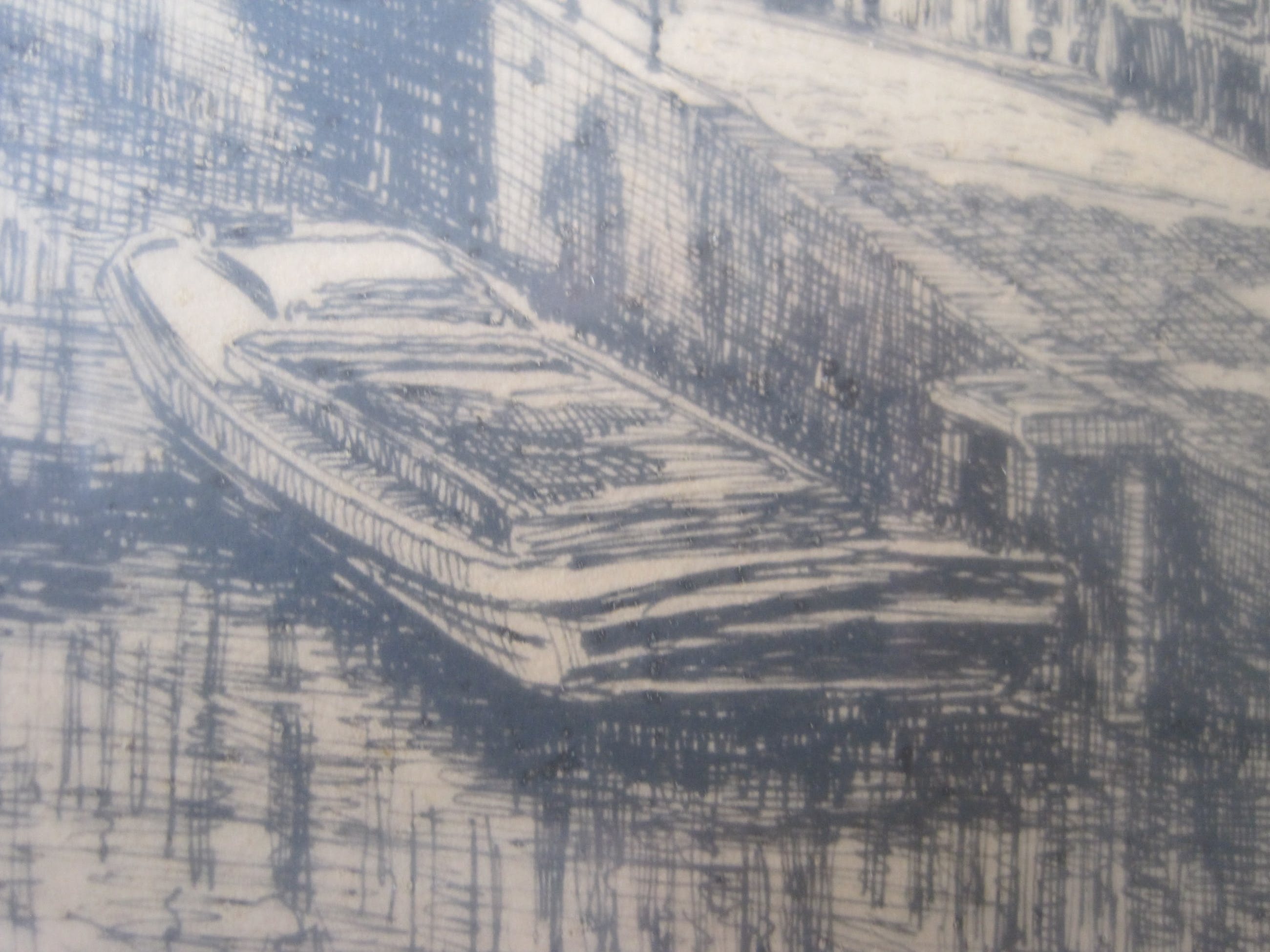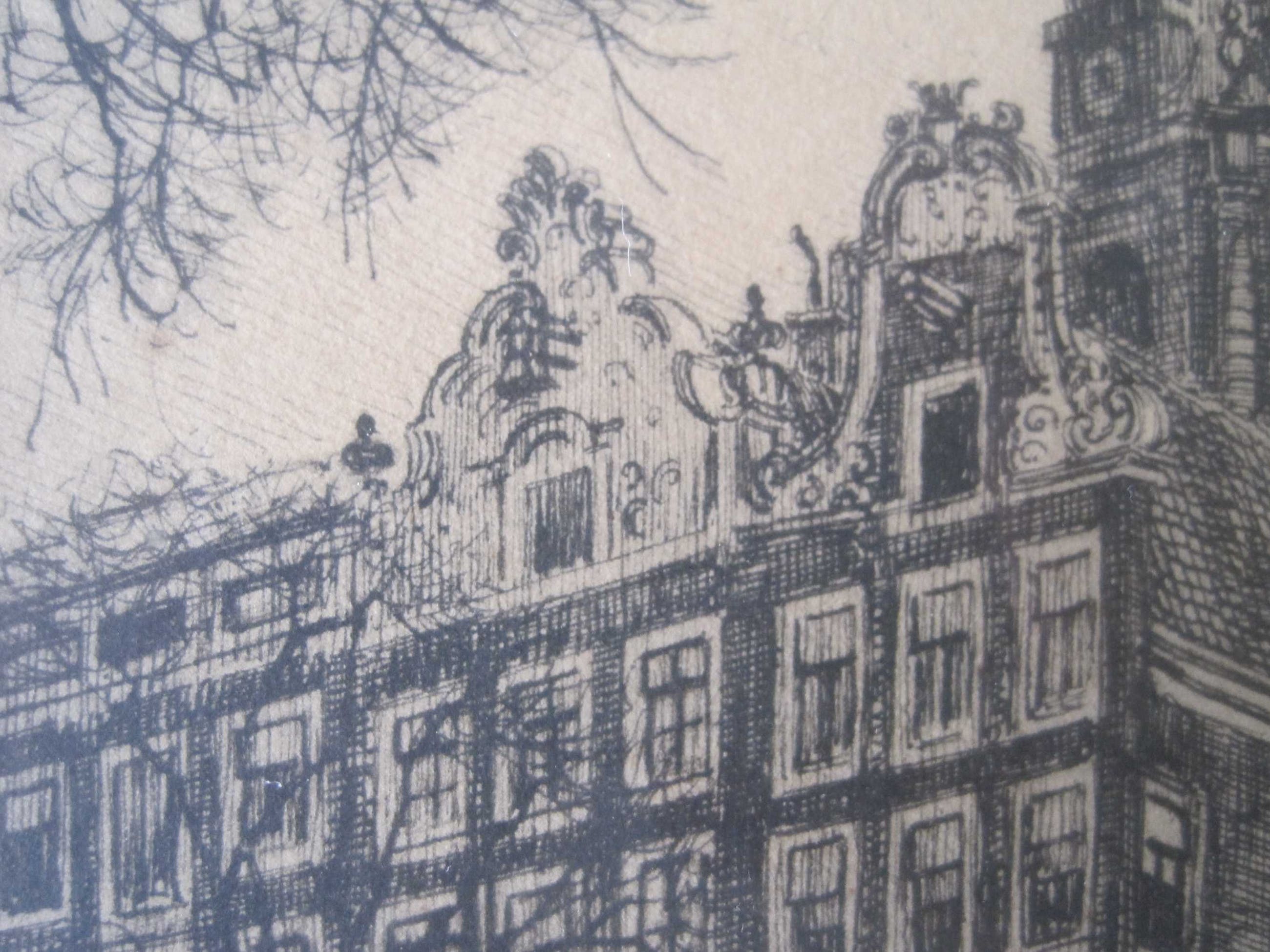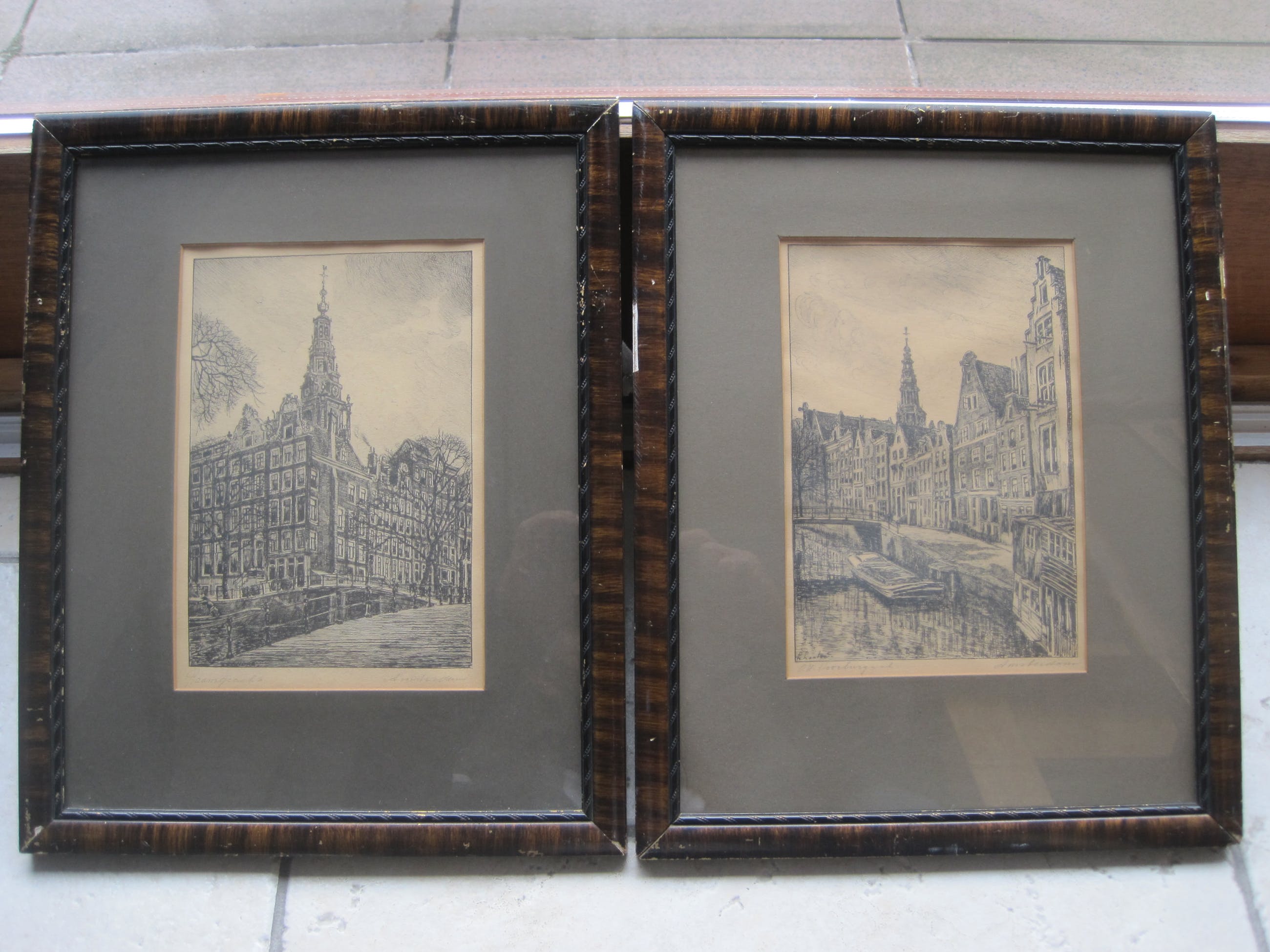 Deze tekeningen hebben als onderwerp de Raamgracht en de Oude Zijds Voorburgwal Naar mijn mening betreft het hier 2 pentekeningen en geen etsen. De moet van de afdruk van de ets ontbreekt namelijk. Om het helemaal zeker te weten zou ik de rug er uit moeten halen, wat ik niet zie zitten. De tekeningen zitten in de originele lijsten. De lijsten hebben behoorlijke gebruikssporen. De tekeningen zijn heel scherp., het papier is vergeeld.