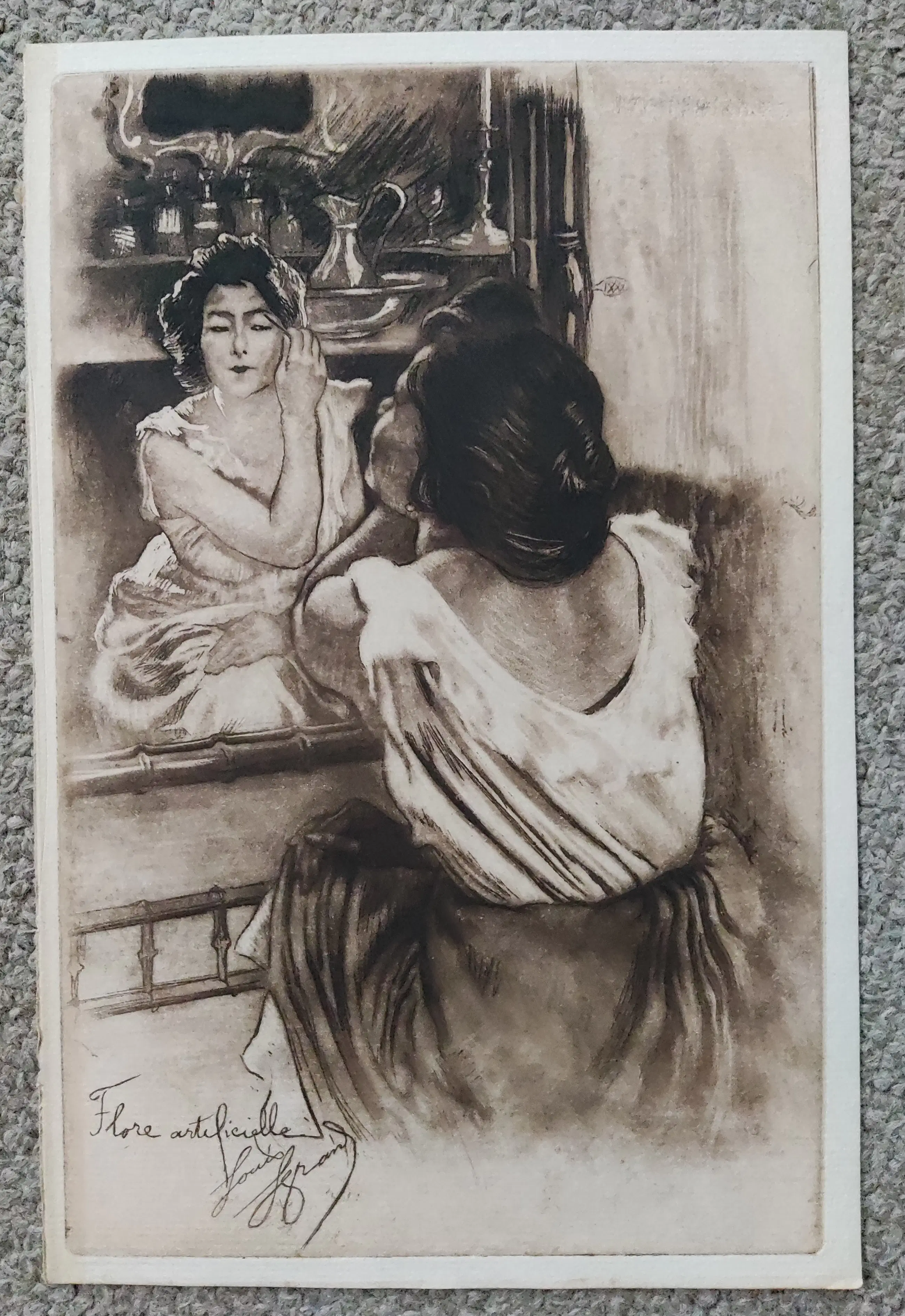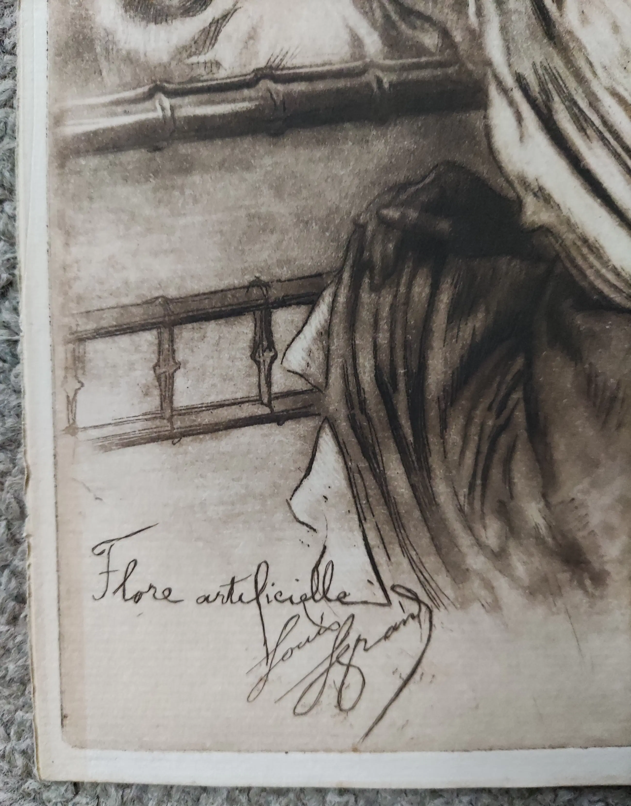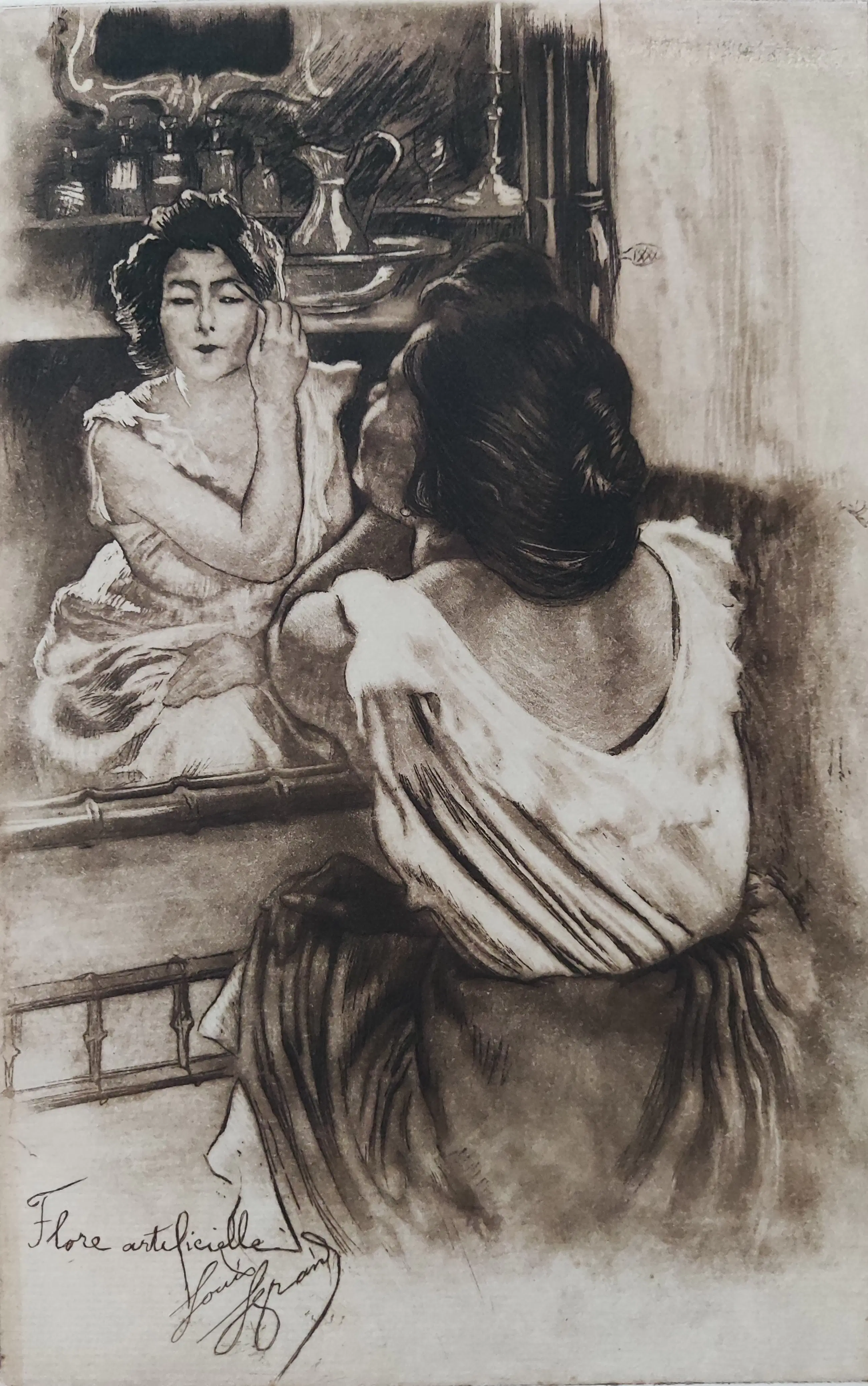In de plaat gesigneerd en getiteld linksonder. Beeldmaat 26x16,5 cm. Bladmaat 27,3x18 cm. Losbladig. Louis August Mathieu Legrand werd geboren te Dijon op 23 september 1863 en overleed te Livry-Gargan op 21 juni 1951. Opgeleid aan de Ecole des Beaux Arts te Dijon. Daar won hij in 1883 de Devosge prijs. In 1884 studie graveren o.l.v. Félicien Rops. Verkreeg in 1906 het Légion d'Honneur. Schilder en graficus van het Parijse sociale leven, zoals prostituees, dansers en bar scènes.