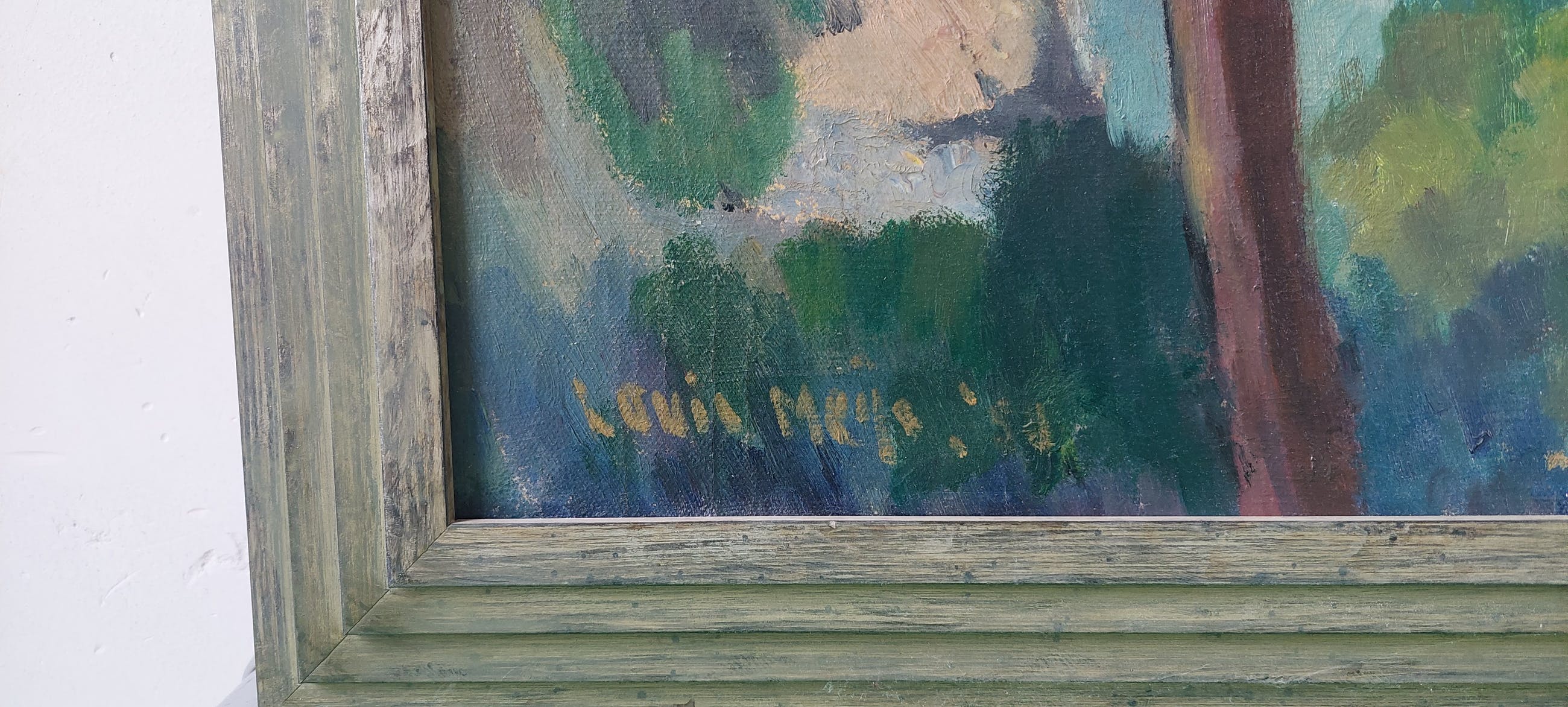 Ik vermoed dat het een voorstelling is van een Frans landschap, met op de voorgrond heuvels met begroeiing, en zich op een nederzetting aan water. Ik vind het lastig om het jaartal goed te lezen, maar het meest waarschijnlijk is 1964.