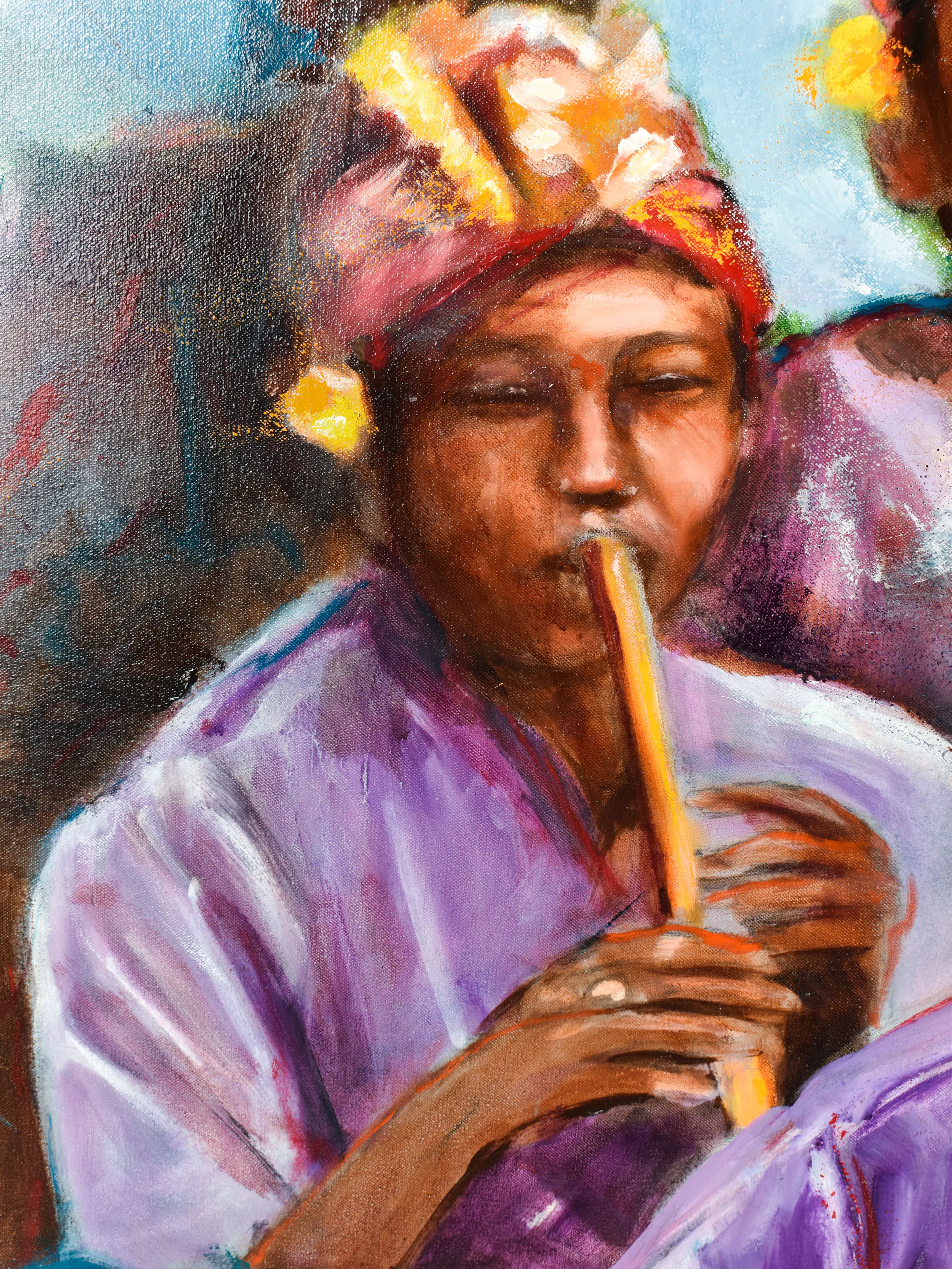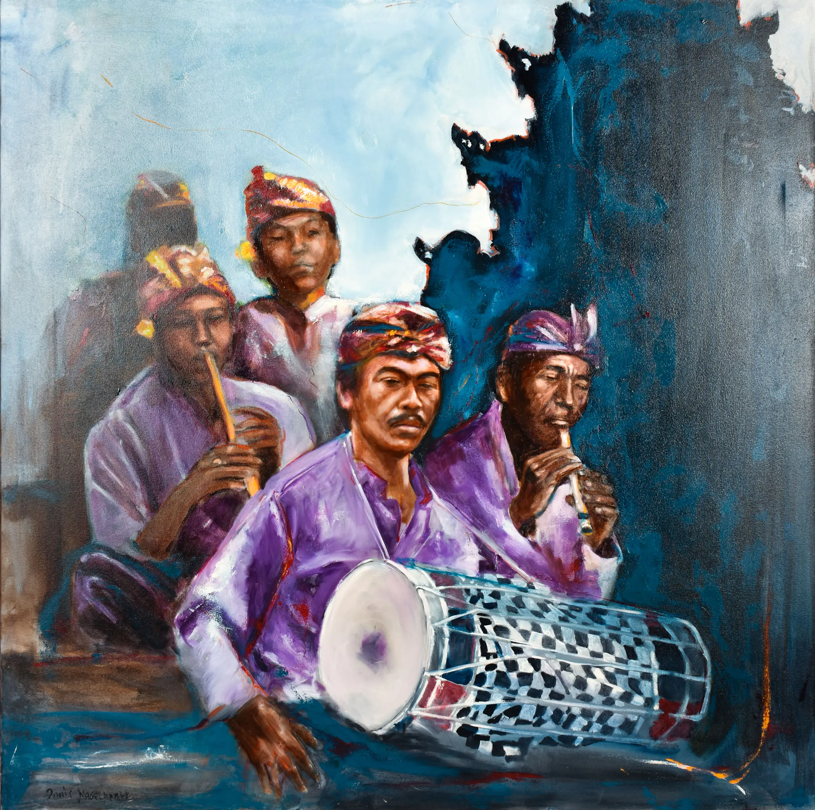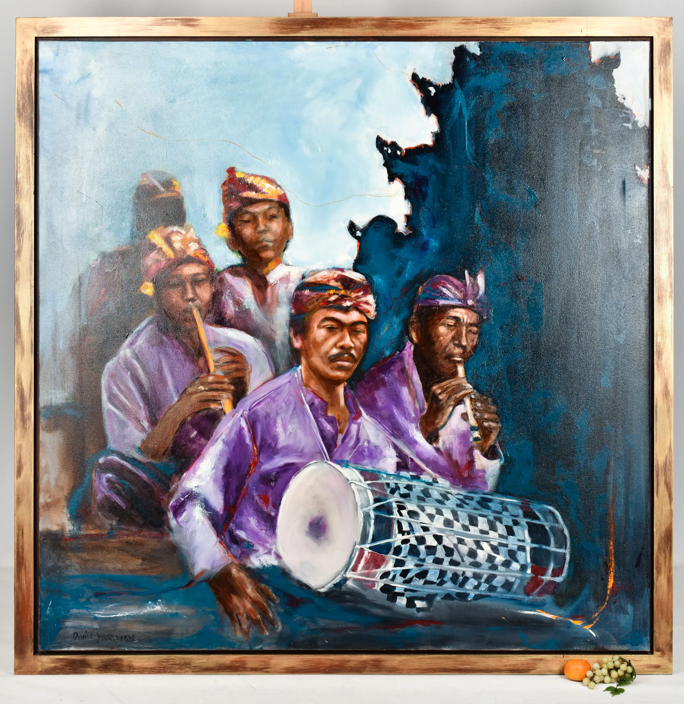 Dit schilderij van Louis Nagelkerke is een imposant werk dat een muzikaal gezelschap tot leven brengt. De compositie straalt ritme en harmonie uit — je hoort de muziek bijna weerklinken. Het grote formaat en de fraaie lijst versterken de aanwezigheid van het werk en maken het tot een echte blikvanger.