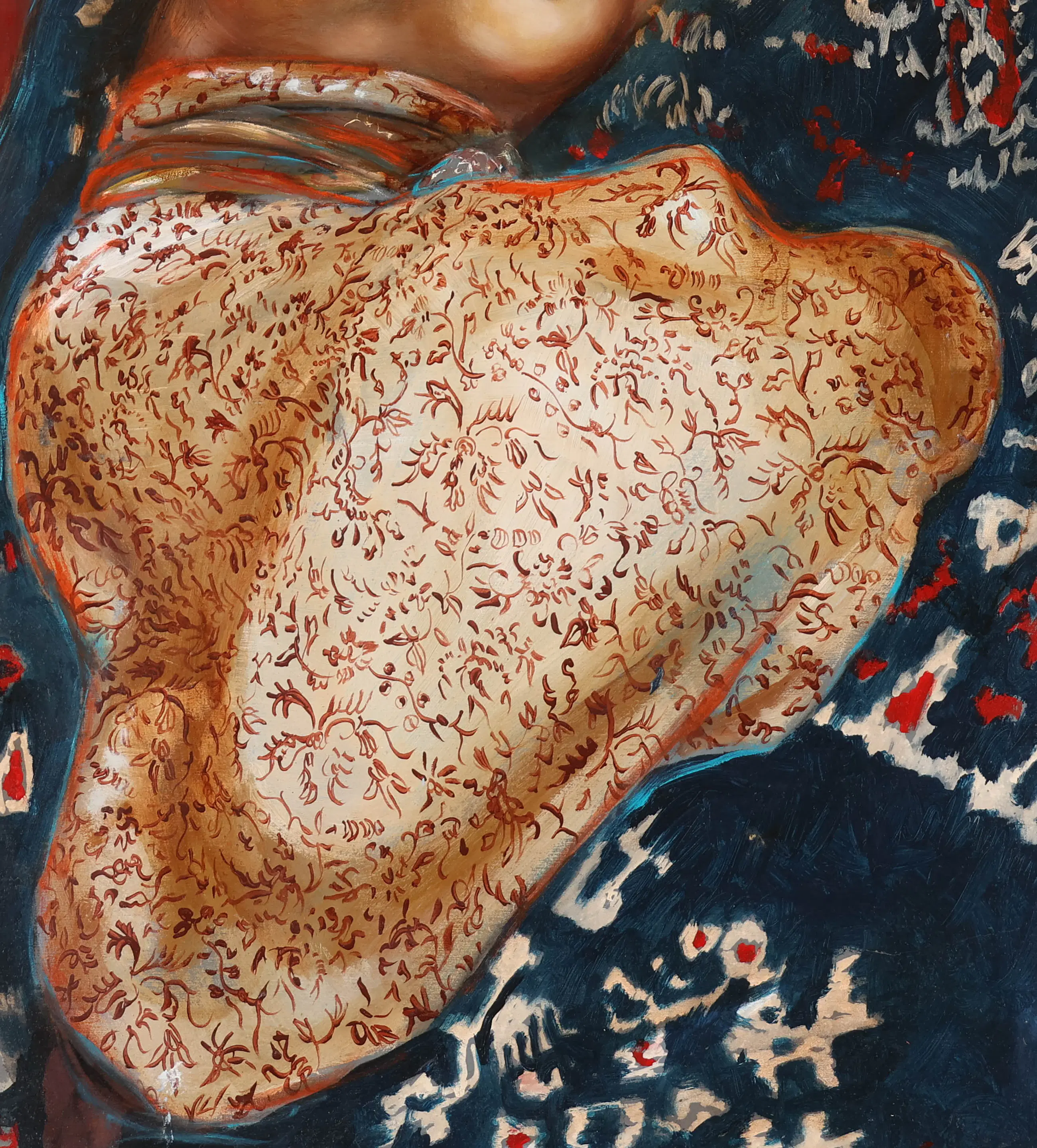 Dit schilderij toont een naakte vrouw die in een ontspannen houding ligt, met haar armen boven haar hoofd gevouwen en de ogen gesloten. De vrouw ligt op een rijkelijk bewerkt textiel, dat doet denken aan Oosterse patronen, wat een directe verwijzing vormt naar de fascinatie van Nagelkerke voor de Indonesische en Balinese cultuur.