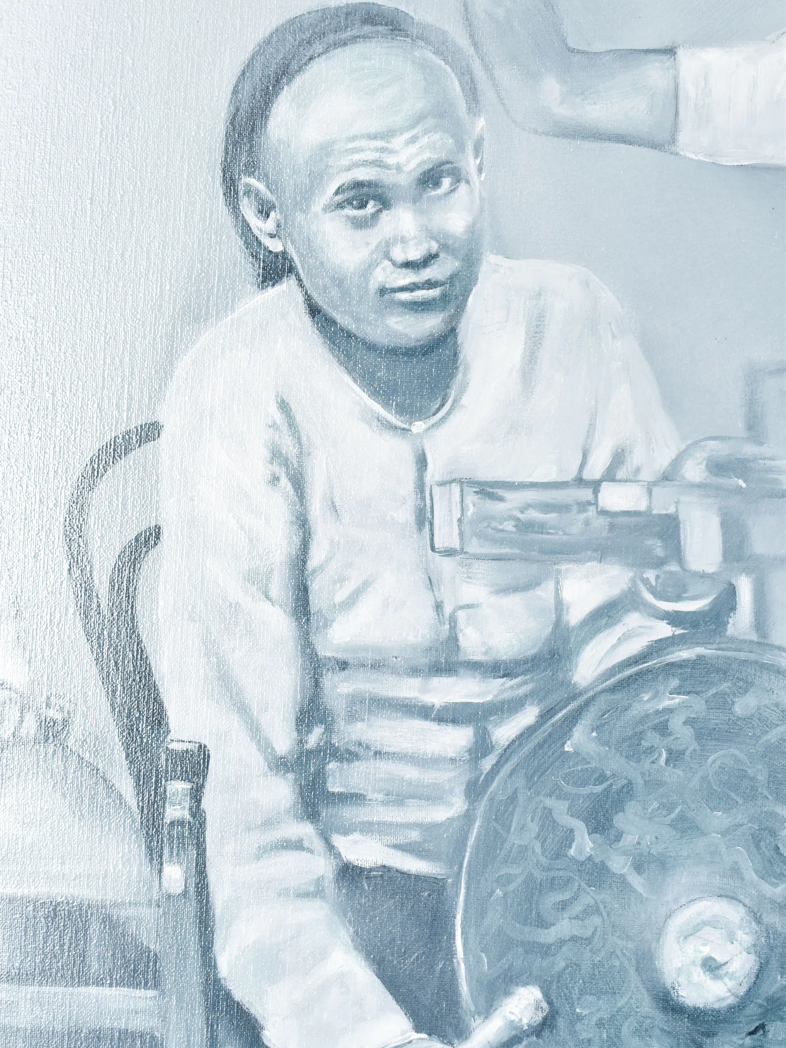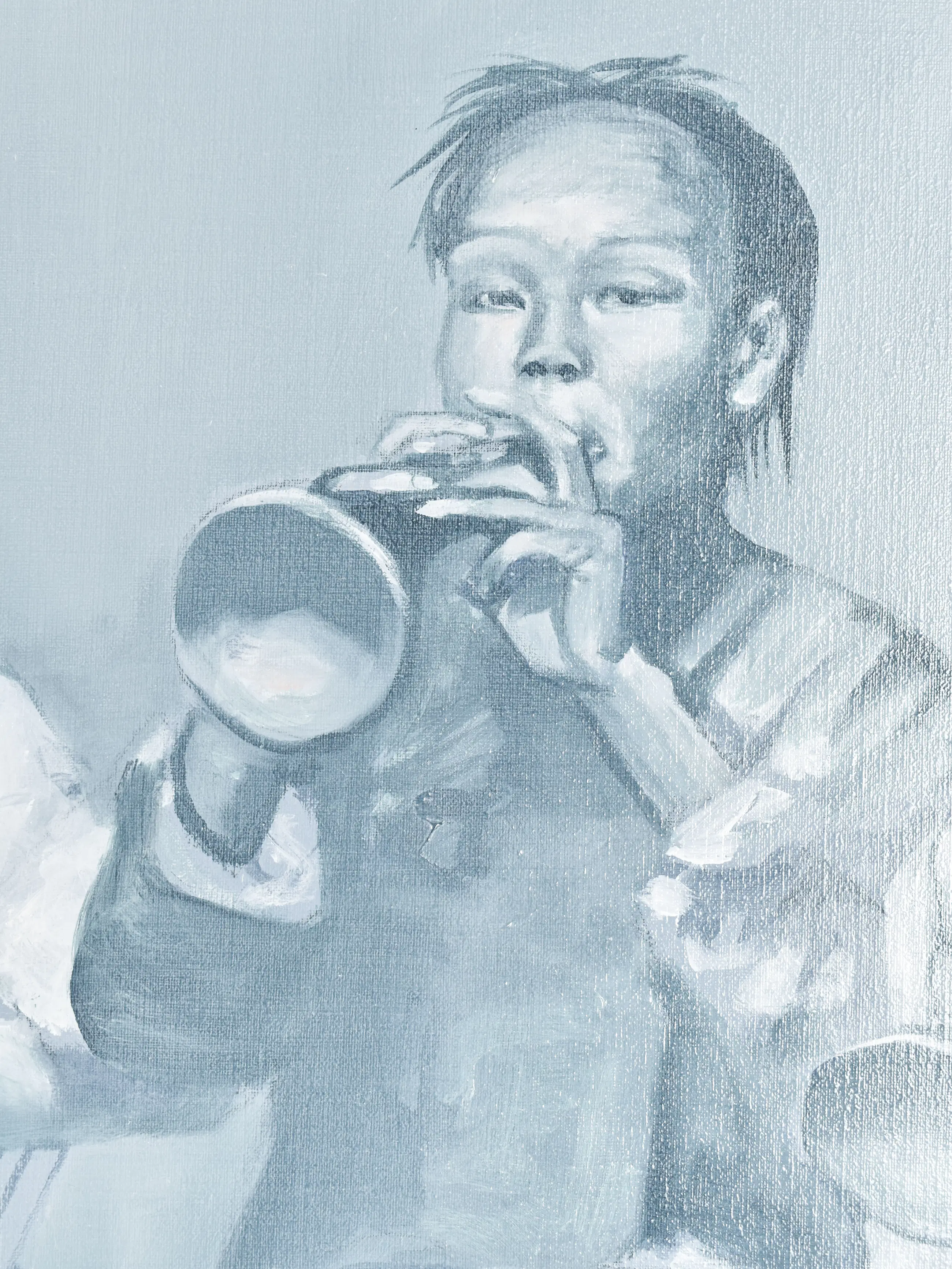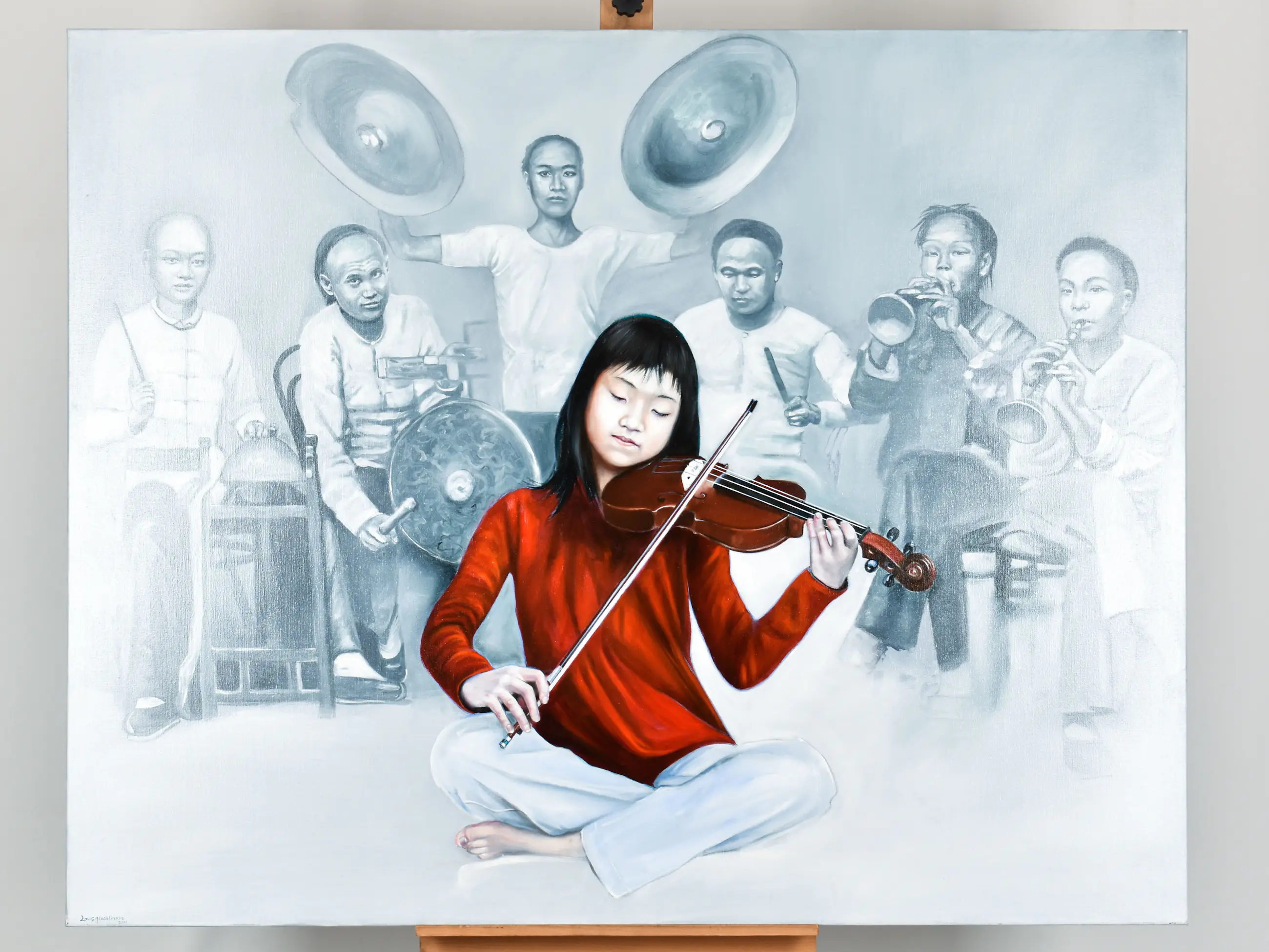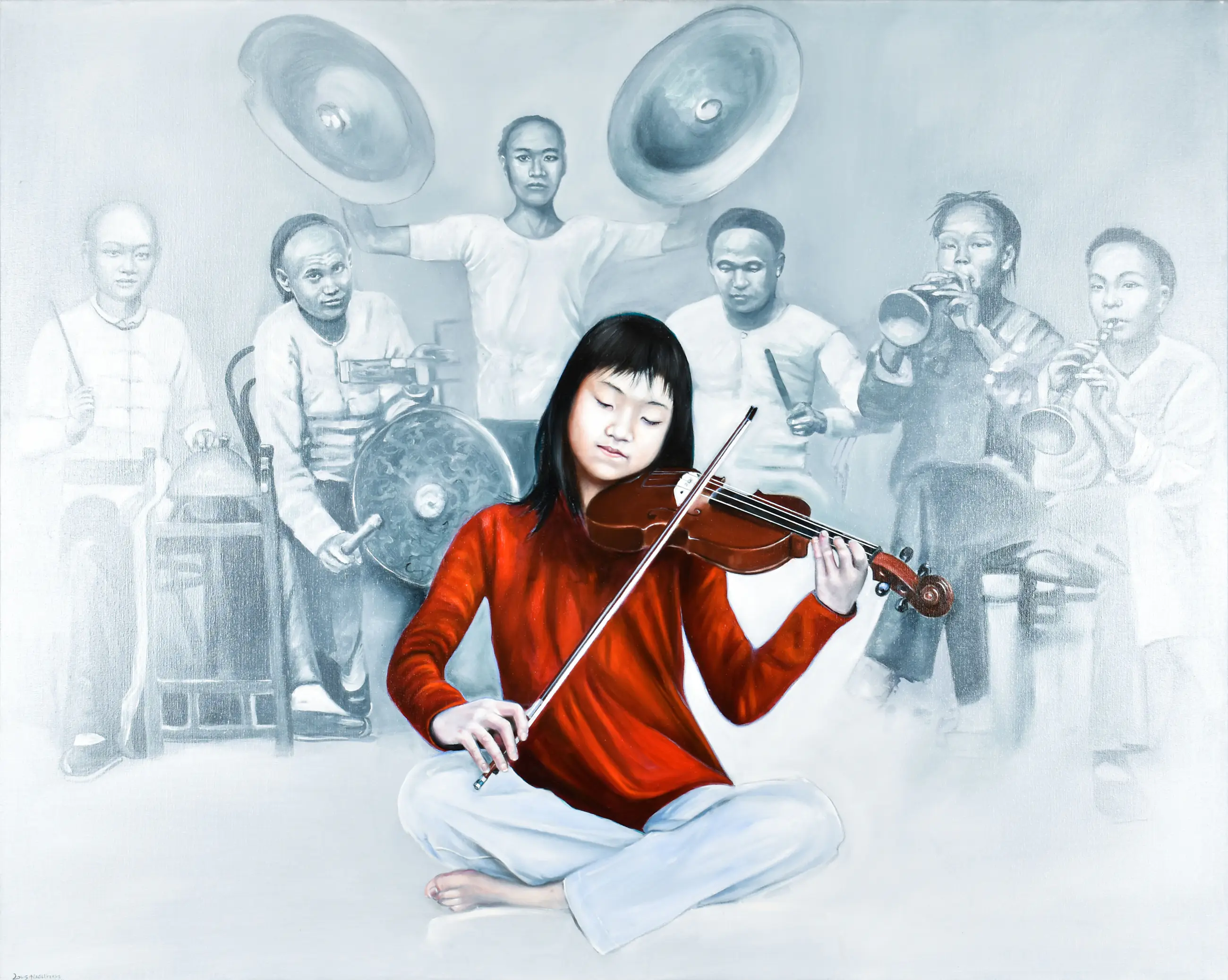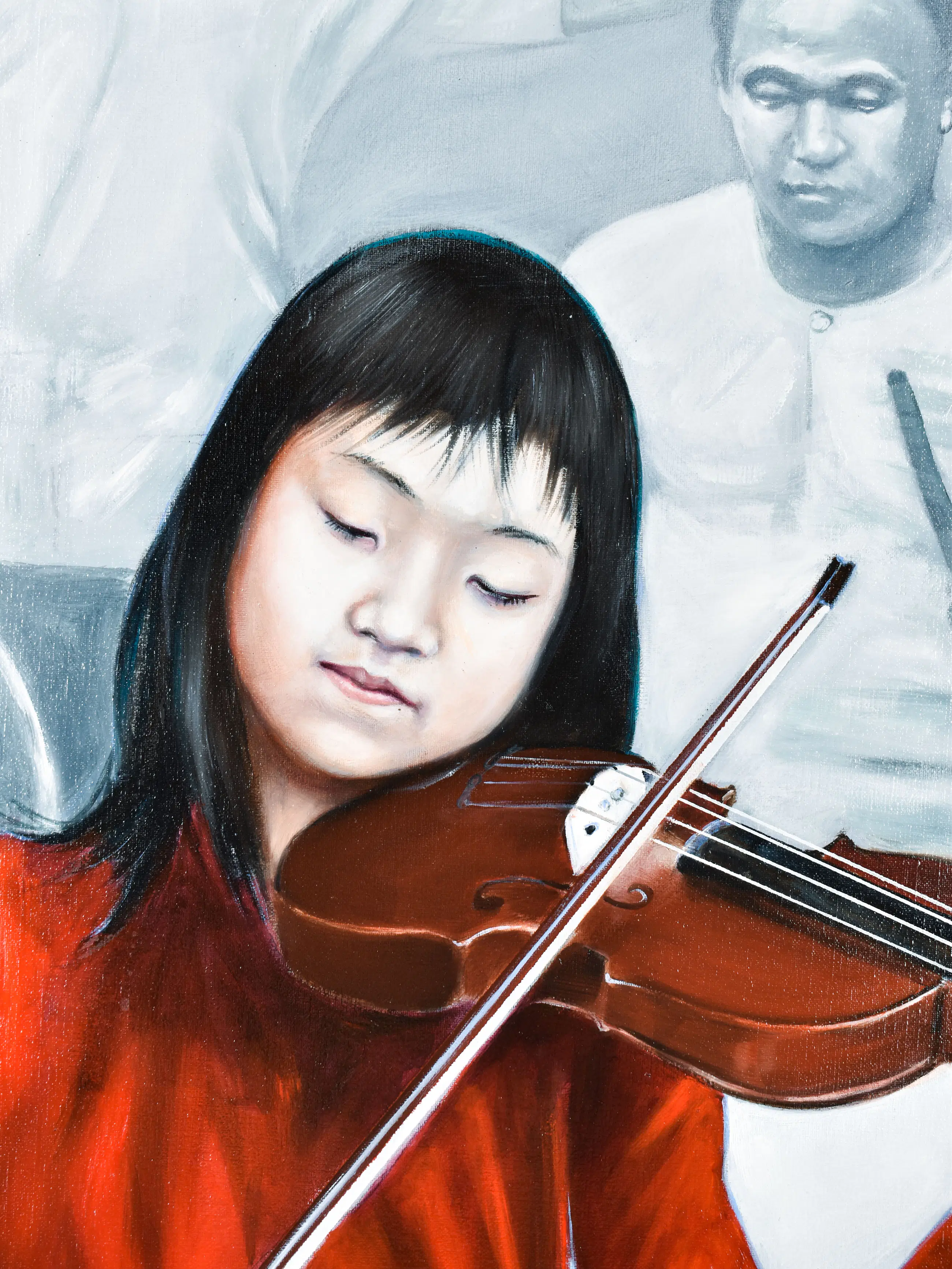 Dit muzikale werk toont op ingetogen wijze een meisje dat viool speelt. Ondanks het grote formaat straalt het schilderij rust en concentratie uit. De kunstenaar weet met subtiele lijnen en zachte kleurtonen de harmonie tussen muziek, emotie en stilte prachtig vast te leggen.