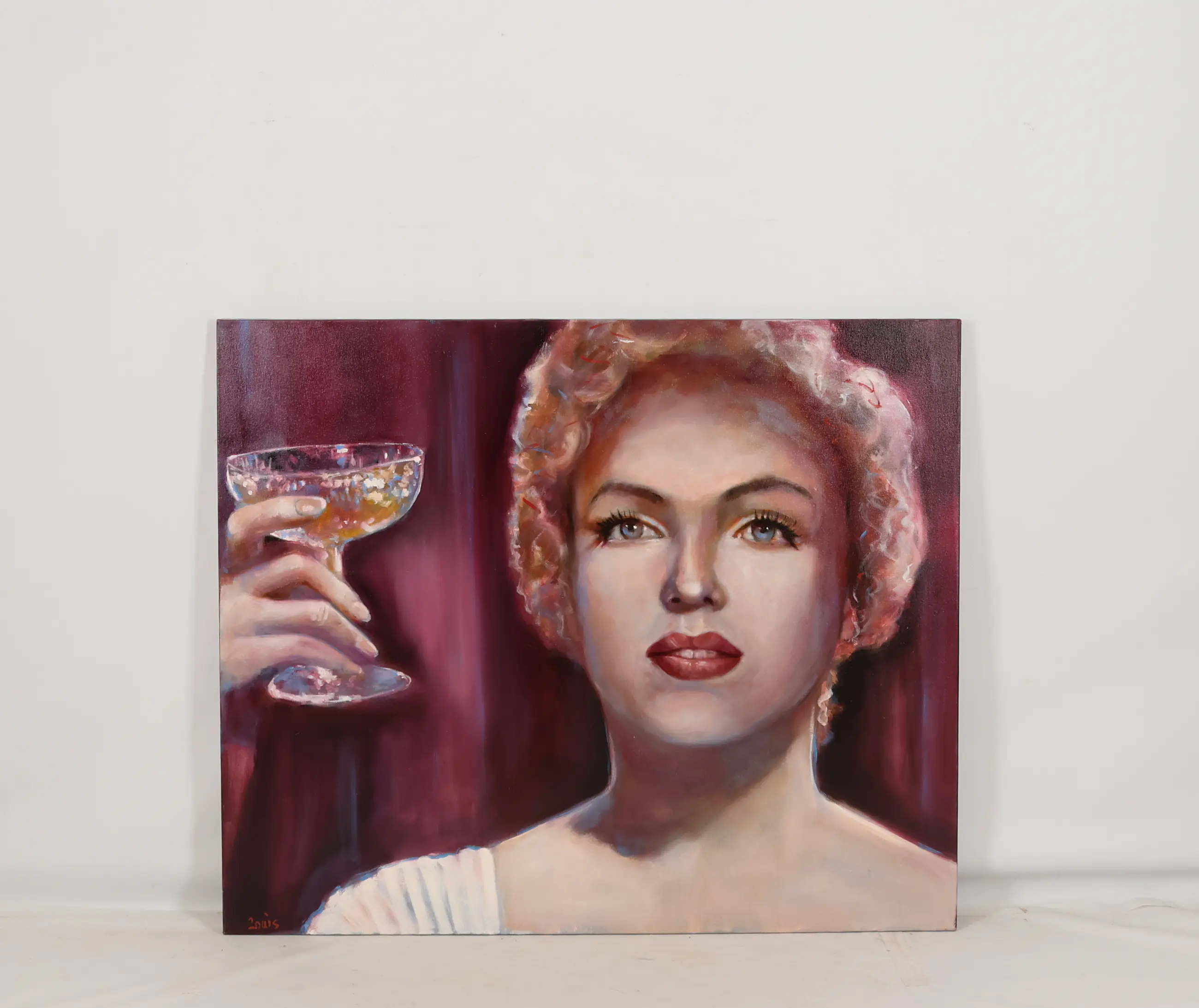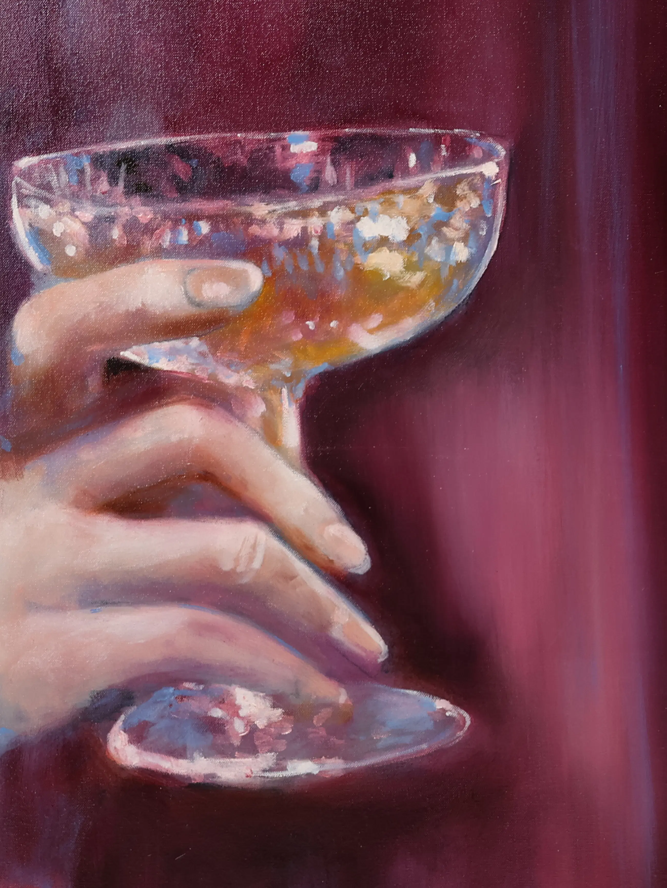 Dit schilderij beeldt een proostende vrouw af. De details van het licht dat in het glas valt zijn subtiel en verfijnd weergegeven. Haar ogen zijn helder en zorgvuldig neergezet, waardoor de uitdrukking een bijzondere levendigheid krijgt.