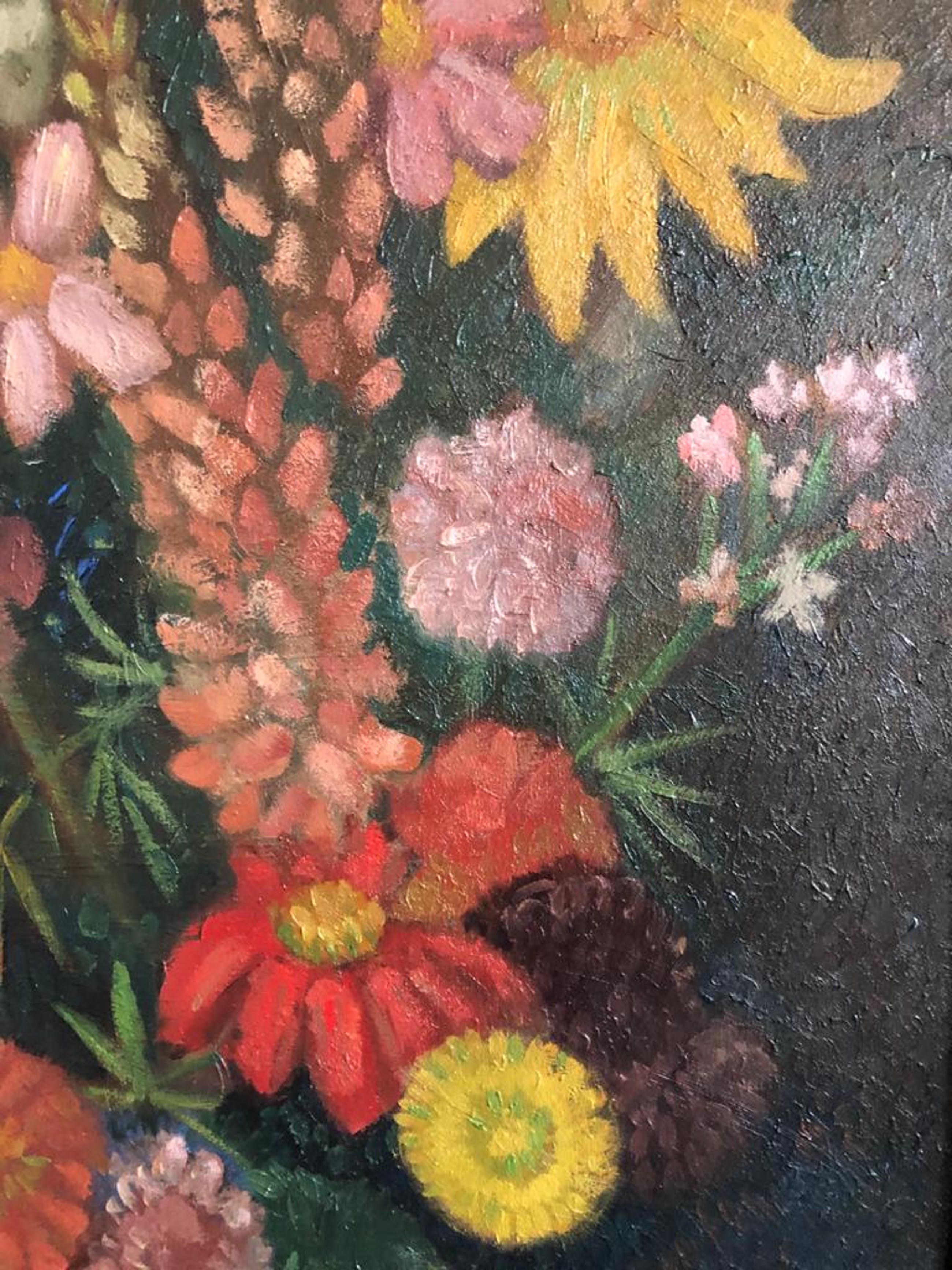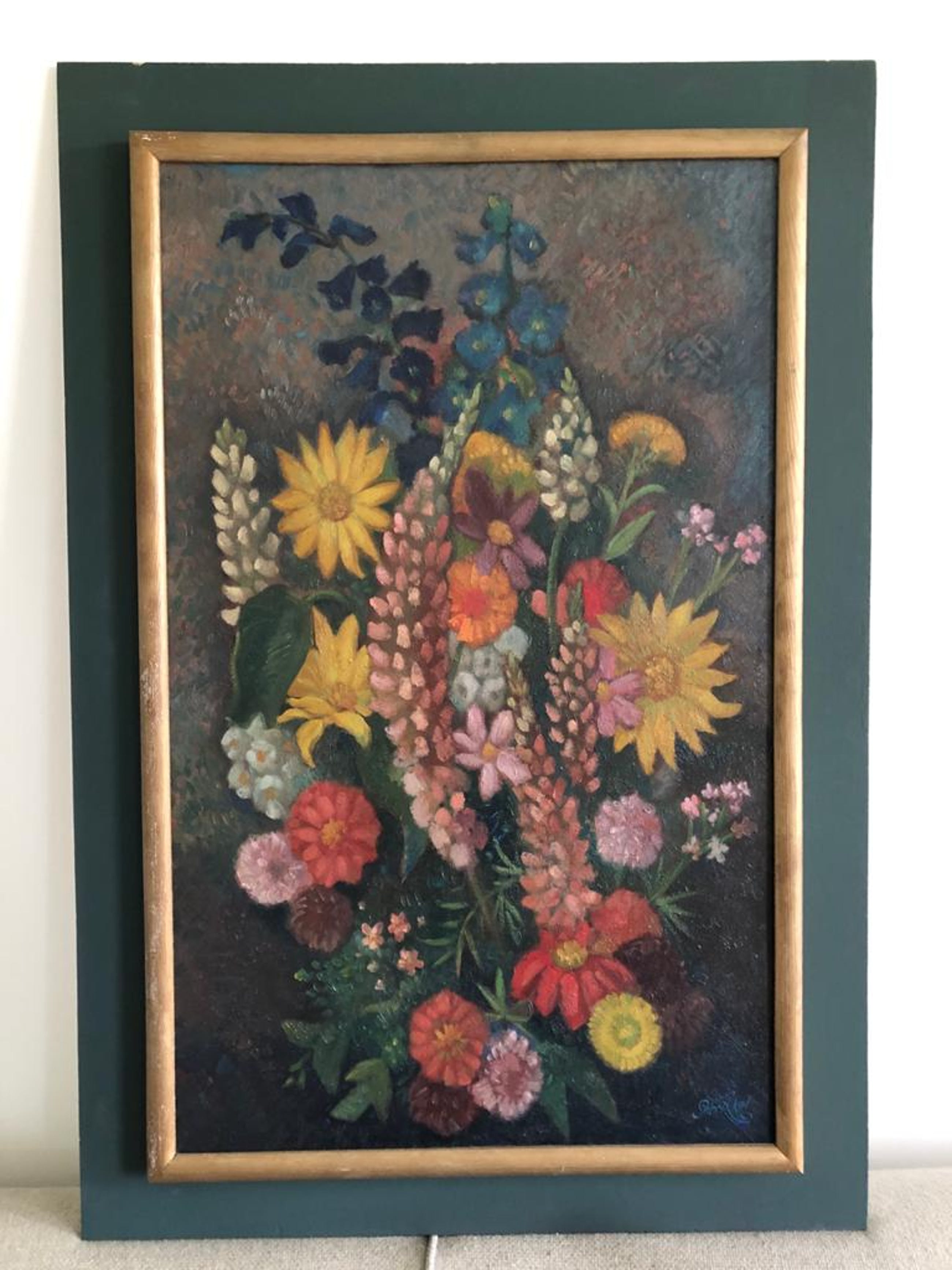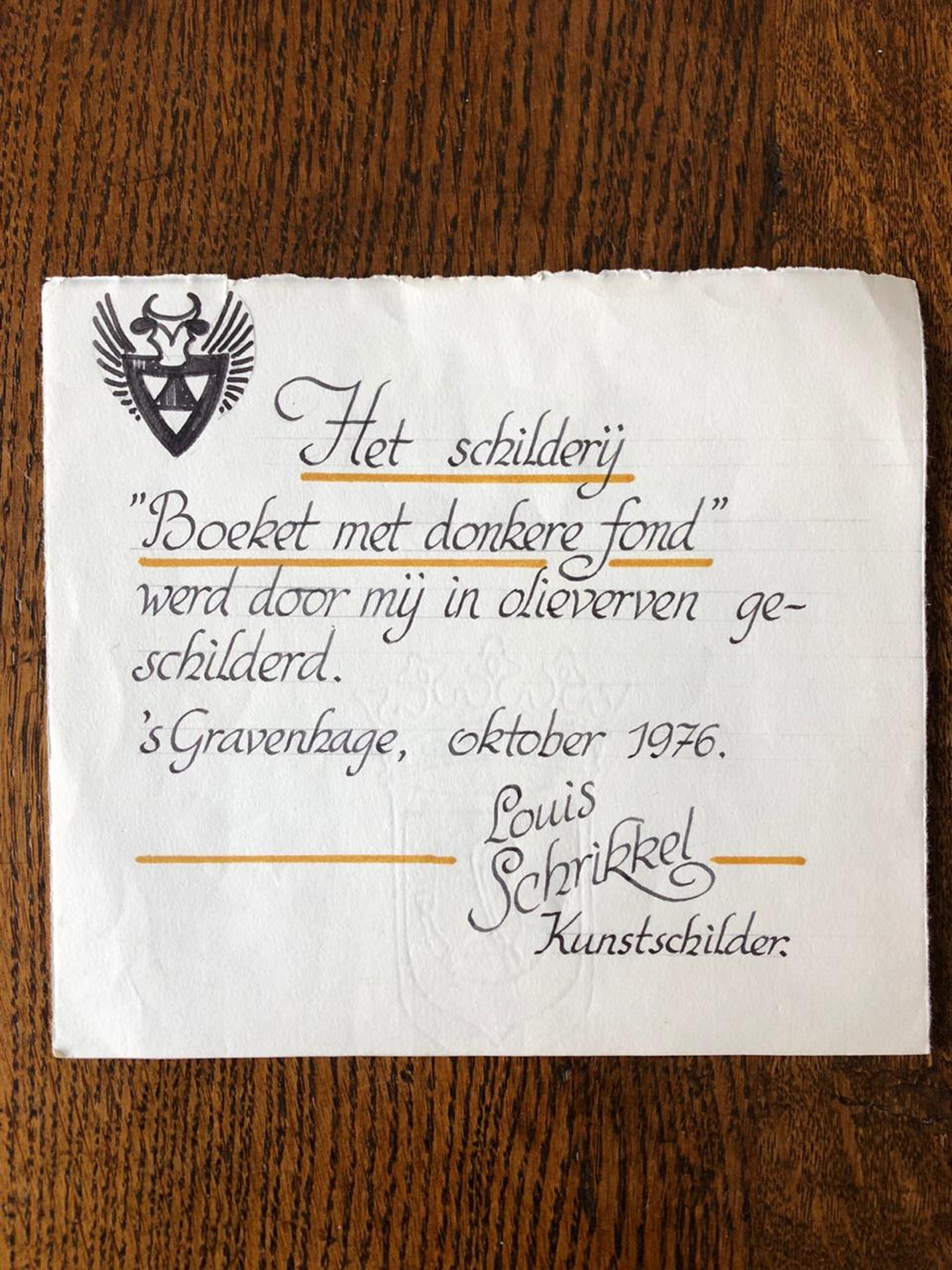Origineel schilderwerk "Boeket met donkere fond" van Louis Schrikkel. Vervaardigd en aangekocht in Oktober 1976 van Louis Schrikkel zelf te 's Gravenhage. Olieverf op paneel met lijst.