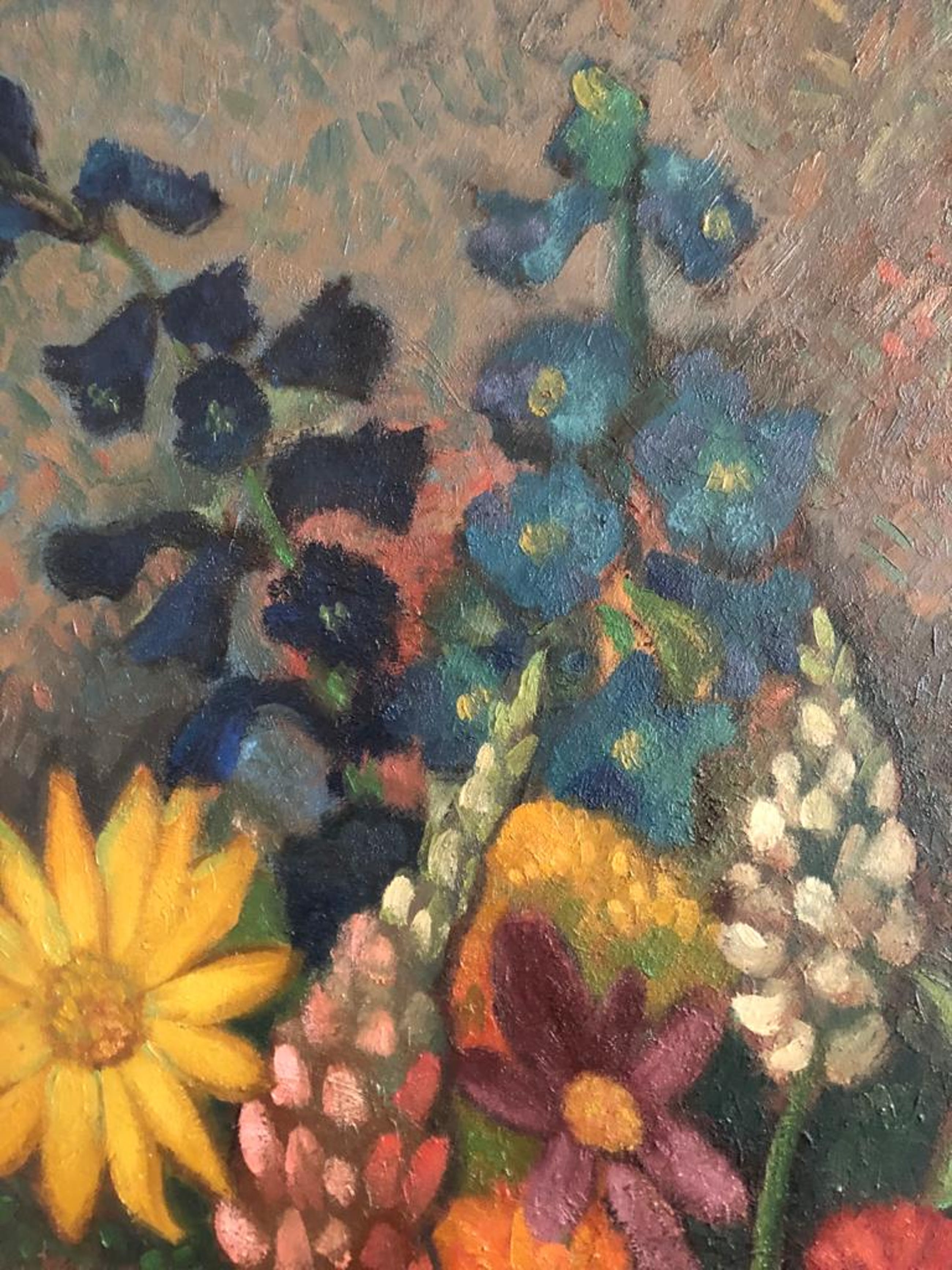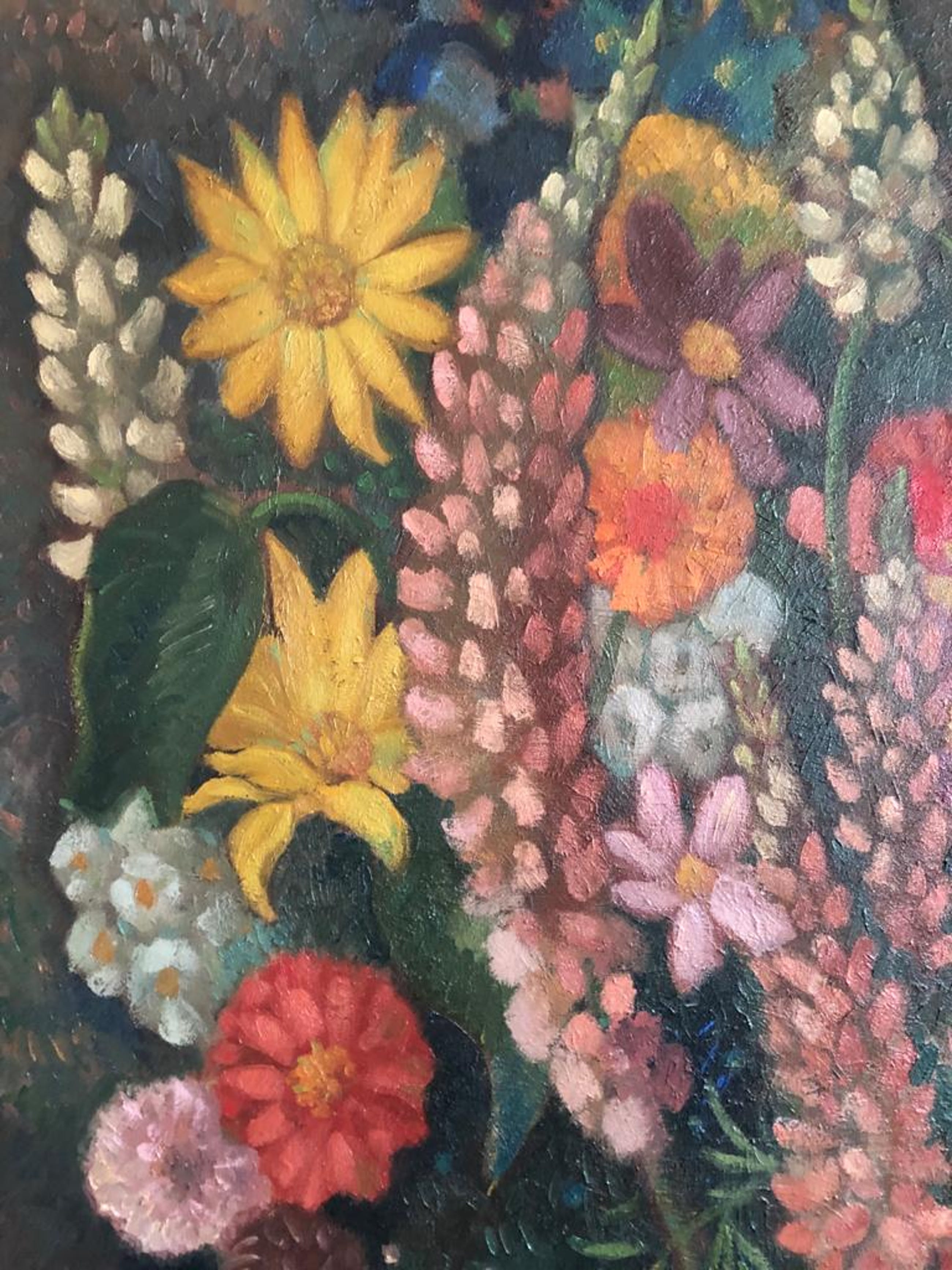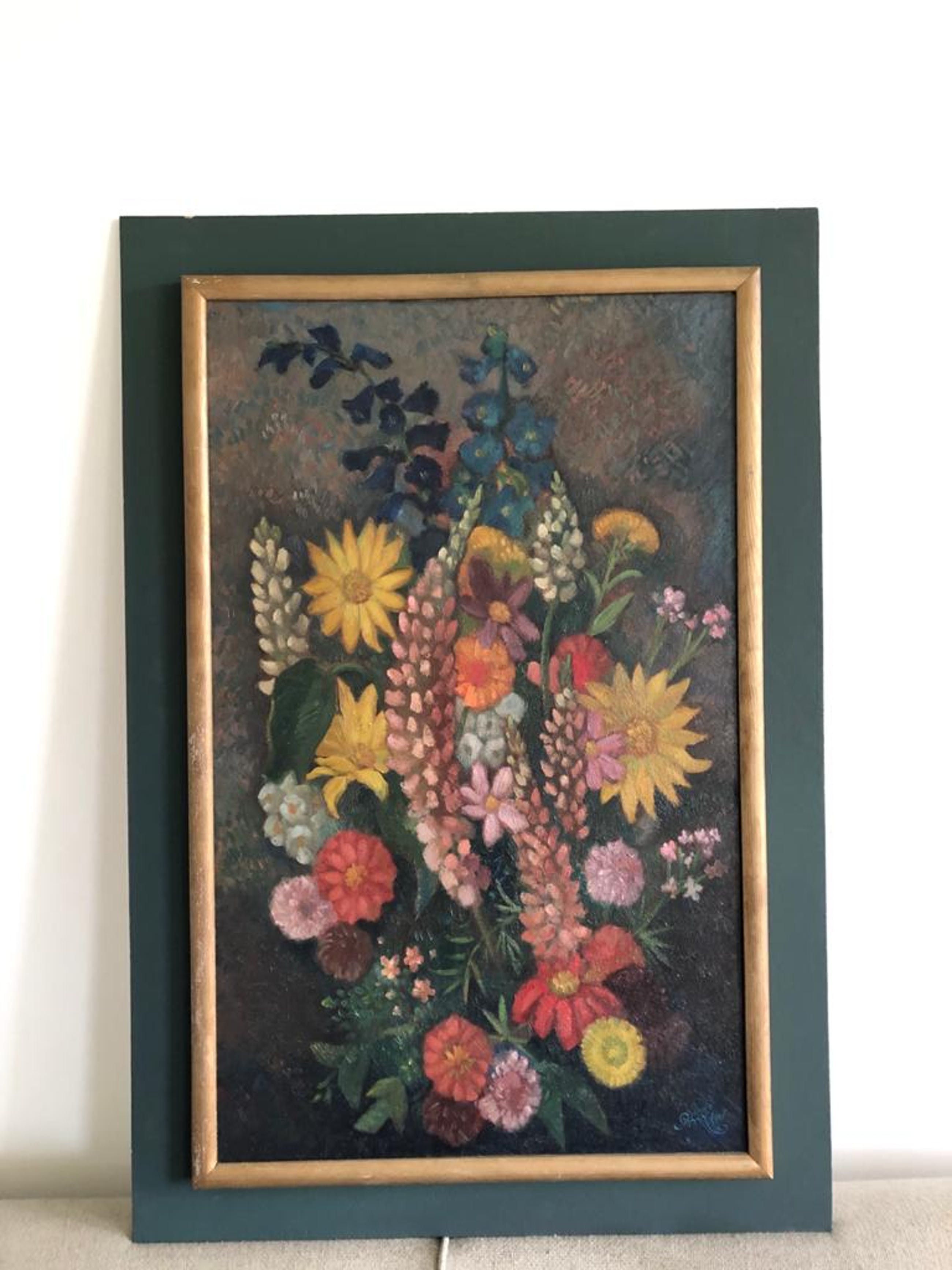 Origineel schilderwerk "Boeket met donkere fond" van Louis Schrikkel. Vervaardigd en aangekocht in Oktober 1976 van Louis Schrikkel zelf te 's Gravenhage. Olieverf op paneel met lijst.