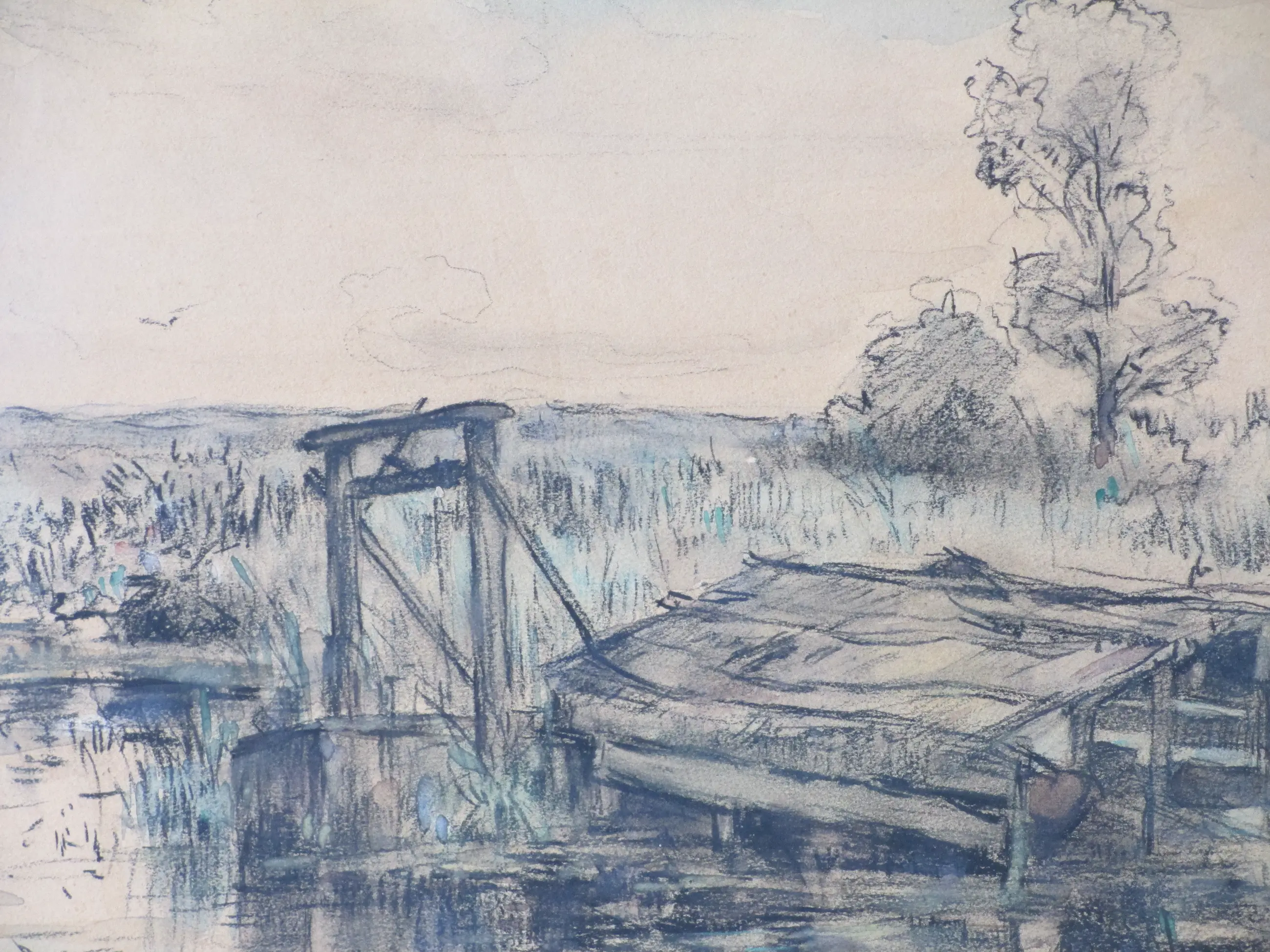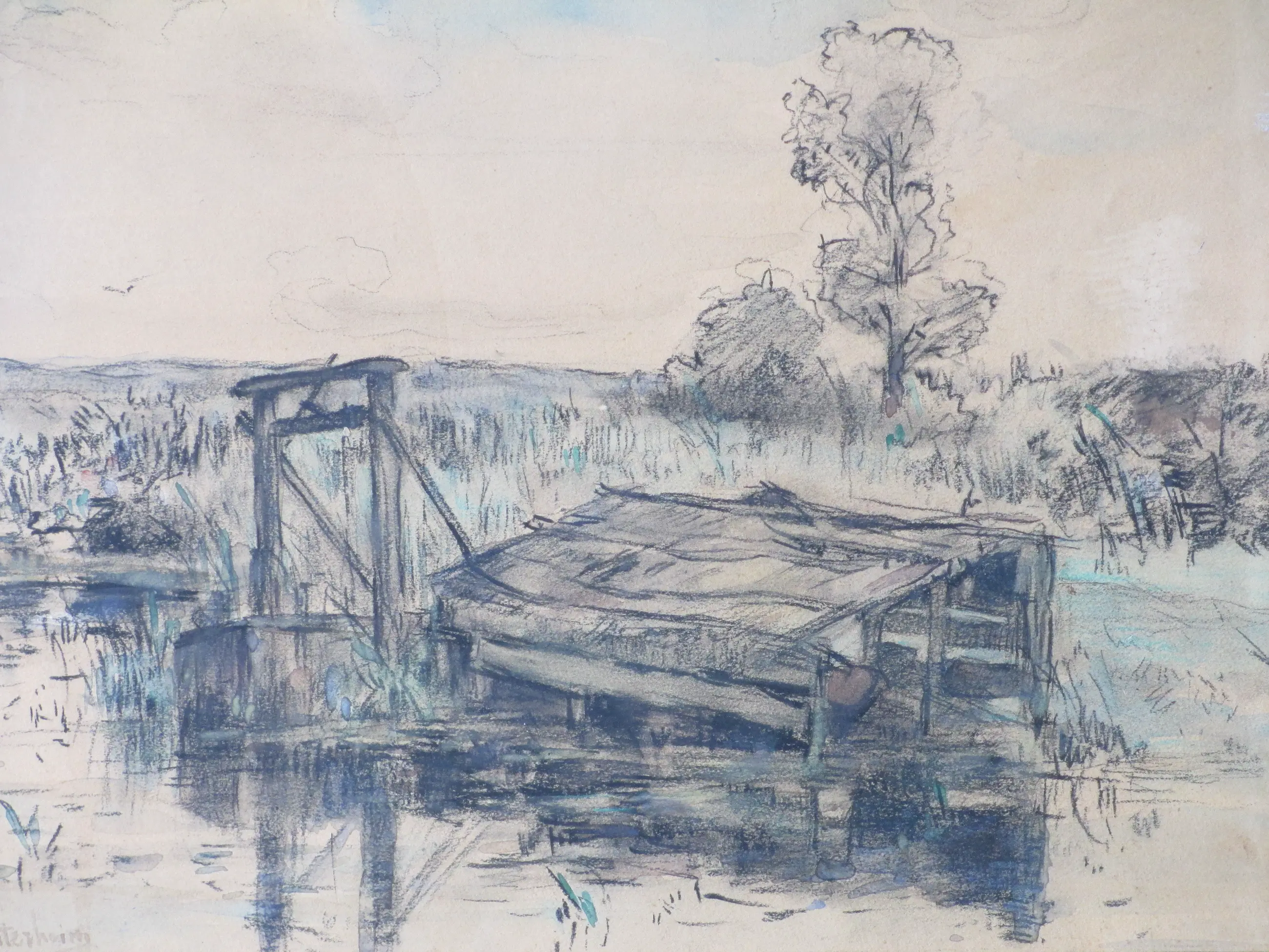 Gemengde techniek door Louis Stutterheim Voorstelling van een steiger en boothuis in een waterlandschap Werk onder passepartout, beeldmaat 25x34, p.p.maat 38x45 Gesigneerd l.o.: 'L Stutterheim' Authenticiteit volledig gegarandeerd